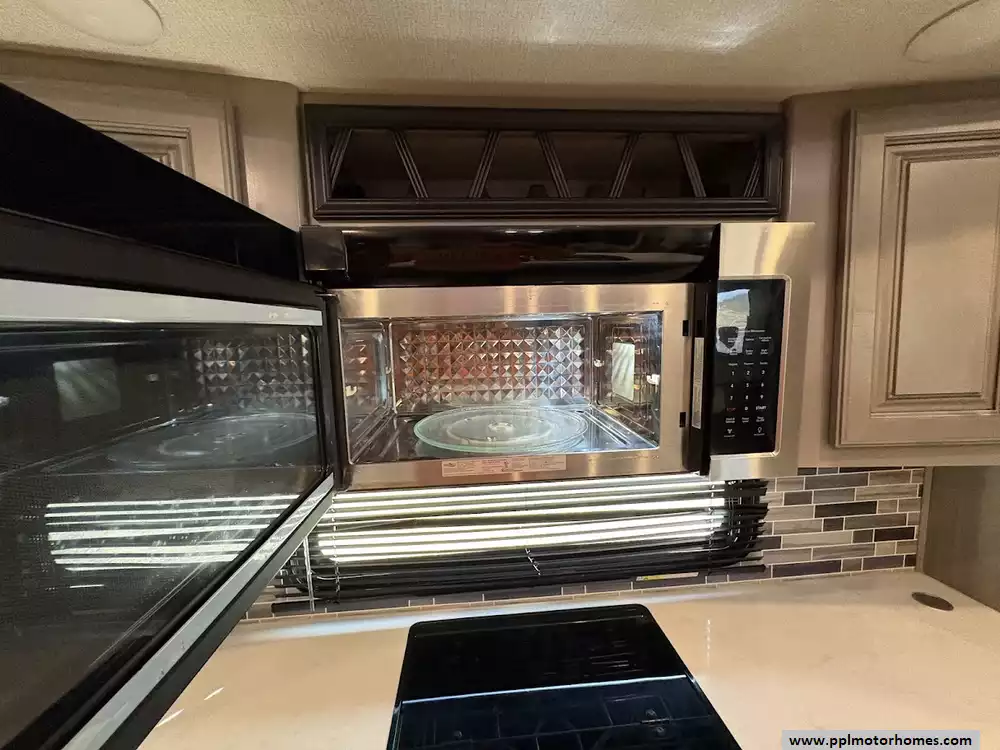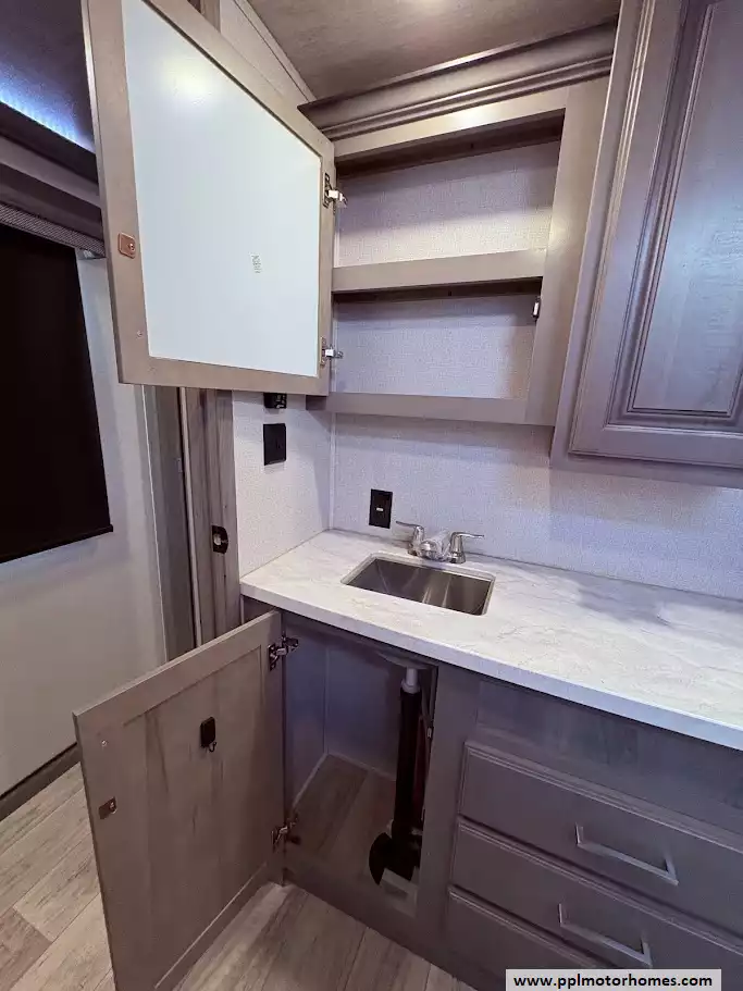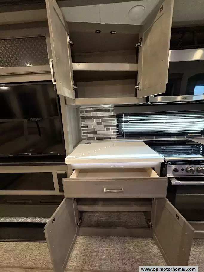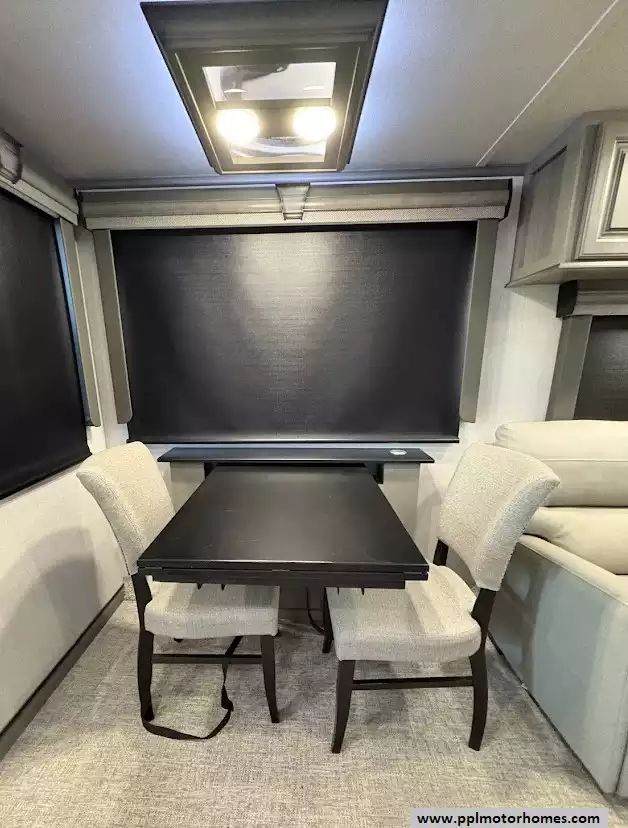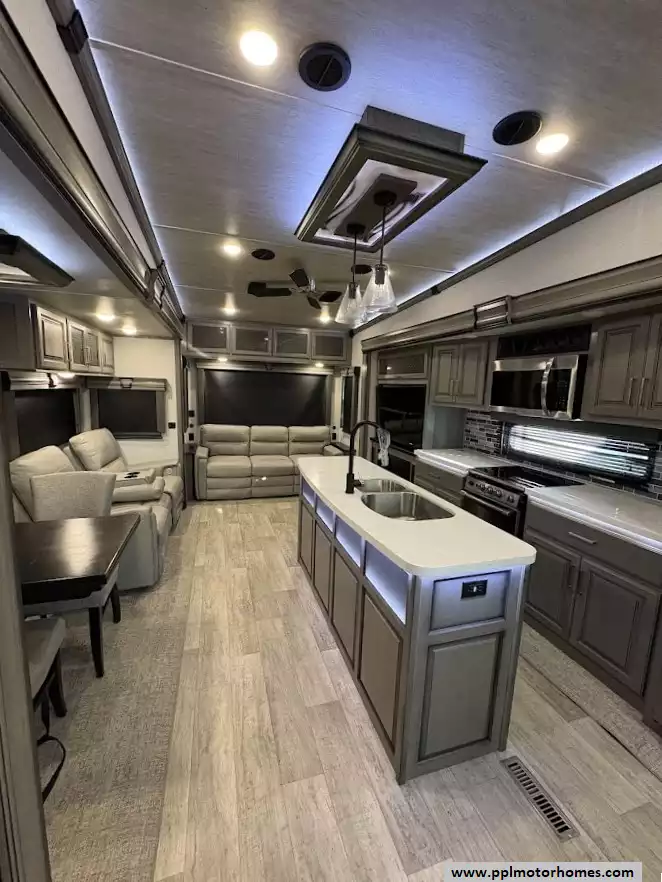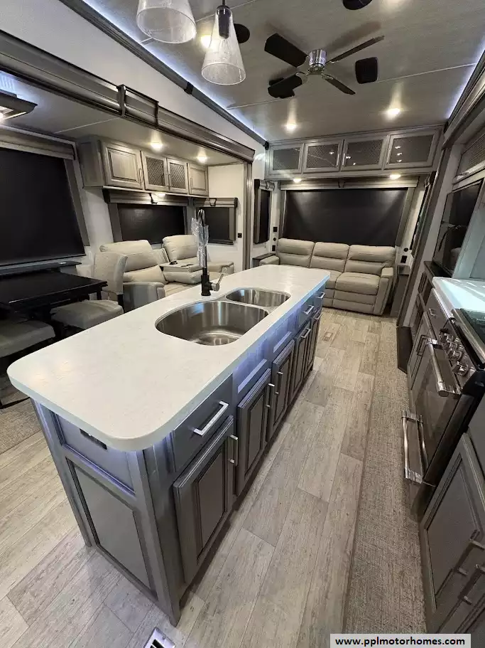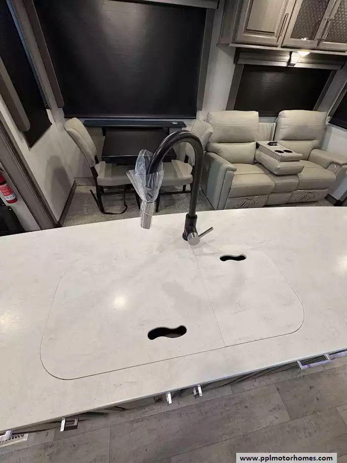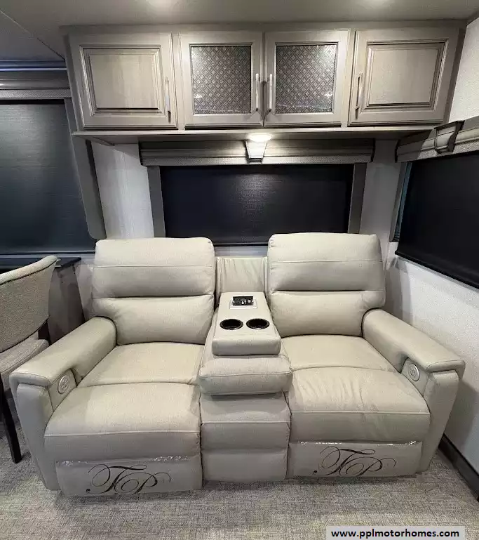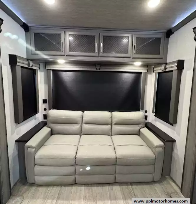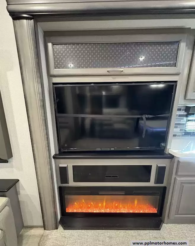 The back of the RV is dedicated to the main living space, made exceptionally large by two opposing slide-outs. This area includes comfortable power theater seating and a tri-fold hide-a-bed sofa which can sleep two additional people. An entertainment center with a TV and an electric fireplace is situated at the very rear.