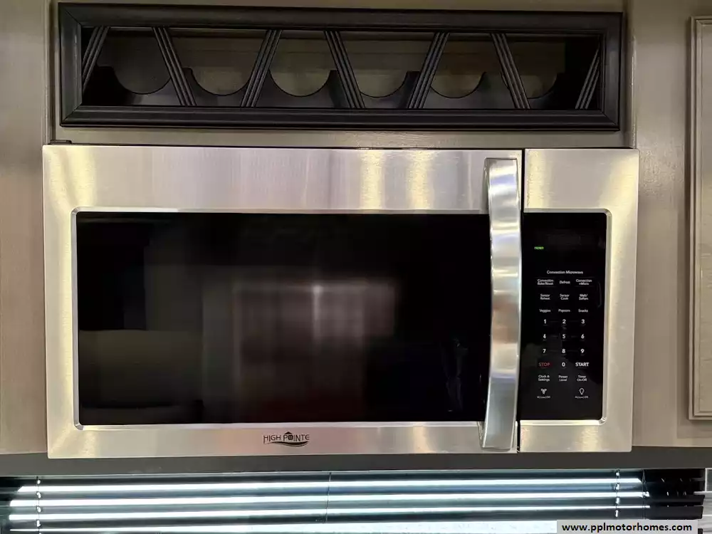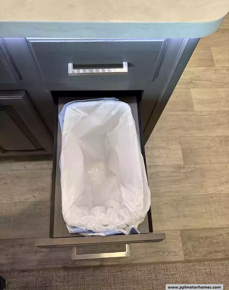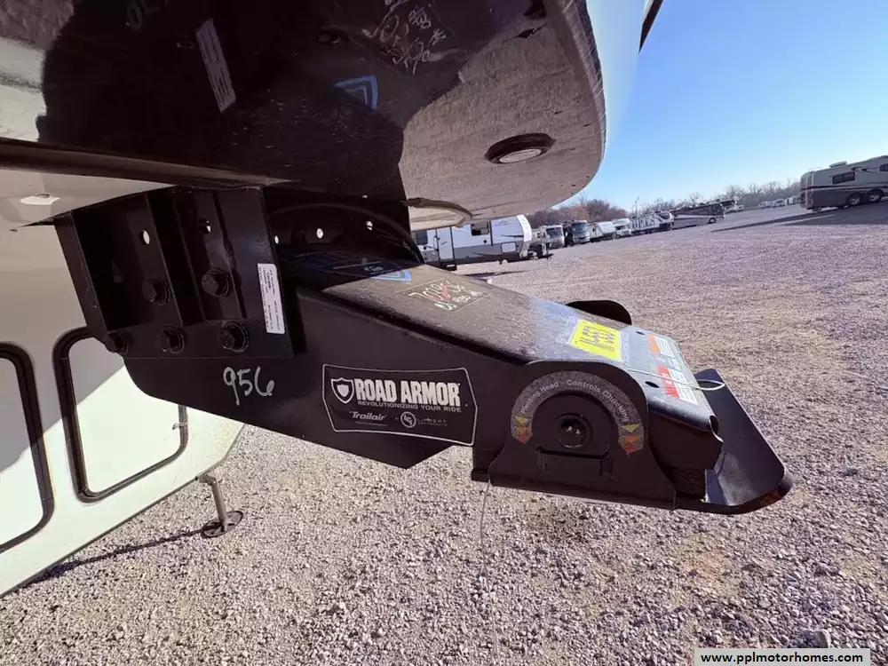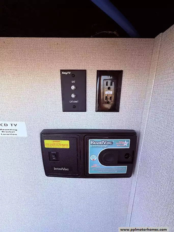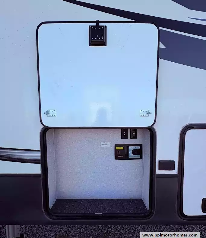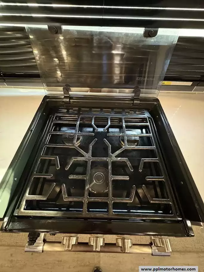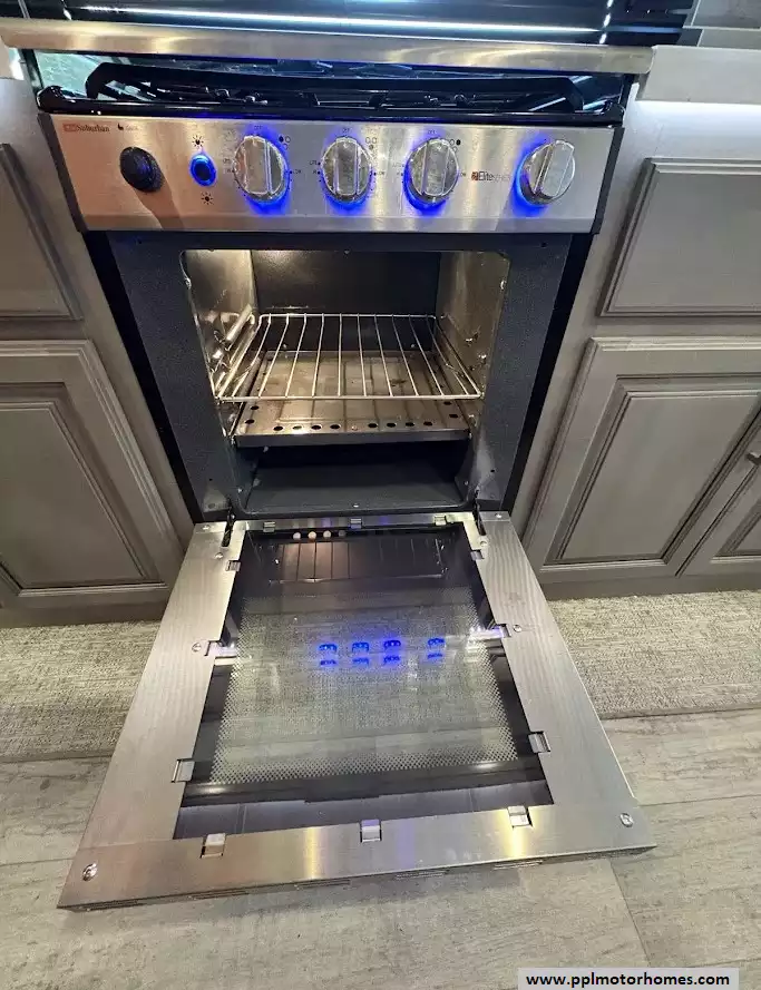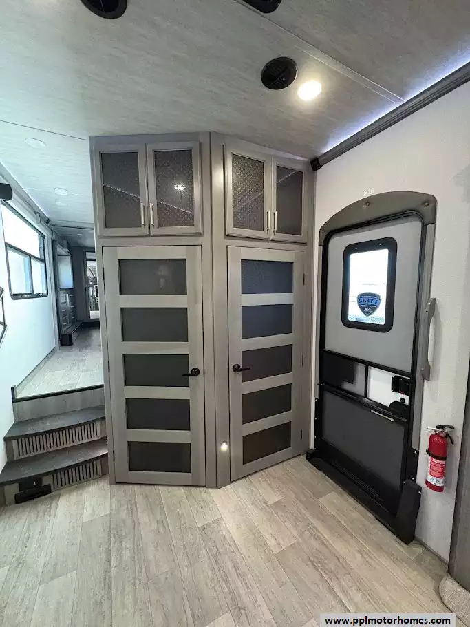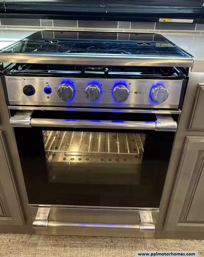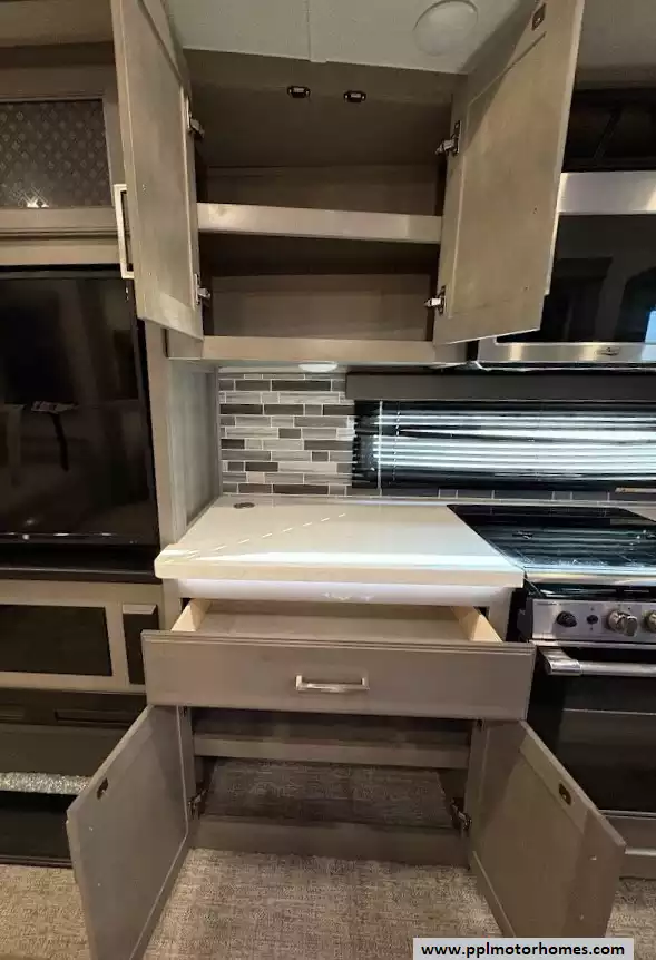 The back of the RV is dedicated to the main living space, made exceptionally large by two opposing slide-outs. This area includes comfortable power theater seating and a tri-fold hide-a-bed sofa which can sleep two additional people. An entertainment center with a TV and an electric fireplace is situated at the very rear.