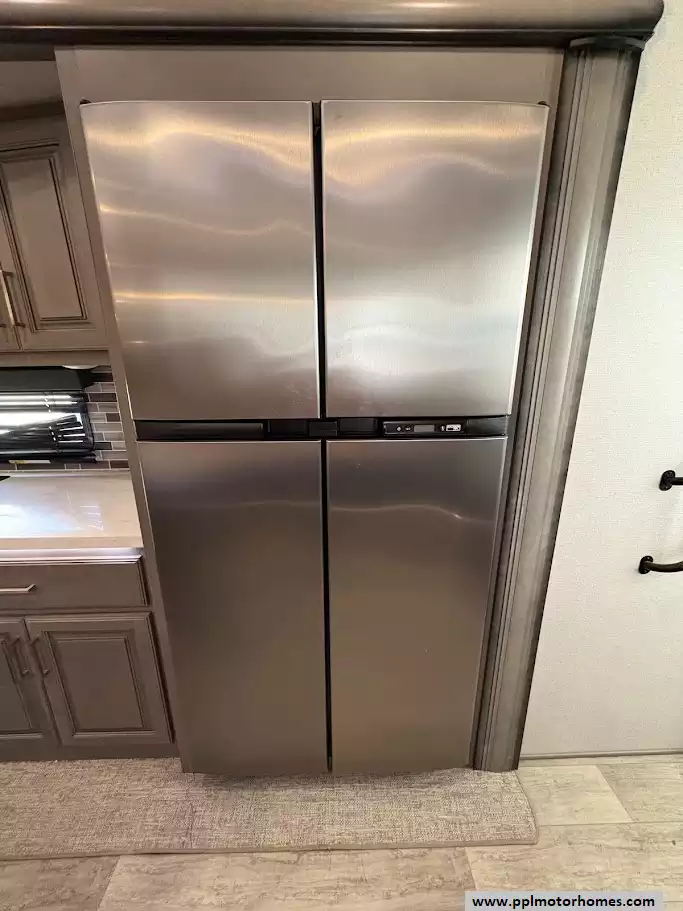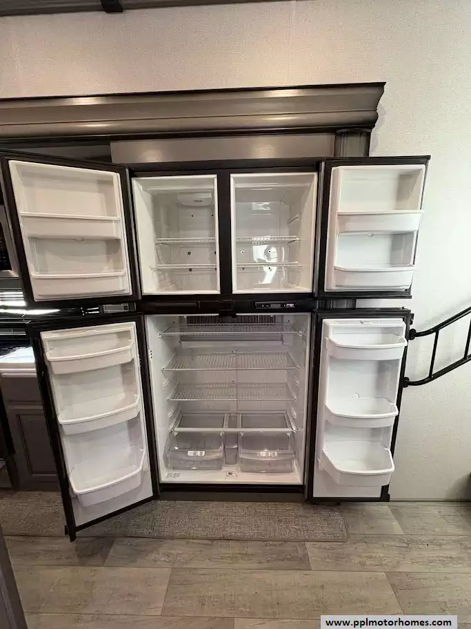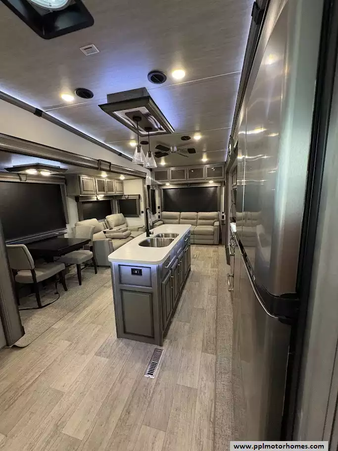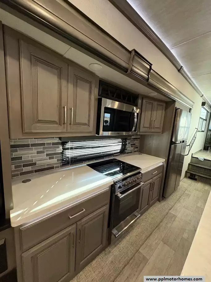Moving forward, the kitchen is in the middle of the unit. It features a large center island with dual sinks, solid surface countertops, a 4 door refrigerator, and a three-burner cooktop with a convection microwave. Opposite the kitchen island, a free-standing dinette with chairs and ample storage throughout the kitchen area.Washer/dryer hookups are conveniently located in a closet by the entry door