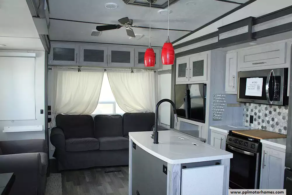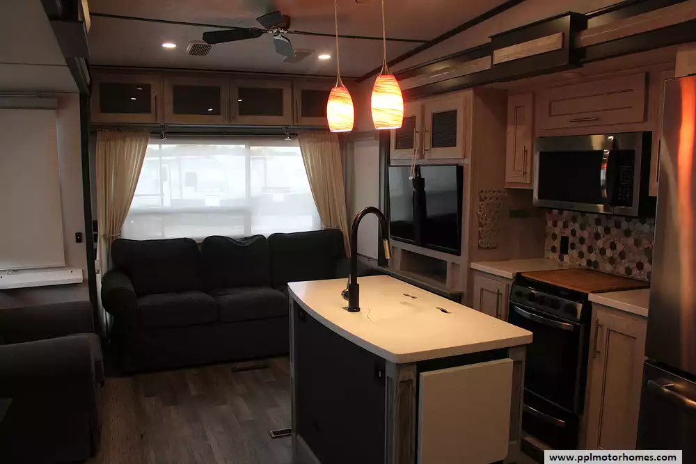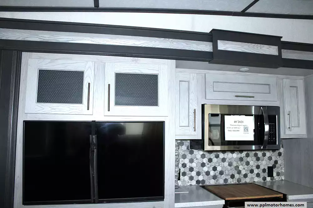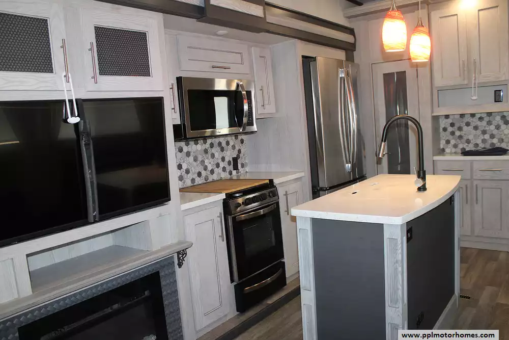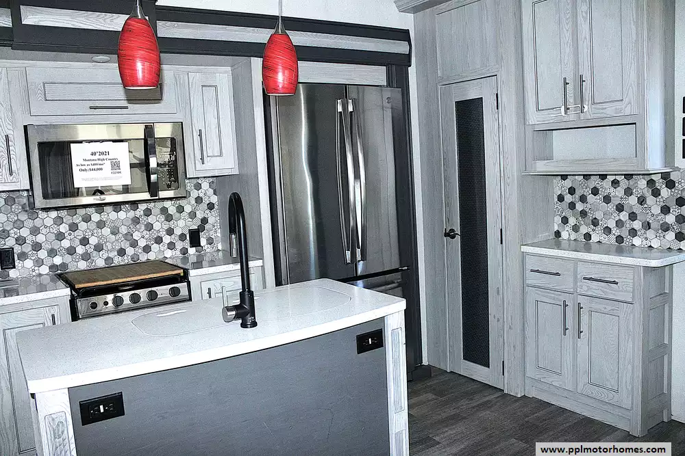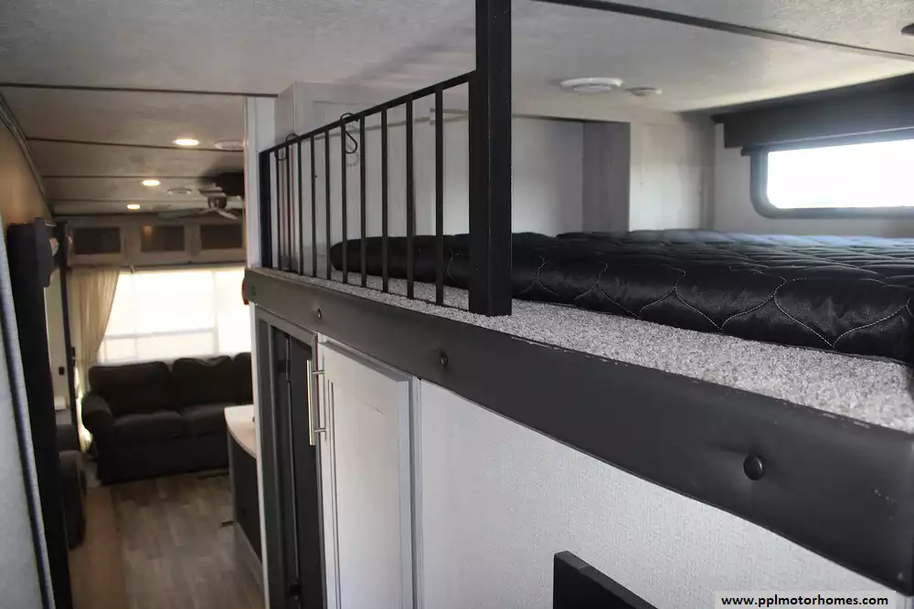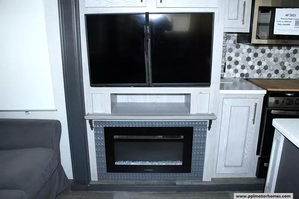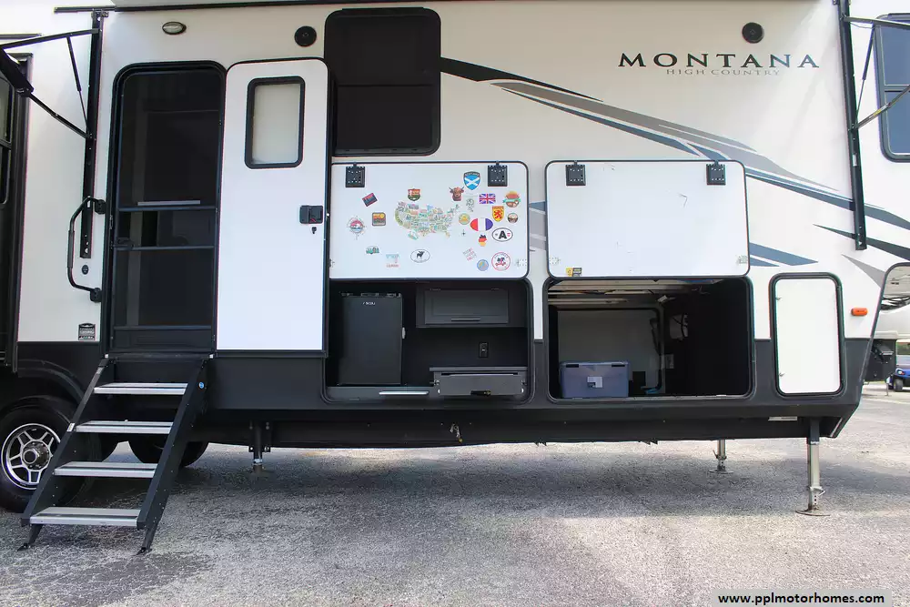 2021 Keystone Montana High Country 385BR is a spacious, high-end fifth wheel built for comfort, adventure, and versatility. Featuring a rare mid-bunk bonus room with a hide-a-bed sofa and desk, plus a loft overhead, this smart floorplan easily sleeps up to 10 people. Perfect for families, guests, or full-timers who need extra space. The rear living area offers residential-style comfort with theater seating, a tri-fold sleeper sofa, entertainment center, fireplace, and a large kitchen with center island and residential refrigerator.