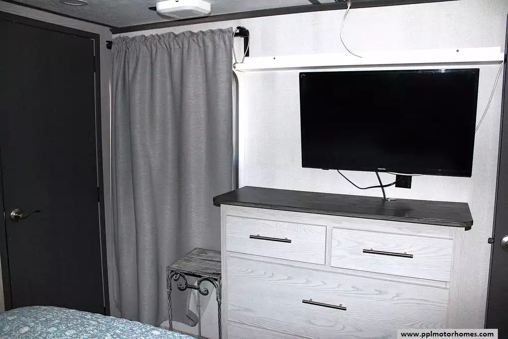 Up front, the private master suite boasts a king bed, dual wardrobes, washer/dryer prep, and ample storage. The bathroom includes a spacious shower and high-end finishes. Equipped with dual A/Cs, auto-leveling system, four slide-outs, and a 14-ply tire set dated 2022, this unit is ready for extended trips or seasonal stays. The frame recall has been fully completed at both the Keystone Montana and Lippert factories, giving you added peace of mind and structural confidence.