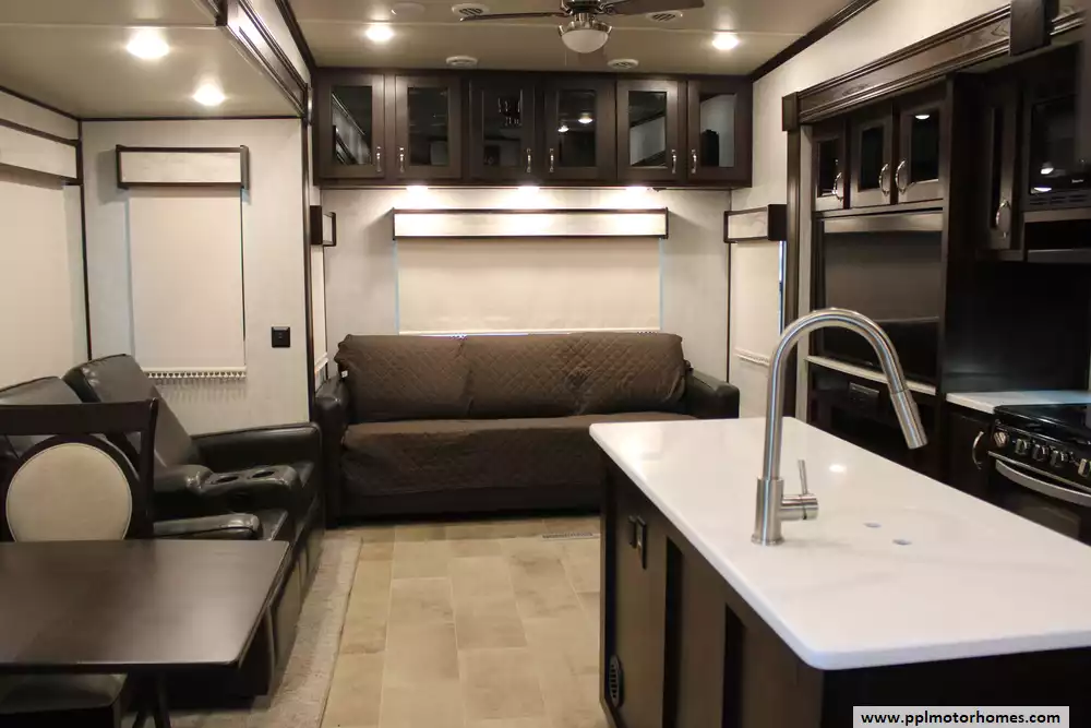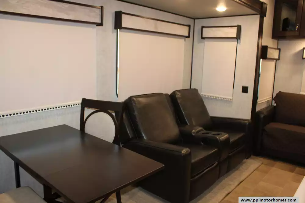 Specs: Length: 38.1 ft., Height: 13.6 ft., Payload Capacity: 3,000 lbs., Total Fresh Water Tank Capacity: 75 gal., Total Gray Water Tank Capacity: 71 gal., Total Black Water Tank Capacity: 39 gal., Total Propane Tank Capacity: 60 lbs.