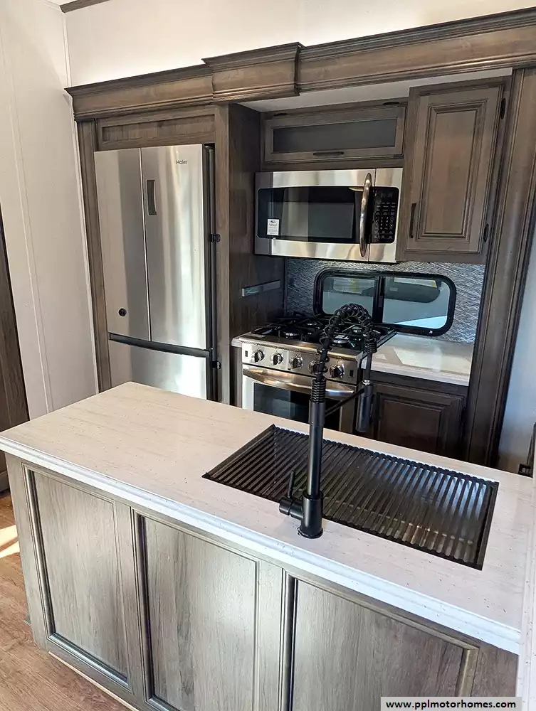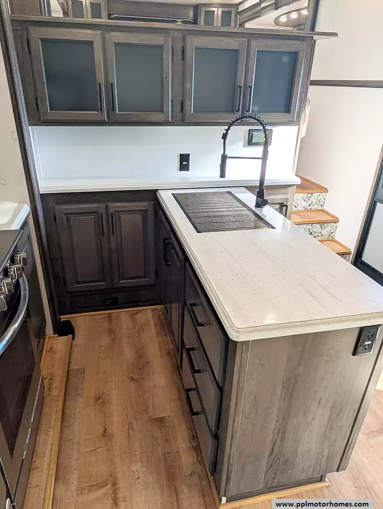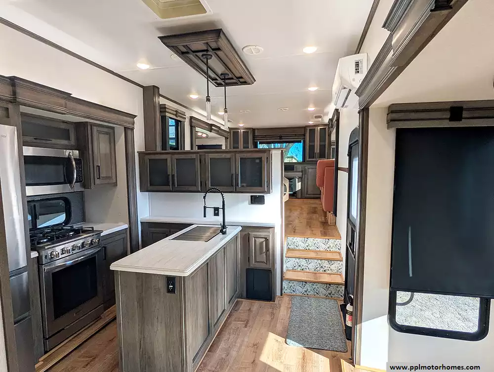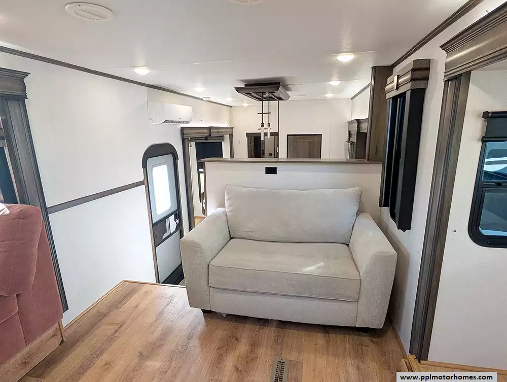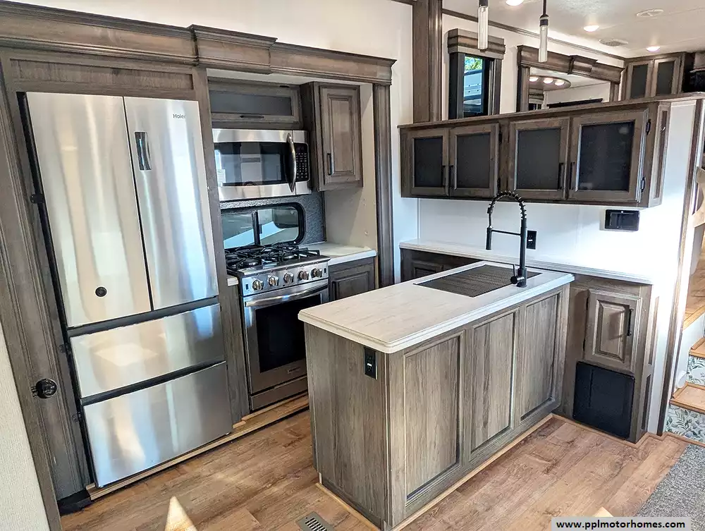 Experience the height of executive residential luxury with the 2021 Sanibel 3802WB, a premier 41-foot fifth wheel designed for those who want to bring the comforts of home on every journey. This coach is built on a 100-inch wide-body chassis with a durable fiberglass exterior and a rubber roof, offering a stable and expansive living space enhanced by five massive slide-outs. Setting up your campsite is simple and efficient with the integrated electric landing gear, leaving you more time to enjoy the outdoor amenities, including the built-in outdoor grill and high-output exterior speakers.