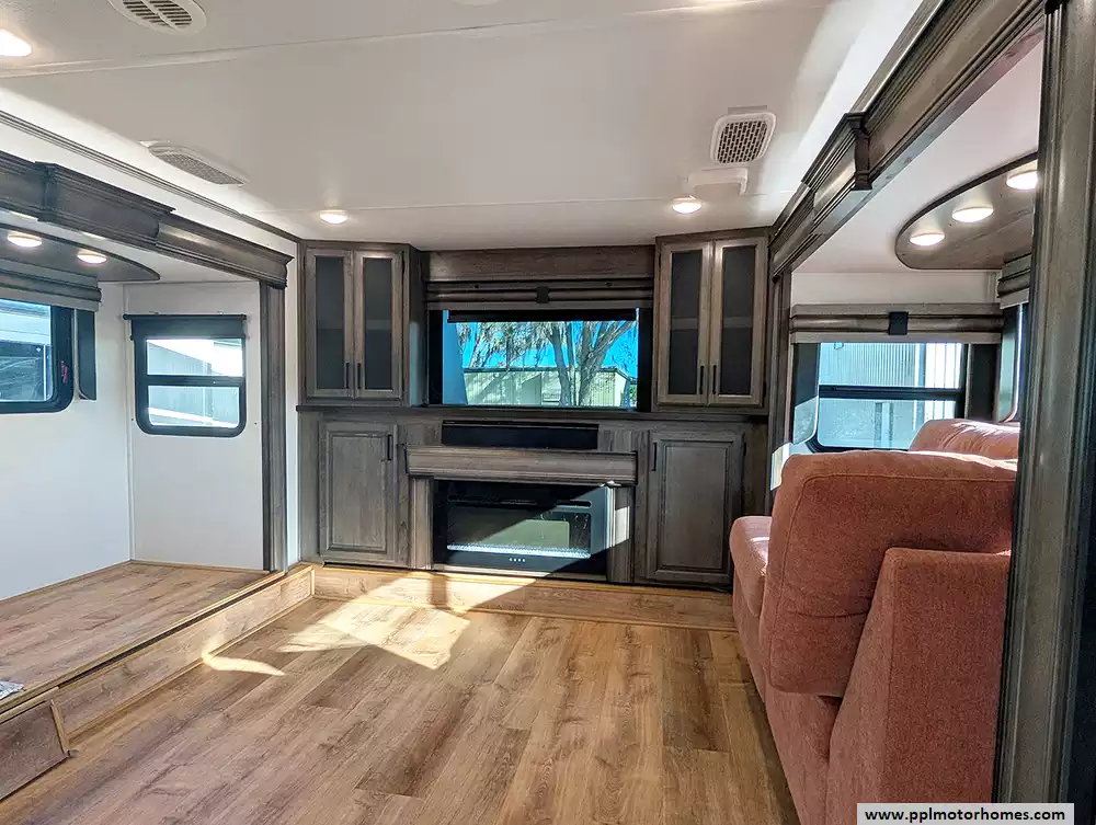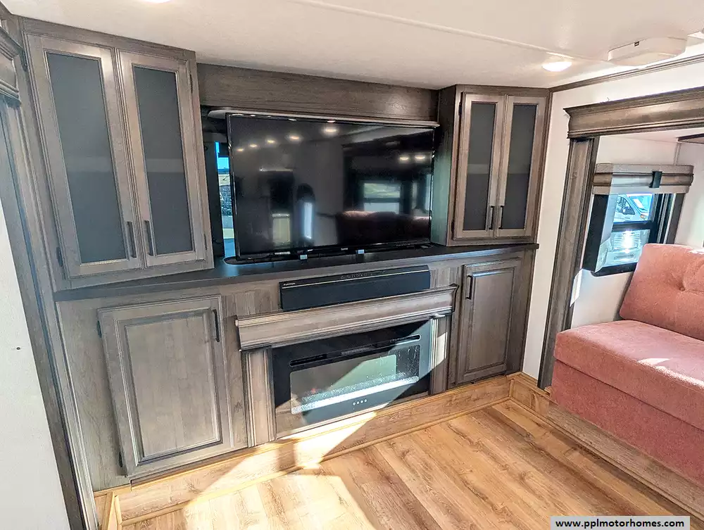 The interior reflects Sanibel's reputation for sophisticated design, featuring a gourmet kitchen equipped with a four-door residential refrigerator, a four-burner range, and a microwave. Relax in the front living area by the warmth of the fireplace while enjoying your favorite shows on the TV with a satellite receiver. Engineered for four-season travel, this unit ensures your comfort in any climate with dual ducted air conditioners and heated tanks. From its residential-grade appliances to its spacious floor plan, the Sanibel 3802WB offers a truly uncompromising home on wheels for the modern traveler.