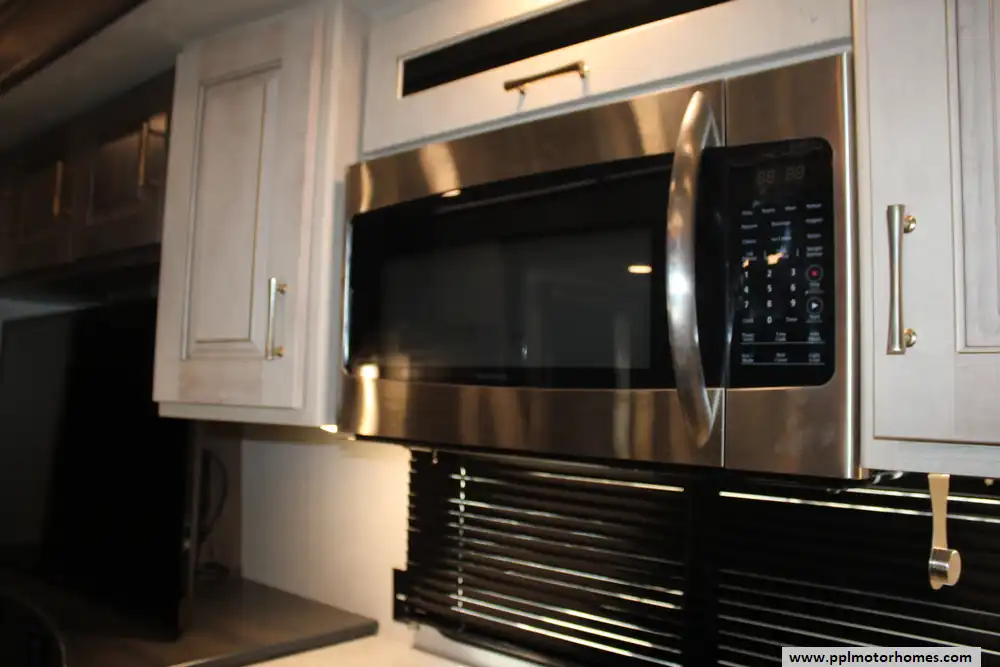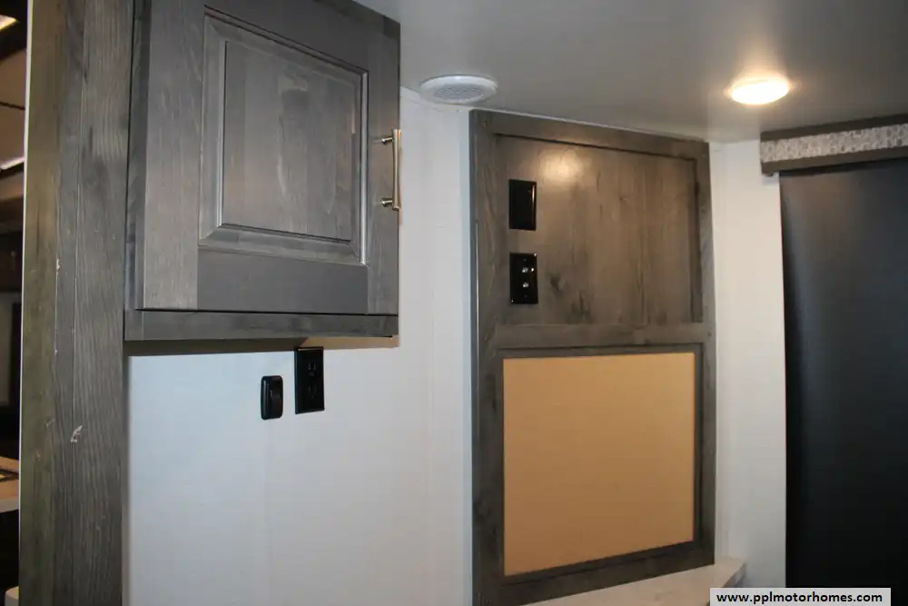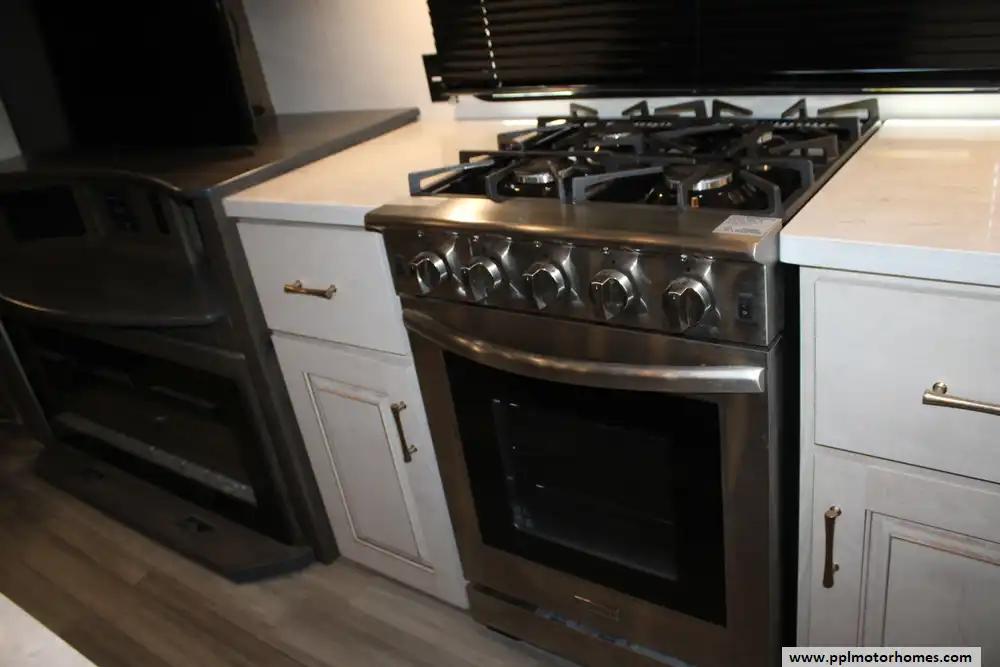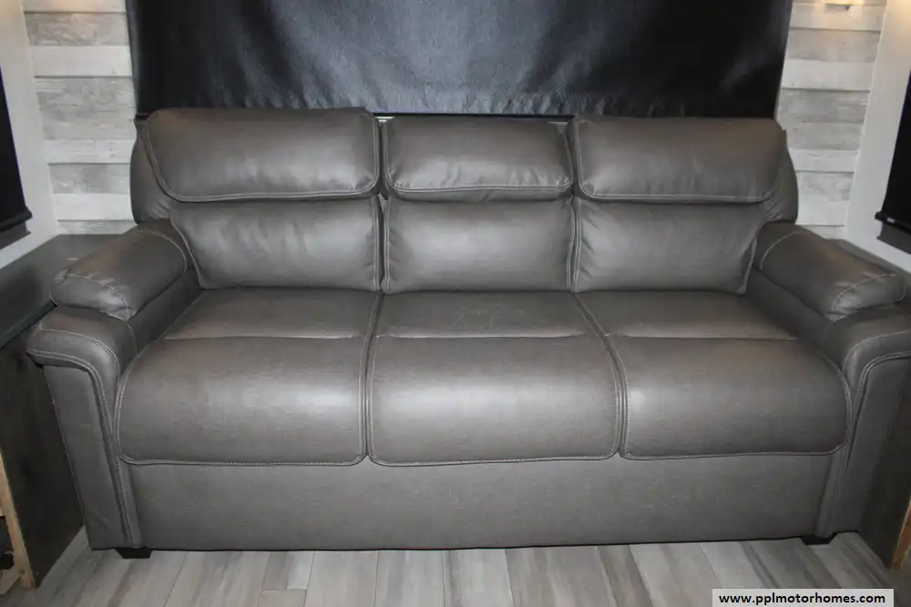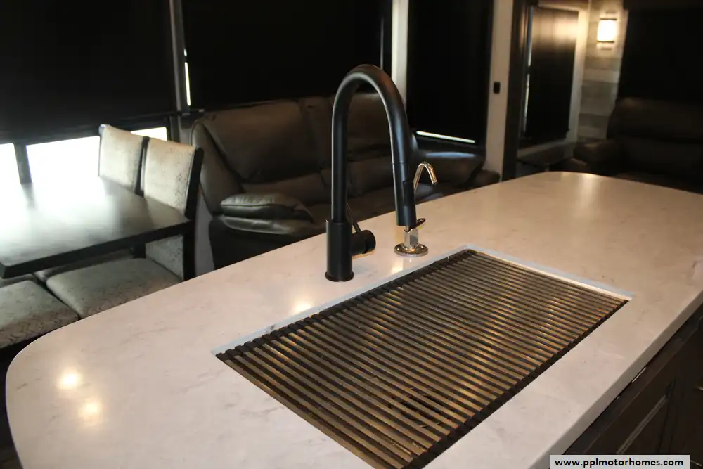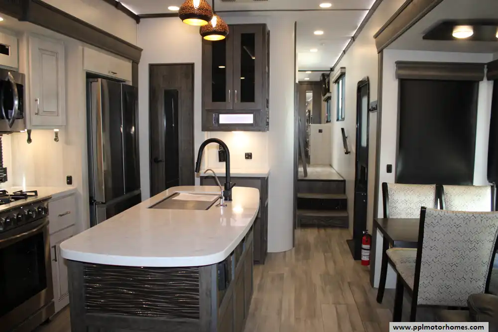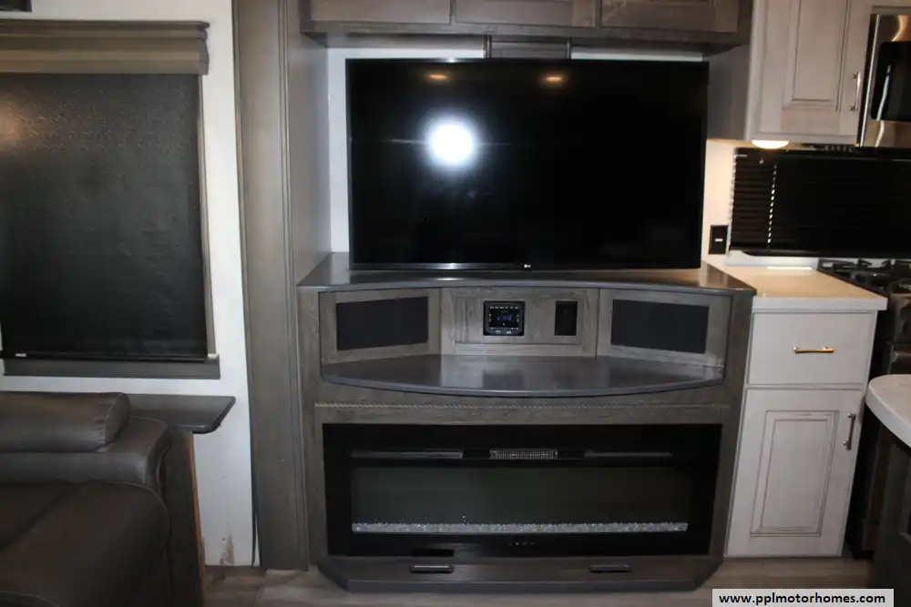 The main living area offers residential-style comfort with theater seating, a fireplace, large entertainment setup, and a fully equipped kitchen with solid-surface countertops, kitchen island, pantry, and full-size refrigerator.