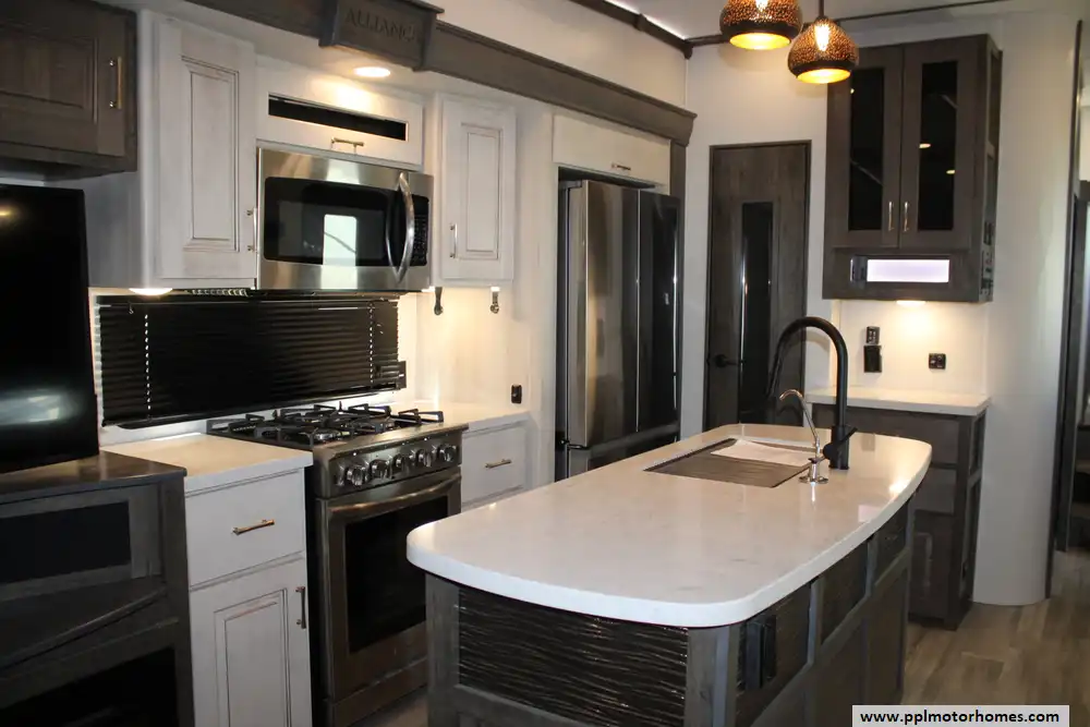 The 2022 Alliance Paradigm 390MP is a luxury fifth wheel designed with versatility and full-time living in mind, featuring a spacious triple-slide layout and an overall length of just under 42 feet. Weighing around 13,500 pounds dry, it stands out with its unique multi-purpose mid-room that can function as a home office, guest room, or additional sleeping space, often complemented by a loft above for extra storage or sleeping capacity.