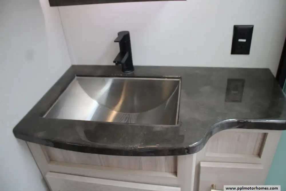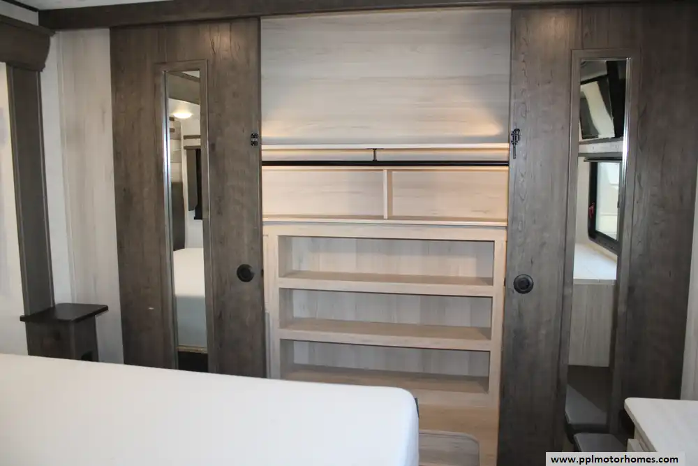 Toward the front, a private master suite includes a king bed, ample wardrobe space, washer/dryer prep, and access to a spacious bathroom, while high-end construction features like aluminum framing, heated and enclosed underbelly with heated tanks, 50-amp service, and up to three air conditioners make it suitable for extended or all-season travel.