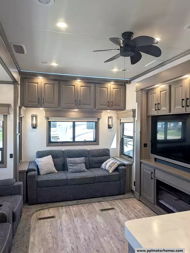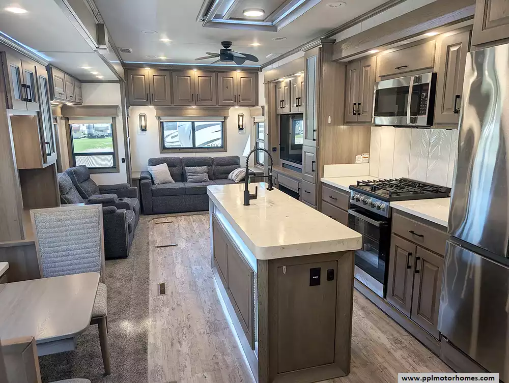 Experience the gold standard of full-time luxury with this 2022 DRV Mobile Suite 43 Houston. Renowned as the pinnacle of residential fifth wheels, DRV suites are engineered with industry-leading insulation and heavy-duty construction to provide a true home-on-wheels experience that stands up to the demands of the road. This 44-foot fiberglass coach features a spacious three-slide layout kept perfectly comfortable in any climate by three ducted air conditioners, heated tanks, and a cozy fireplace. Setting up camp is effortless thanks to the hydraulic landing gear, while the automatic main and slide awnings offer convenient outdoor protection at the touch of a button.