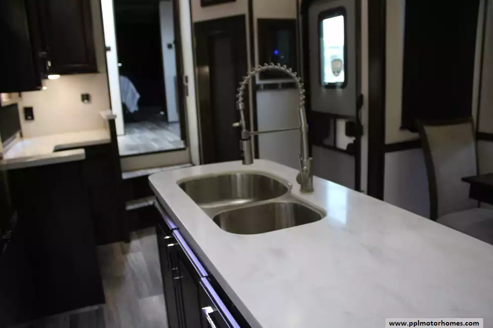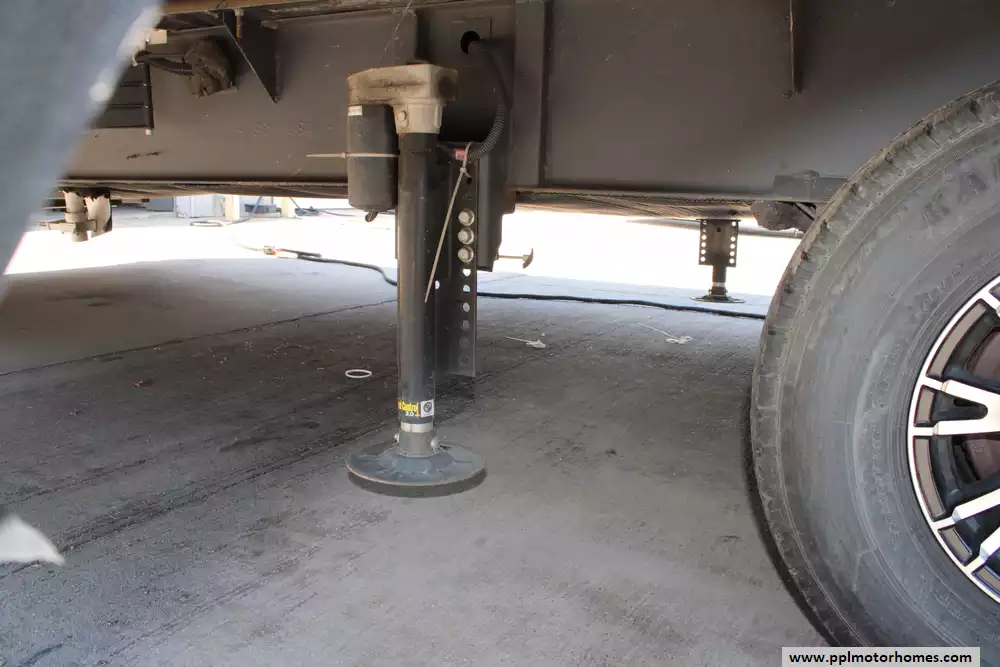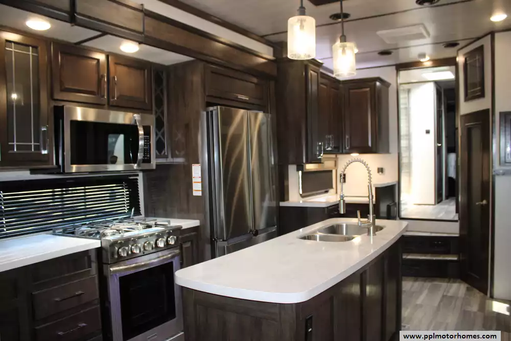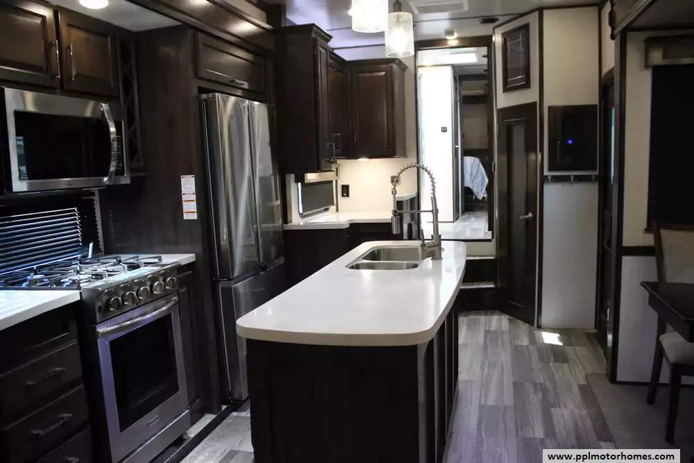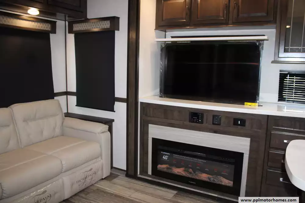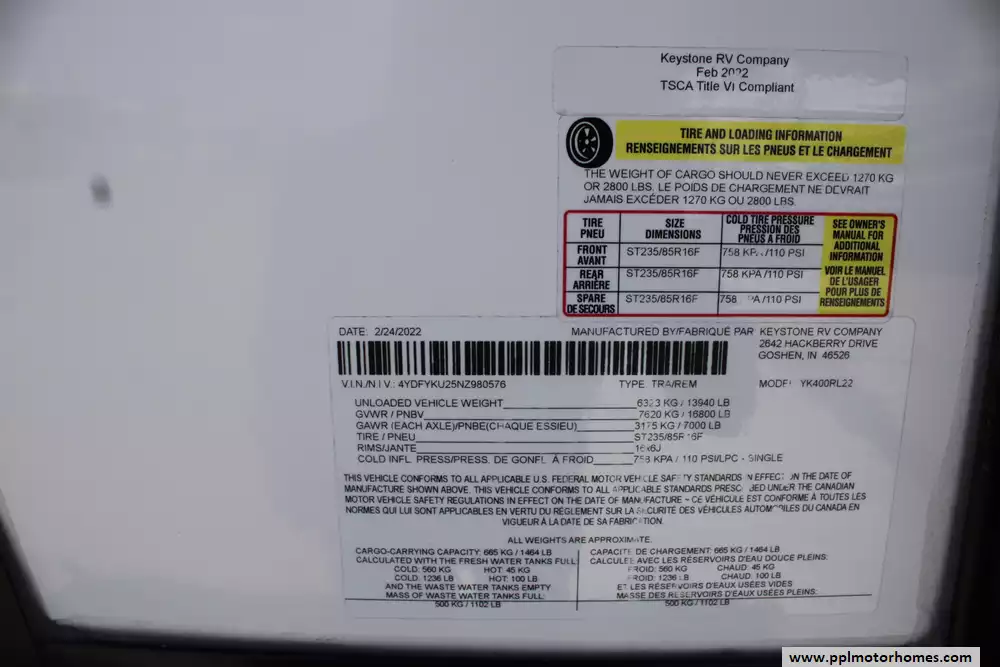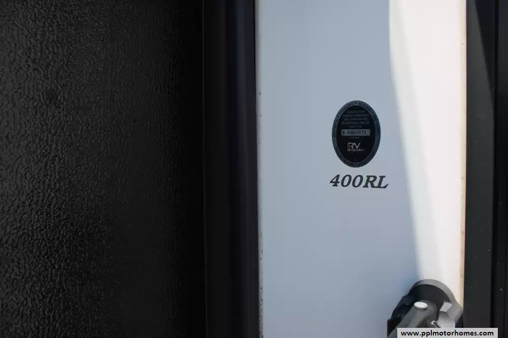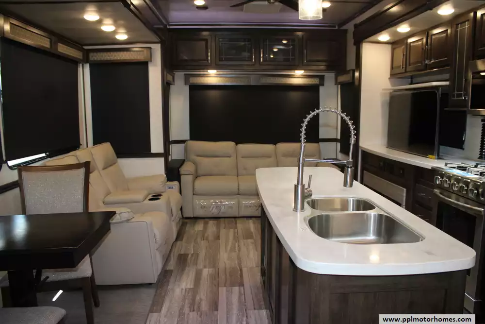 The 2022 Yukon 400RL is a luxurious, spacious fifth-wheel measuring about 42 ft 5 in long with three power slide-outs that create a rear living layout featuring theater seating, a kitchen island, walk-in pantry, and a full bath with a dual-sink vanity and separate toilet area for enhanced privacy and comfort. Built with rugged aluminum framing, fiberglass sidewalls, and a fully enclosed underbelly, it's designed for durability and four-season use. With a dry weight around 13,900 lb, a hitch weight near 2,453 lb, and generous capacities, 162 gal fresh, 88 gal gray, and 44 gal black water, it balances functionality with towability. Under the 29-ft electric awning (plus an additional 11-ft awning), the outdoor living space complements high-end indoor comforts like a full-size residential refrigerator, king-size front bedroom, fireplace, two large TVs, and washer/dryer prep, all wrapped in a refined, contemporary design.
