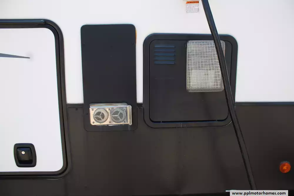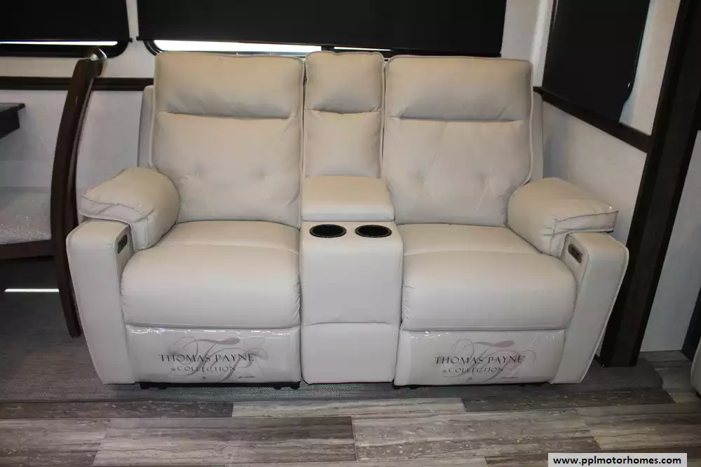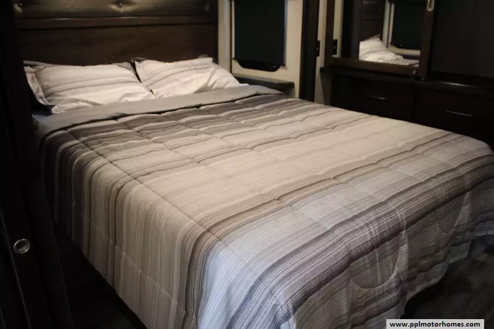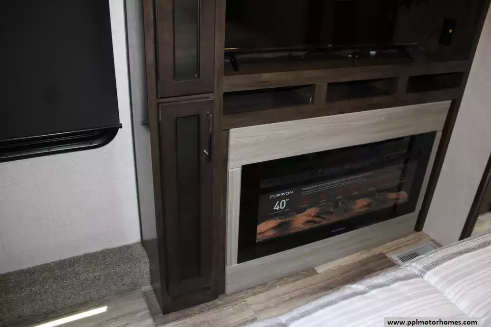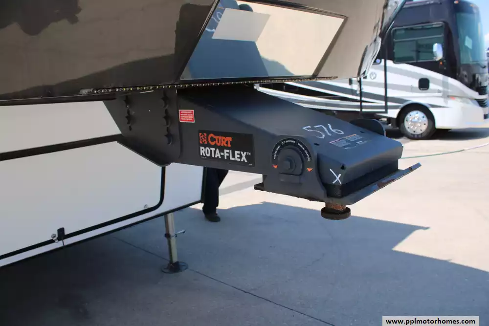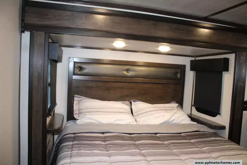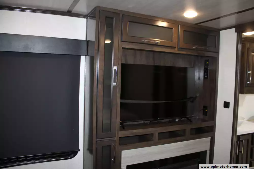 The 2022 Yukon 400RL is a luxurious, spacious fifth-wheel measuring about 42 ft 5 in long with three power slide-outs that create a rear living layout featuring theater seating, a kitchen island, walk-in pantry, and a full bath with a dual-sink vanity and separate toilet area for enhanced privacy and comfort. Built with rugged aluminum framing, fiberglass sidewalls, and a fully enclosed underbelly, it's designed for durability and four-season use. With a dry weight around 13,900 lb, a hitch weight near 2,453 lb, and generous capacities, 162 gal fresh, 88 gal gray, and 44 gal black water, it balances functionality with towability. Under the 29-ft electric awning (plus an additional 11-ft awning), the outdoor living space complements high-end indoor comforts like a full-size residential refrigerator, king-size front bedroom, fireplace, two large TVs, and washer/dryer prep, all wrapped in a refined, contemporary design.