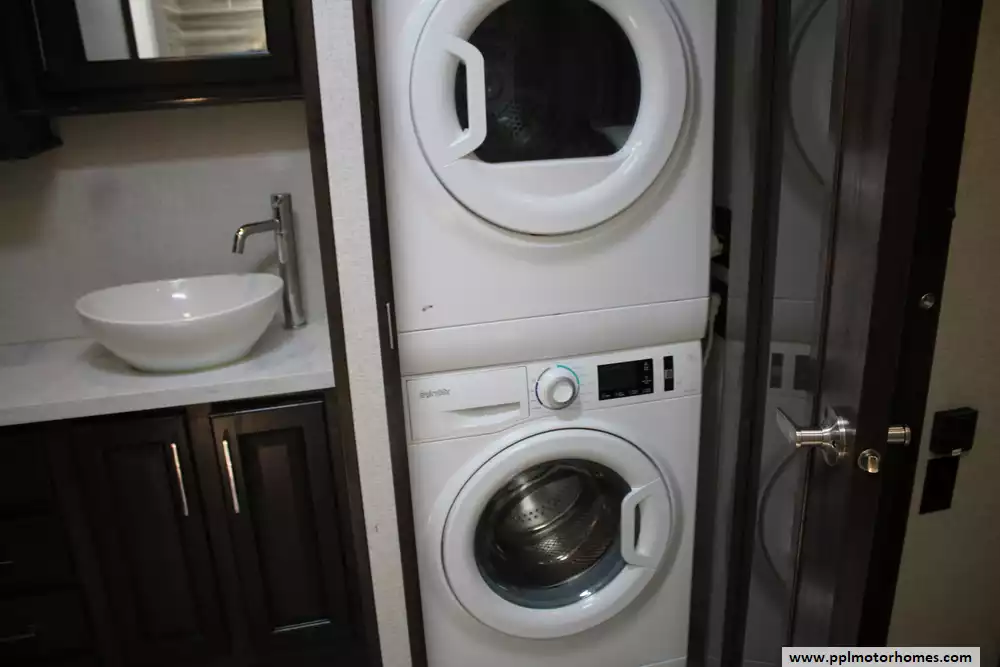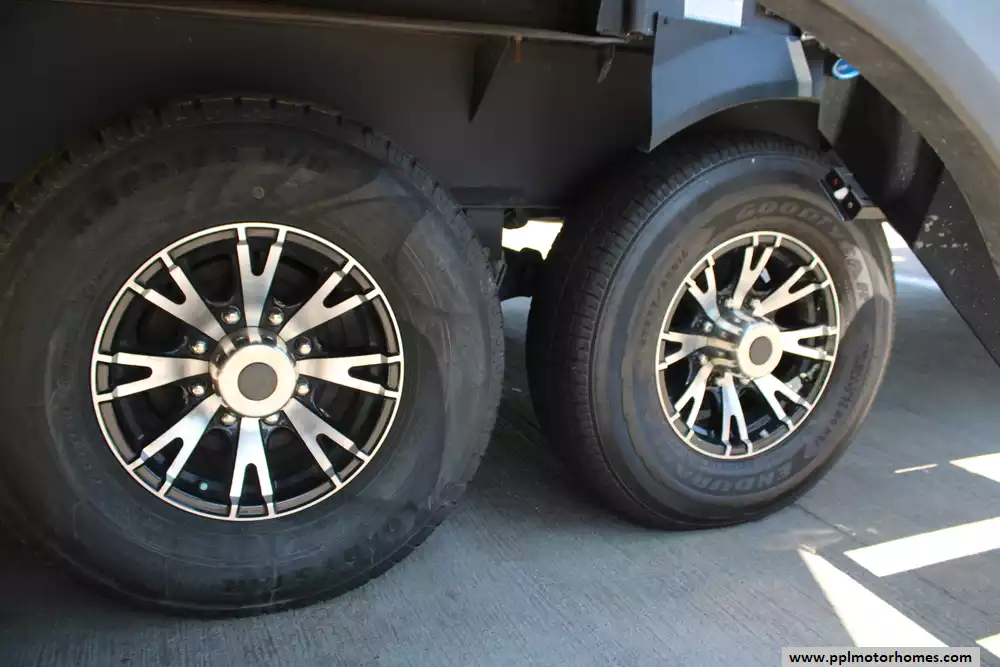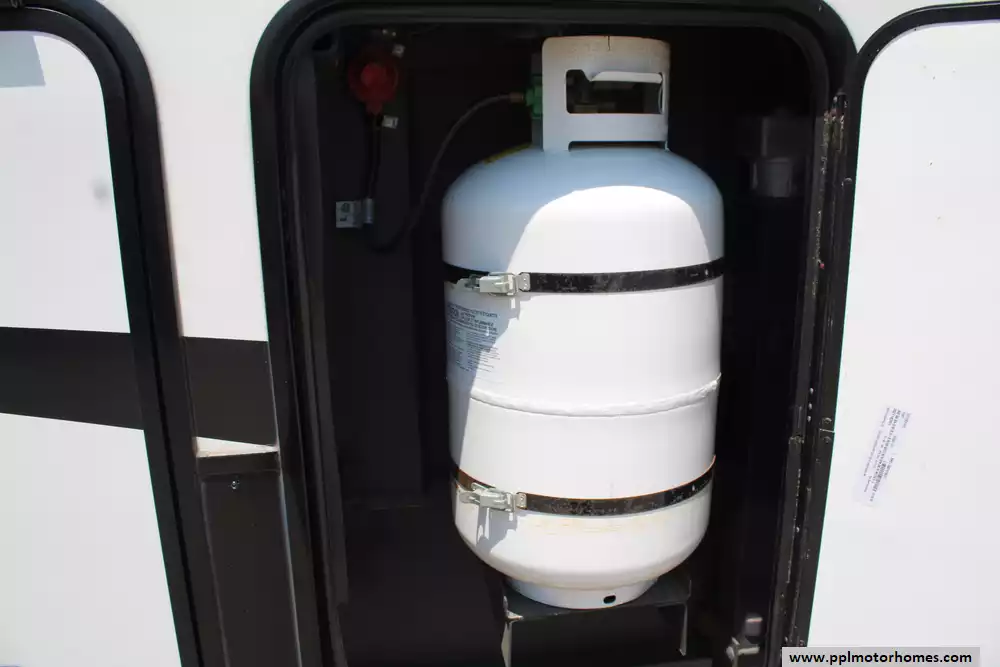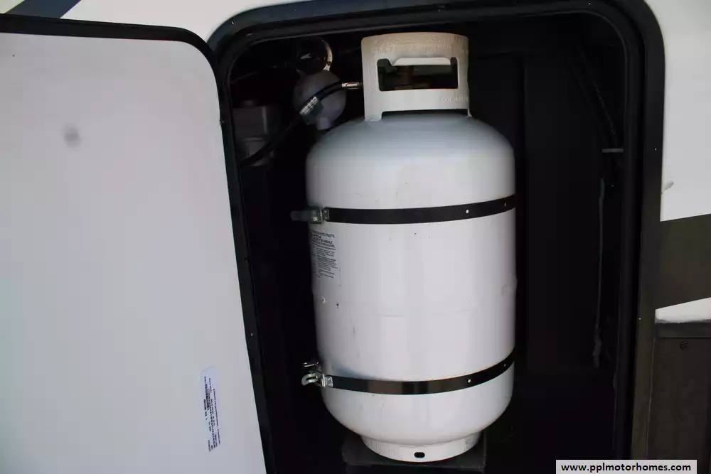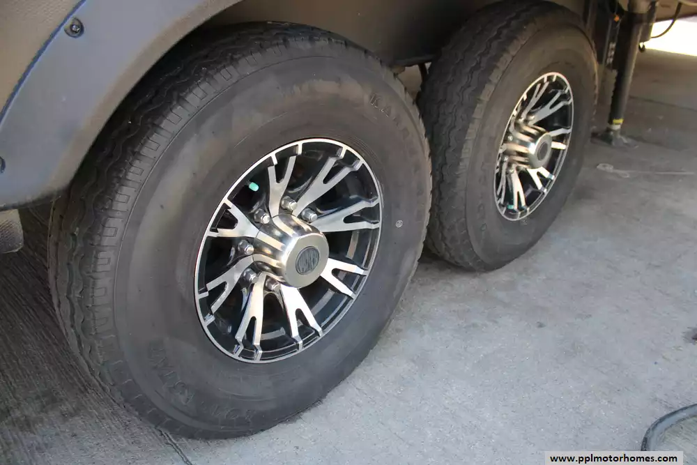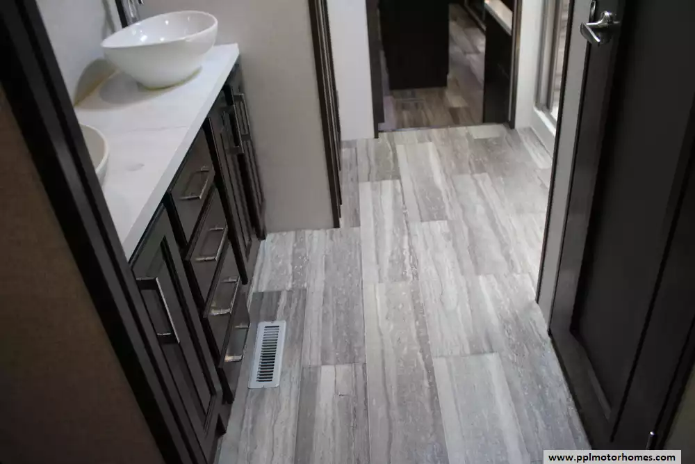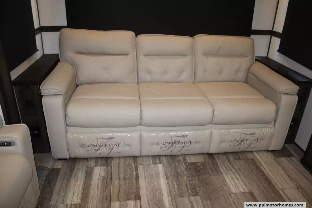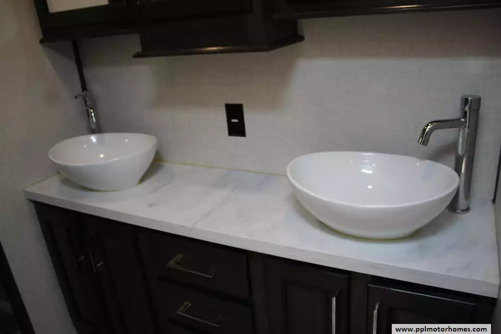 The 2022 Yukon 400RL is a luxurious, spacious fifth-wheel measuring about 42 ft 5 in long with three power slide-outs that create a rear living layout featuring theater seating, a kitchen island, walk-in pantry, and a full bath with a dual-sink vanity and separate toilet area for enhanced privacy and comfort. Built with rugged aluminum framing, fiberglass sidewalls, and a fully enclosed underbelly, it's designed for durability and four-season use. With a dry weight around 13,900 lb, a hitch weight near 2,453 lb, and generous capacities, 162 gal fresh, 88 gal gray, and 44 gal black water, it balances functionality with towability. Under the 29-ft electric awning (plus an additional 11-ft awning), the outdoor living space complements high-end indoor comforts like a full-size residential refrigerator, king-size front bedroom, fireplace, two large TVs, and washer/dryer prep, all wrapped in a refined, contemporary design.