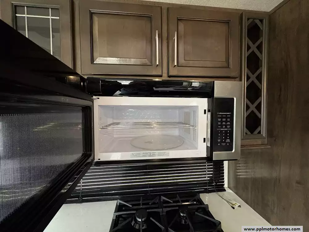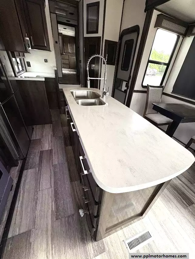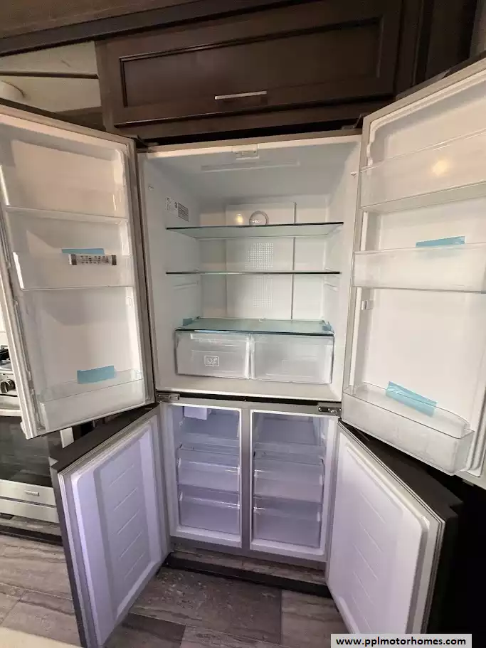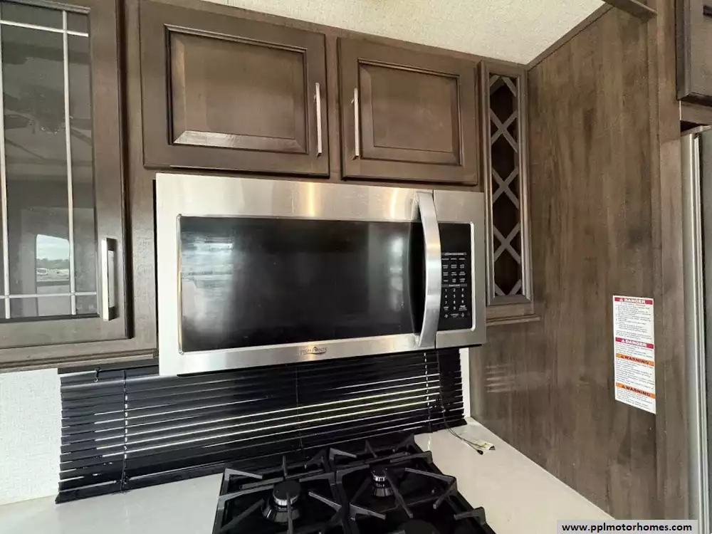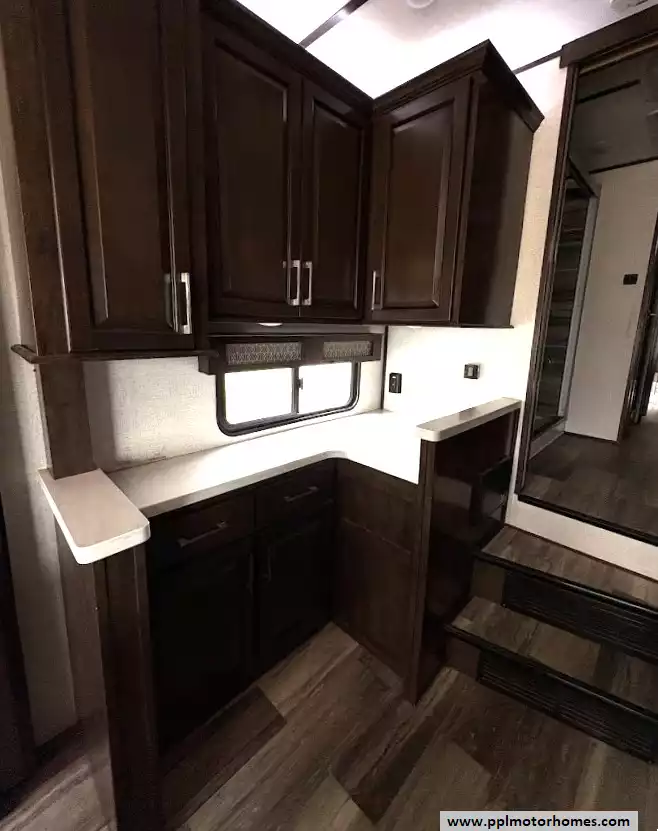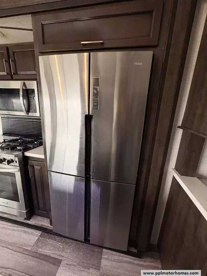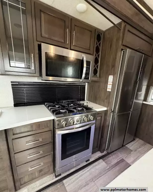 The gourmet kitchen is a chef's dream, featuring a massive four-door residential refrigerator with an in-fridge ice maker, a lighted walk-in pantry a convection microwave, and an upgraded four-burner range with a full-size oven. An addition space is perfect as your coffee station. The attention to detail continues into the master quarters, which come equipped with a stackable washer and dryer for long-term convenience and effortless extended stays. From the utility of the outside shower to the premium finishes found throughout, this Yukon 400RL is celebrated for its superior craftsmanship and sophisticated design. Discover why this model is a top choice for full-time travelers and weekend enthusiasts alike, offering a true home-away-from-home experience on the open road. Other attractive features are slide toppers, auto leveling system, Maxx Air Vents,large pullout drawer in under storage and prepped for solar.