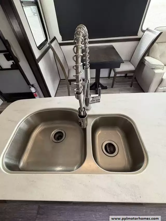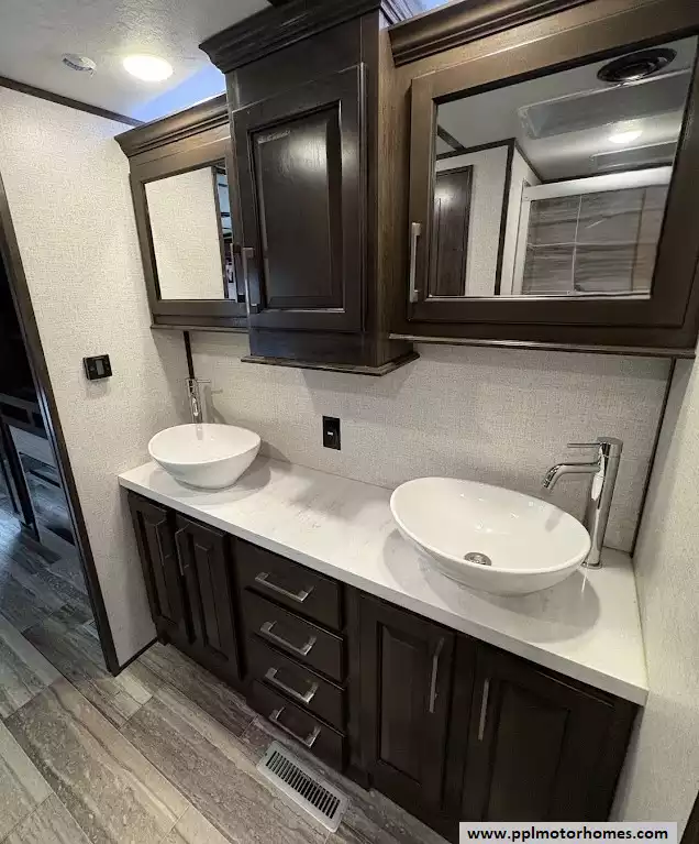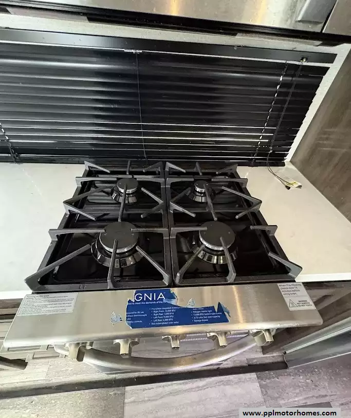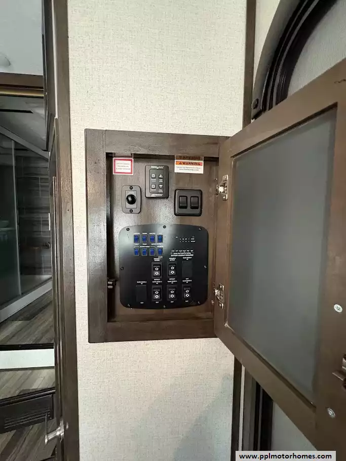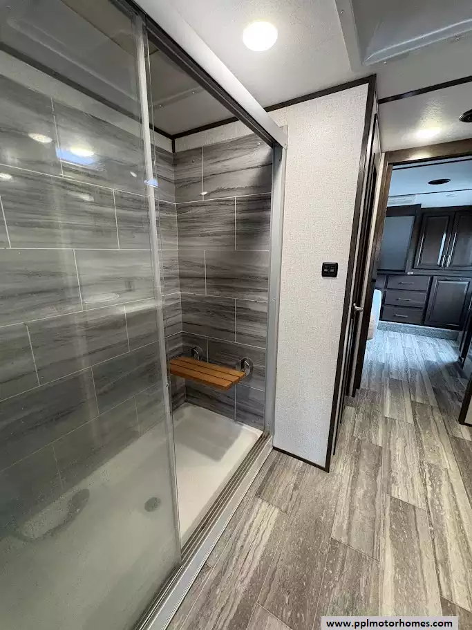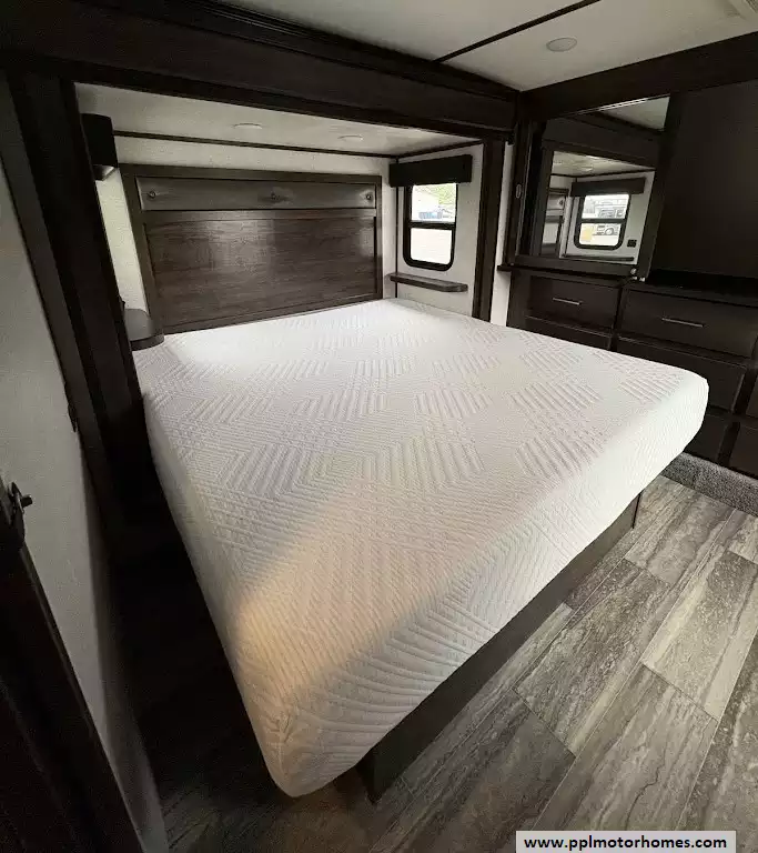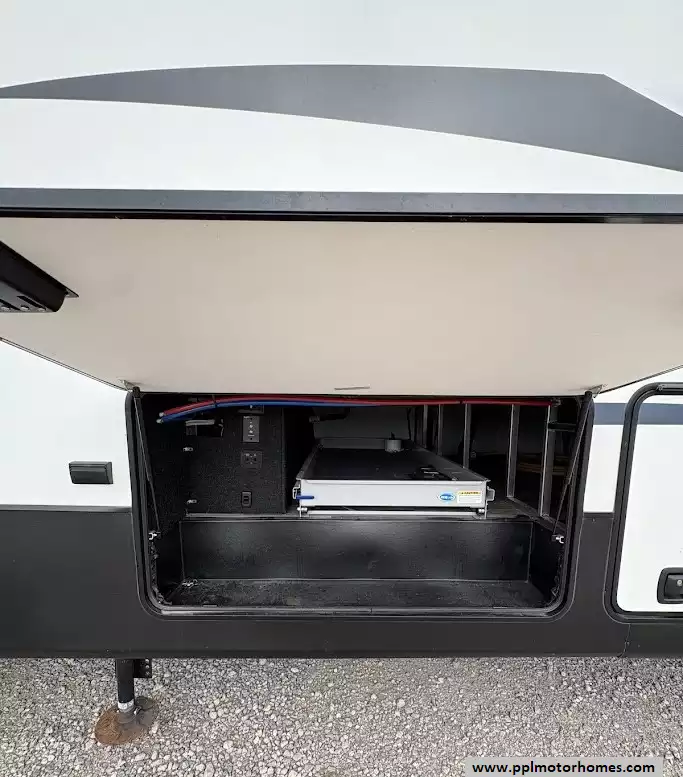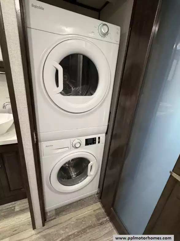 The gourmet kitchen is a chef's dream, featuring a massive four-door residential refrigerator with an in-fridge ice maker, a lighted walk-in pantry a convection microwave, and an upgraded four-burner range with a full-size oven. An addition space is perfect as your coffee station. The attention to detail continues into the master quarters, which come equipped with a stackable washer and dryer for long-term convenience and effortless extended stays. From the utility of the outside shower to the premium finishes found throughout, this Yukon 400RL is celebrated for its superior craftsmanship and sophisticated design. Discover why this model is a top choice for full-time travelers and weekend enthusiasts alike, offering a true home-away-from-home experience on the open road. Other attractive features are slide toppers, auto leveling system, Maxx Air Vents,large pullout drawer in under storage and prepped for solar.