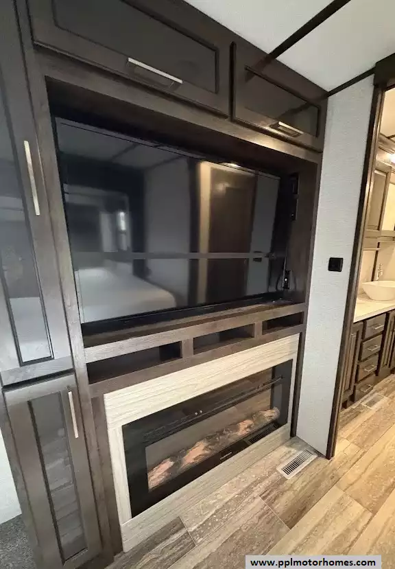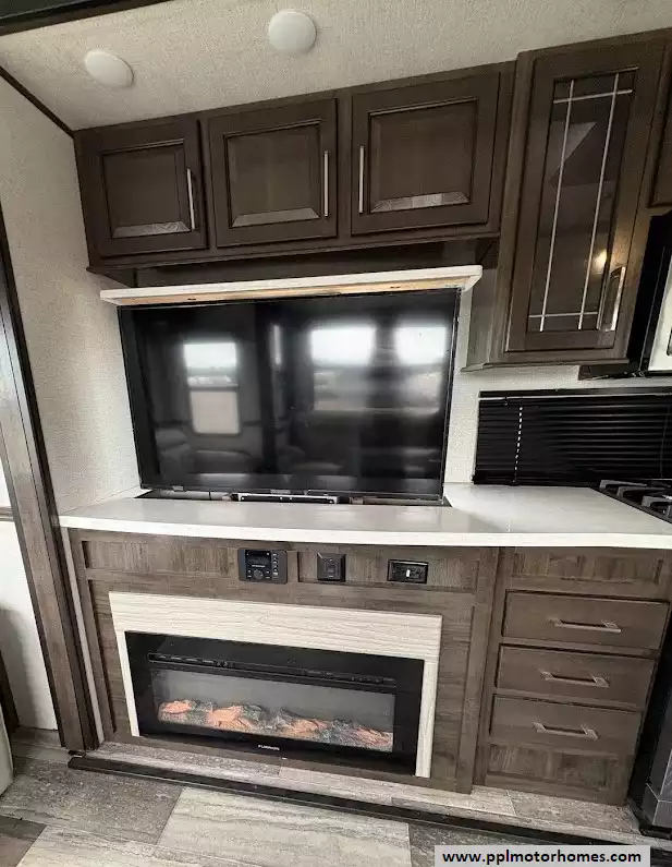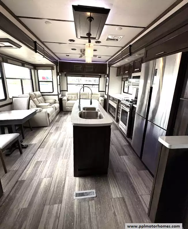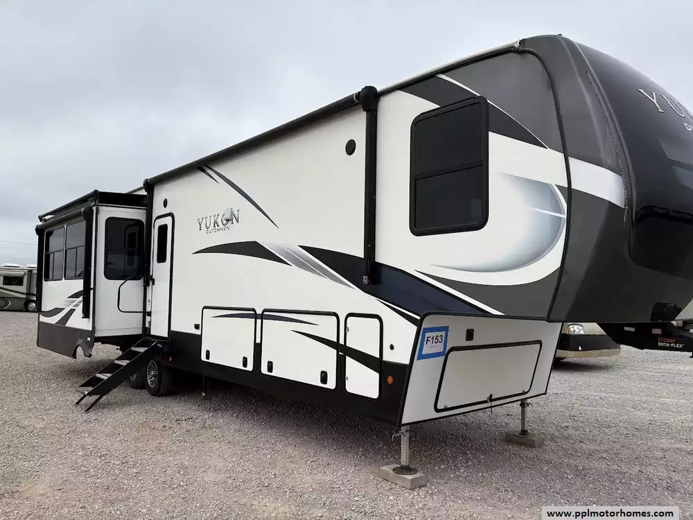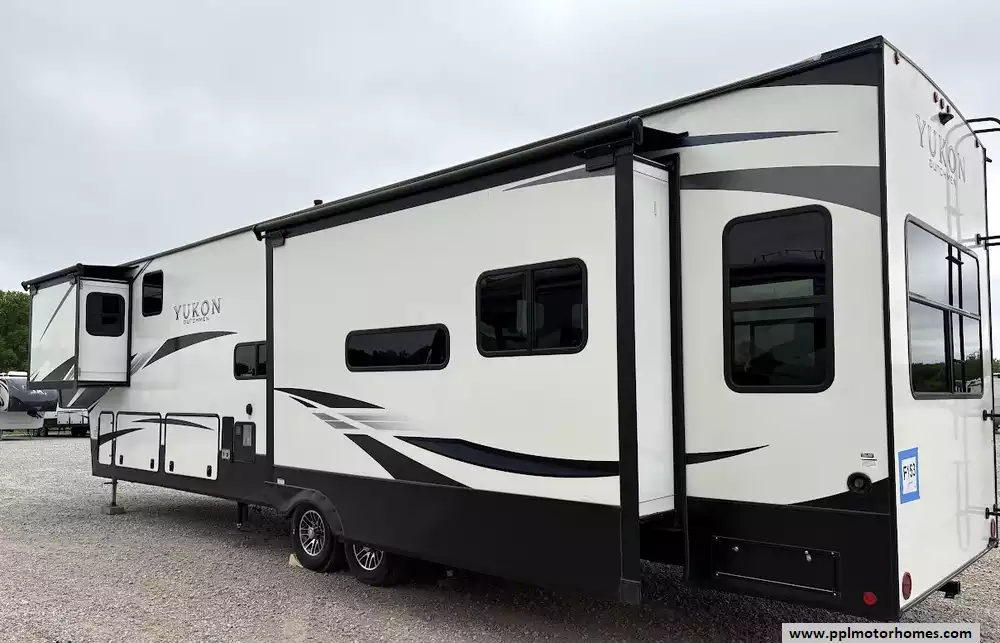 Experience the pinnacle of residential-style travel with this 2022 Yukon 400RL, a 43-foot masterpiece designed for those who refuse to compromise on comfort. Known for its yacht-inspired interior and industry-leading ceiling heights, the Yukon series provides an open, airy atmosphere that feels more like a luxury suite than a traditional trailer. This three-slide-out floorplan maximizes every inch of space, offering a sprawling rear living area anchored by a cozy fireplace and a high-definition TV. Whether you are hosting friends or enjoying a quiet evening, the integrated outside speakers and automatic main awning extend your living space to the great outdoors, while the three ducted air conditioners and heated tanks ensure you stay perfectly comfortable regardless of the season.