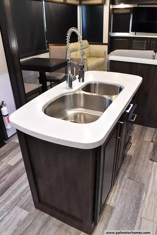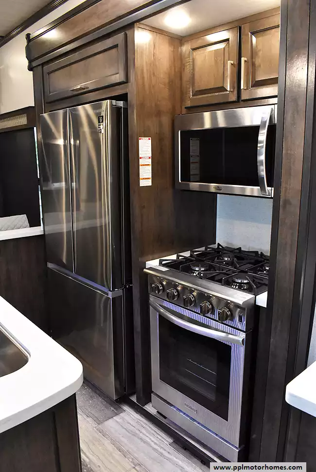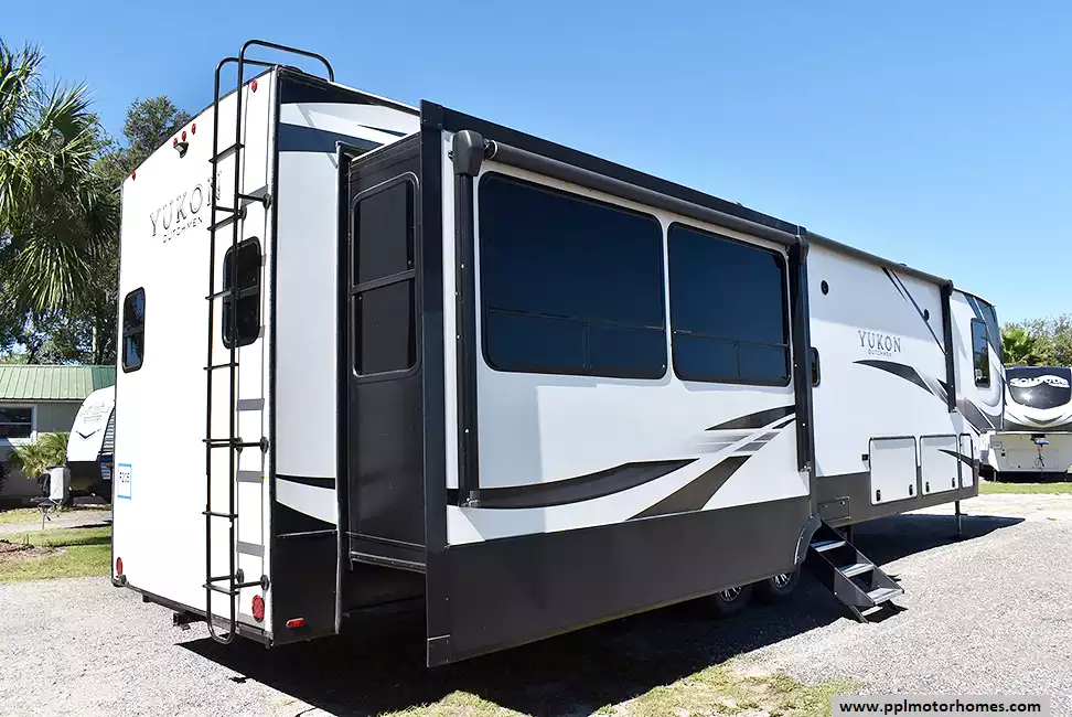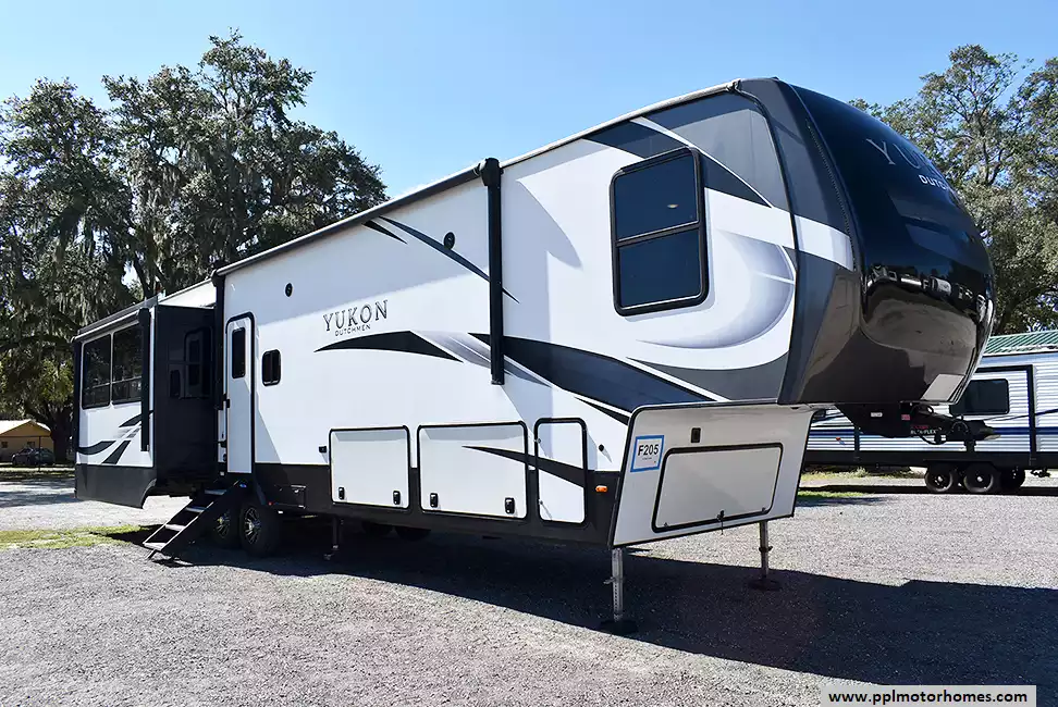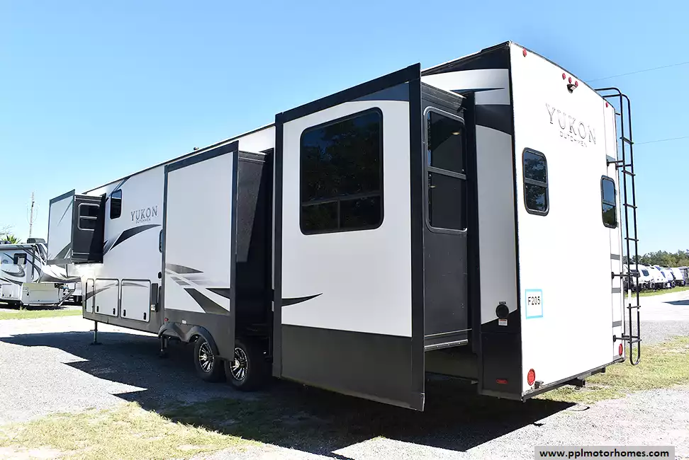 This 2022 Yukon 410RD has a Hydraulic Landing Gear, 4 Slide-outs, 3 Ducted Air Conditioners, Residential Samsung Refrigerator, In-Fridge Ice Maker, Automatic Main Awning, Washer/Dryer Connections, Outside Speakers, 2 TVs, Outside Shower, Fireplace, Microwave, 4 Burner Range, Oven