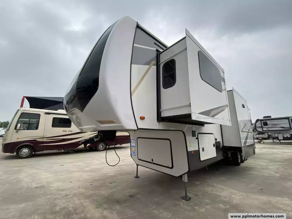 This 2022 Cedar Creek by Forest River 385TH has a Hydraulic Landing Gear, 5 Slide-outs, 2 Ducted Air Conditioners, Double Door 110v Residential Lg Refrigerator (Additional Refrigerator Present), In-Fridge Ice Maker, Automatic Main Awning, Washer/Dryer, Solar Panel, Heated Tanks, Outside Entertainment System with TV, 2 TVs, DVD Player, Outside Shower, Fireplace, Central Vacuum, Convection Microwave, 3 Burner Range, Oven