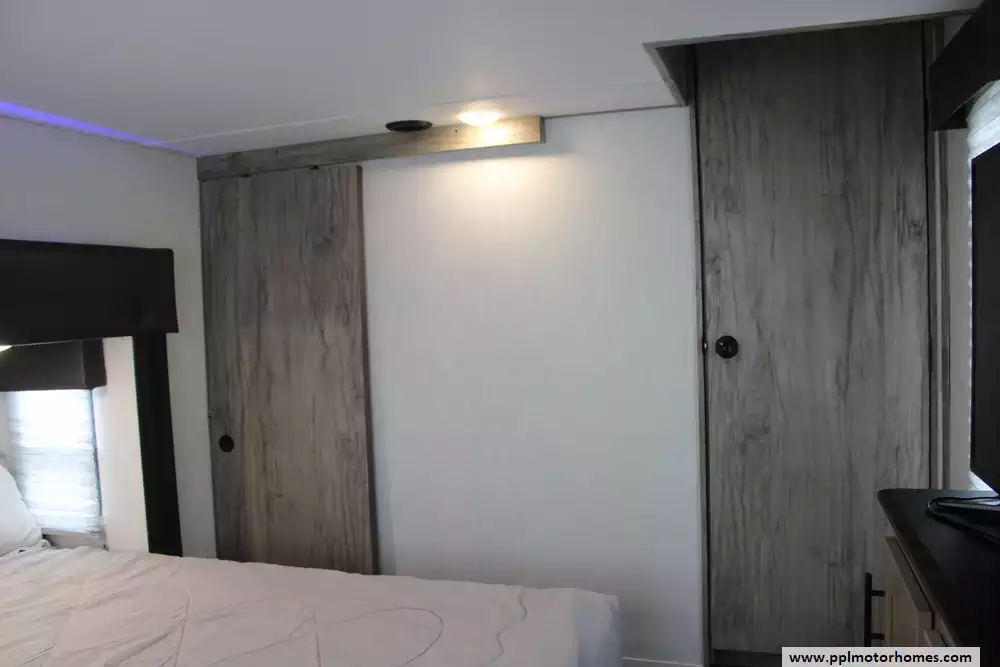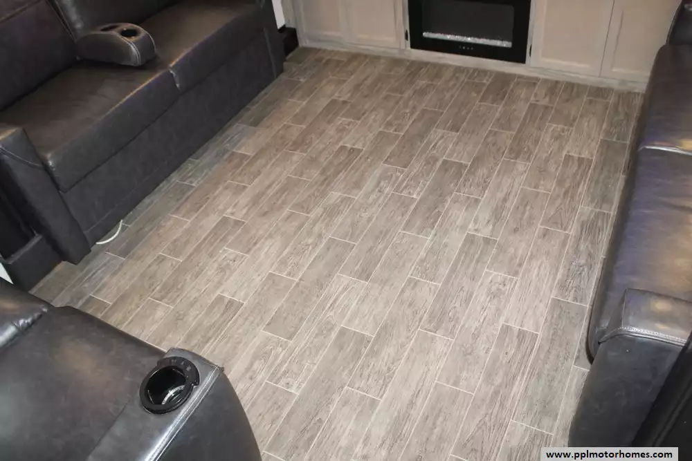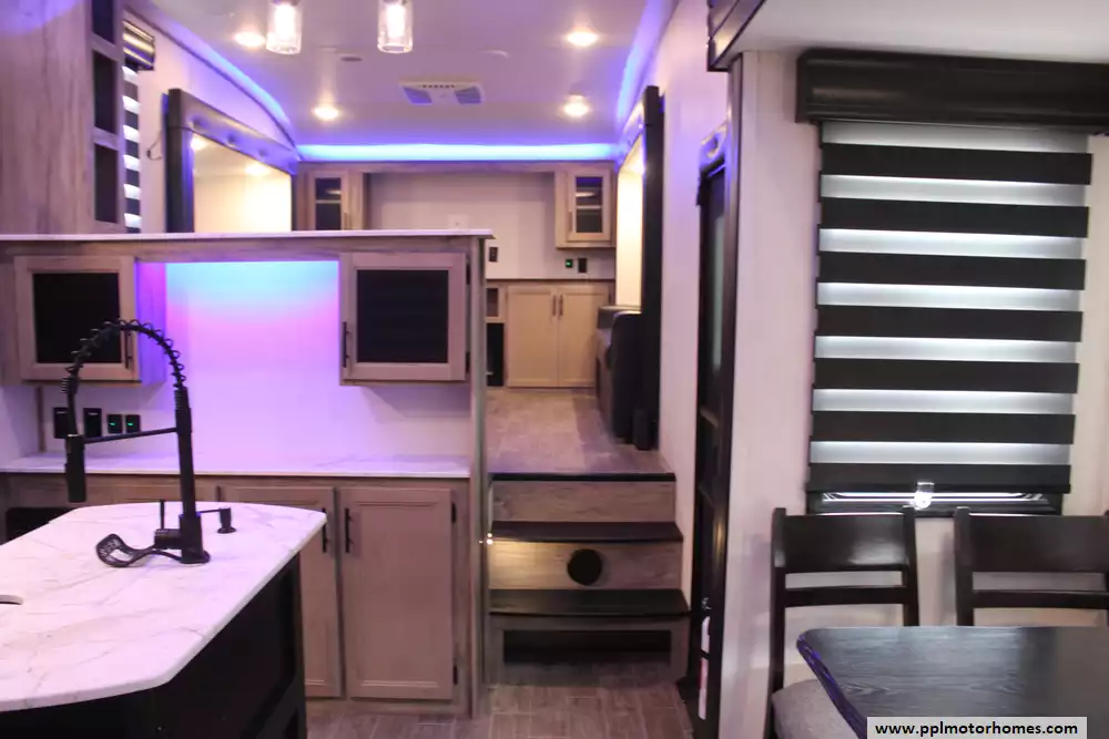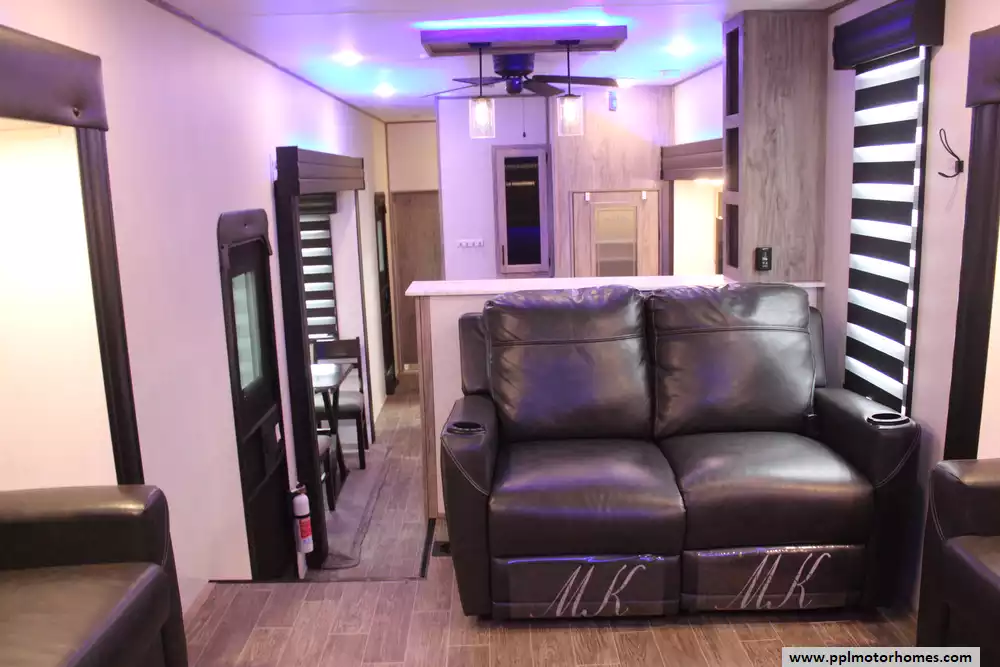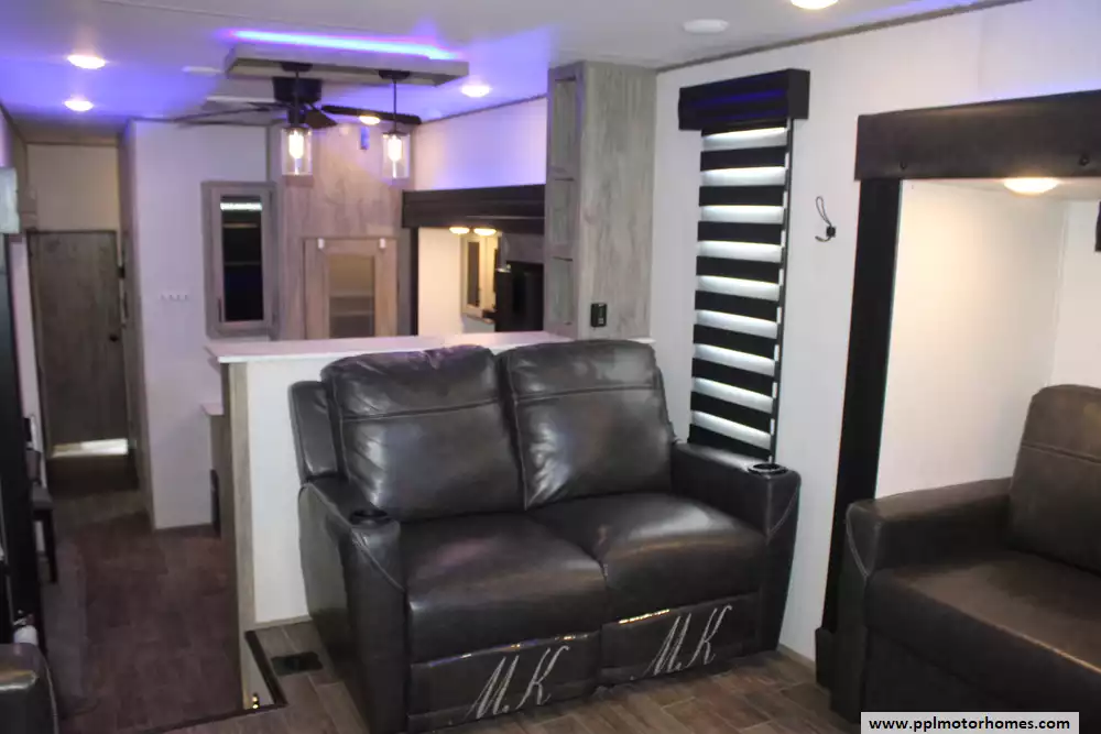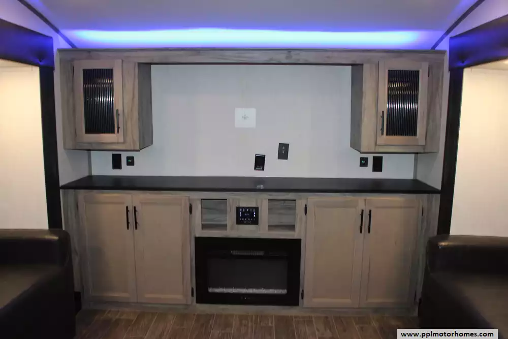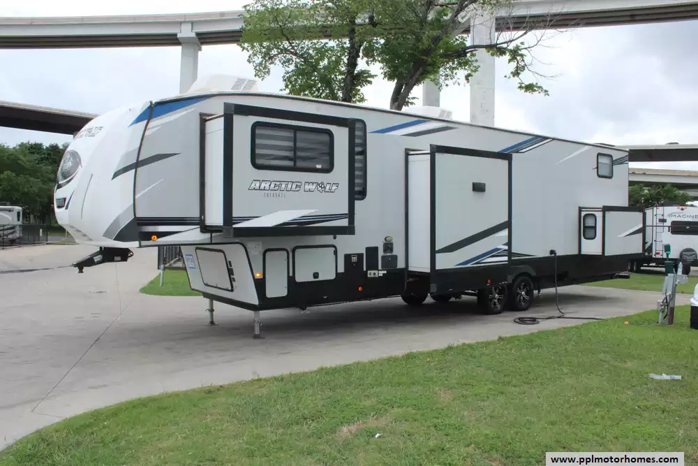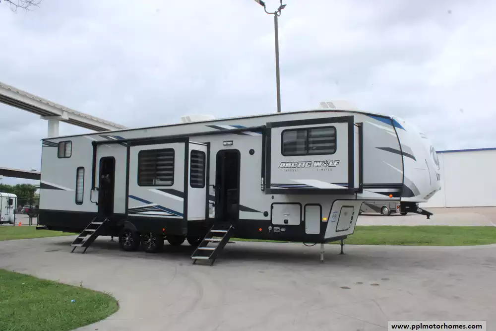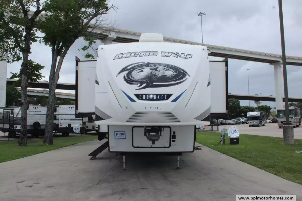 Experience the pinnacle of residential-style luxury on the road with this 2022 Cherokee Arctic Wolf 3990SUITE. Measuring an impressive 43 feet and featuring five massive slide-outs, this fifth wheel is renowned for its expansive interior and "suite-style" layout that provides unparalleled privacy and comfort. Built with a durable fiberglass exterior and a reliable rubber roof, the Arctic Wolf series is highly regarded for its superior insulation and four-season capabilities, making it a top choice for extended stays. The spacious living area is anchored by a cozy fireplace and dual ducted air conditioners, ensuring a perfectly climate-controlled environment whether you are relaxing in front of one of the two included televisions or hosting guests in the airy, high-ceiling cabin.
