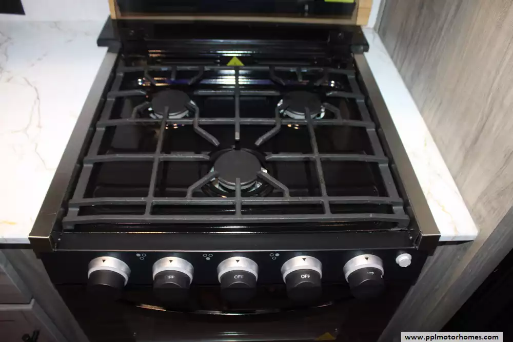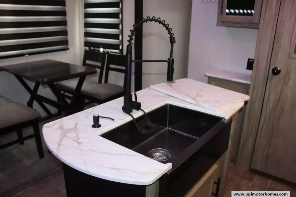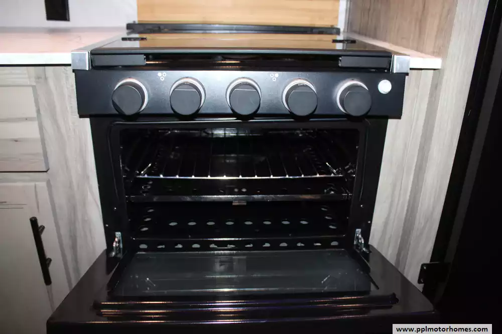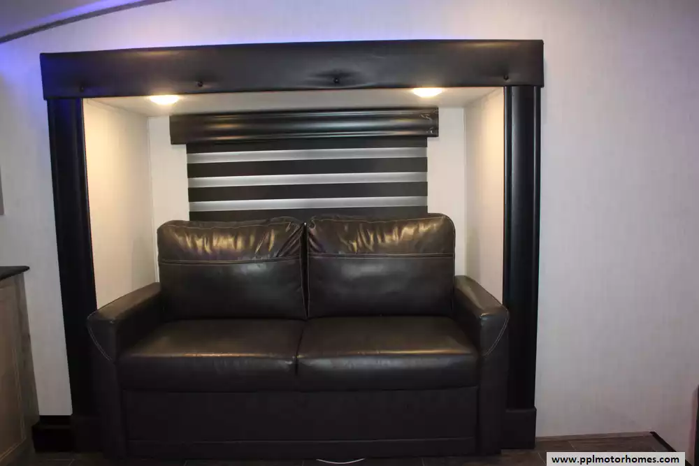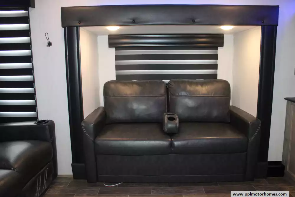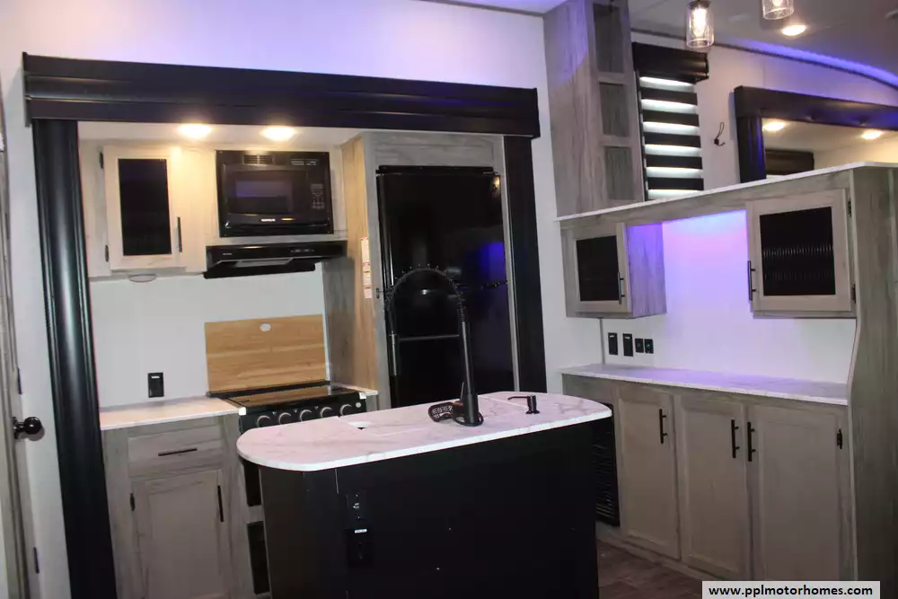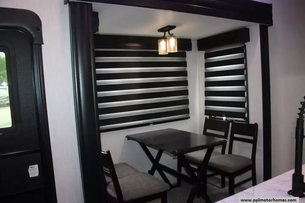 The gourmet-style kitchen is designed for the serious traveler, featuring a double-door residential GE refrigerator, a microwave, and a three-burner range with an oven. Transitioning to the outdoors is effortless with the automatic main awning and integrated outside speakers, creating the perfect setting for evening entertainment. This model also includes a convenient outside shower for quick clean-ups after a day of adventure. With its reputation for blending high-end amenities with rugged durability, this 3990SUITE offers a sophisticated retreat for those who want the comforts of home while exploring the great outdoors.