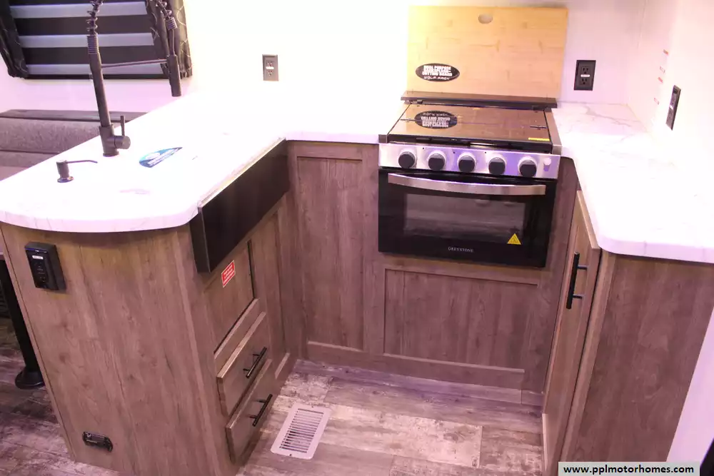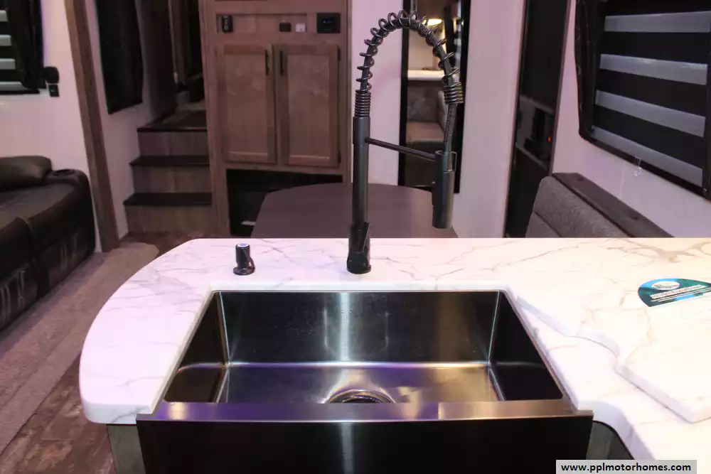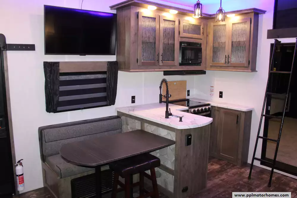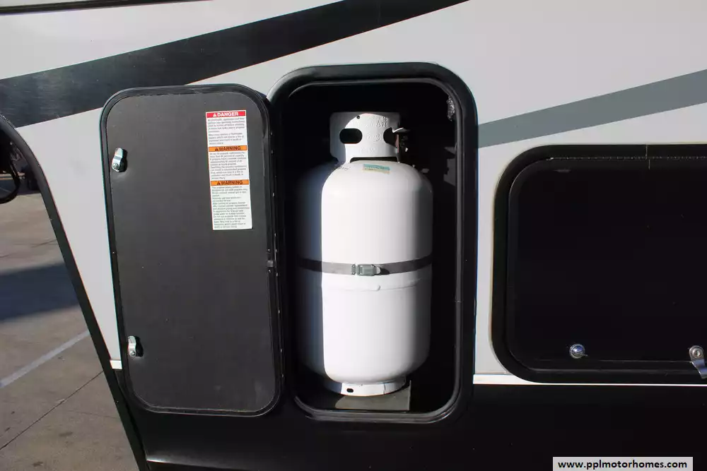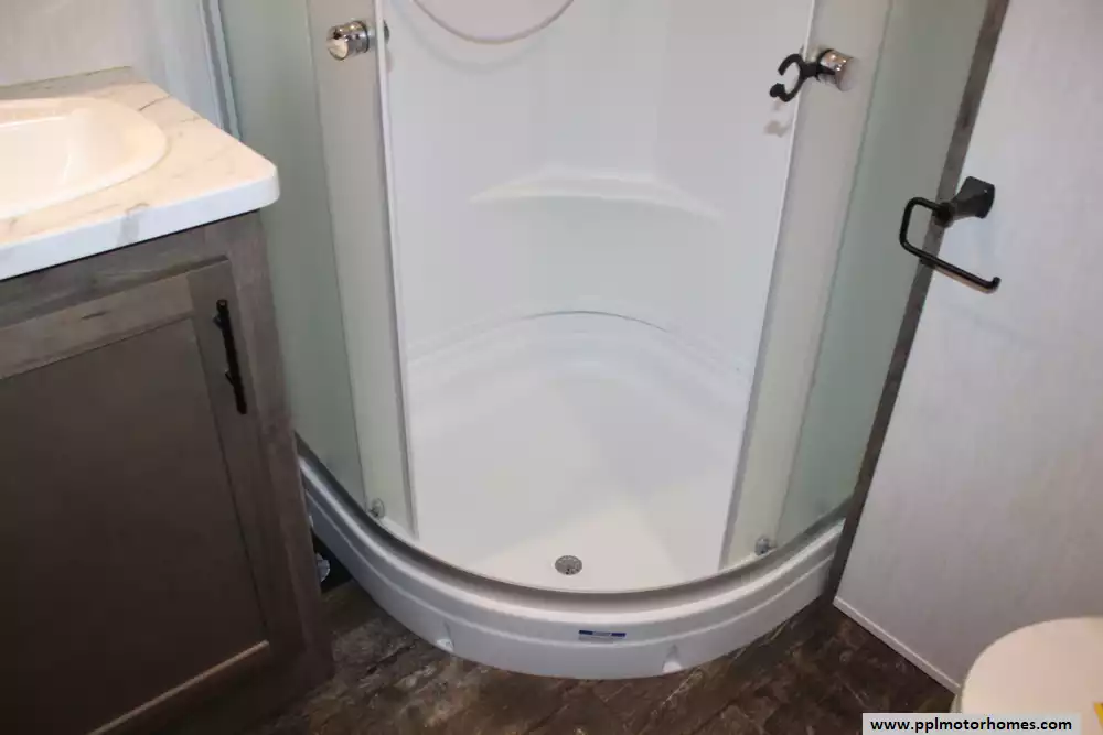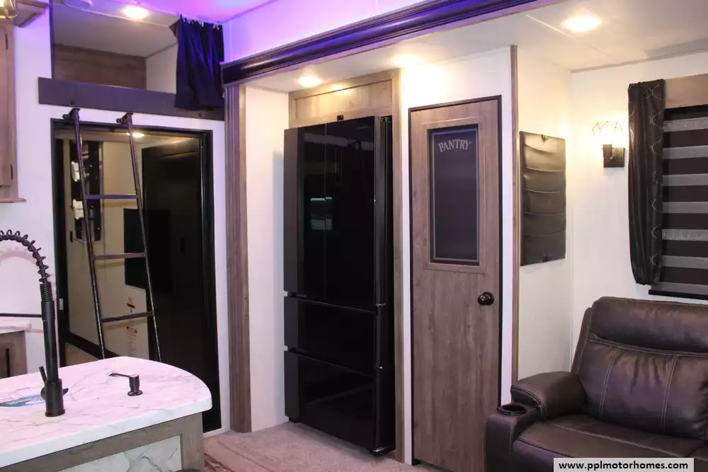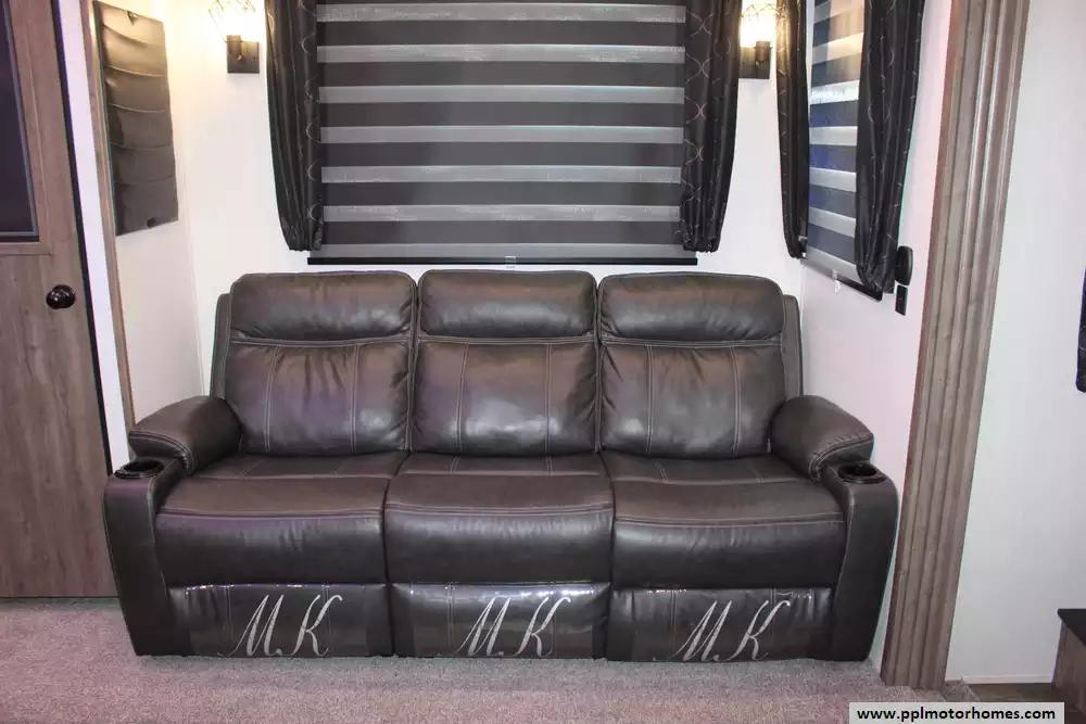 Specs: Length: 43.7 ft., Height: 13.5 ft., Payload Capacity: 4,382 lbs., Total Fresh Water Tank Capacity: 96 gal., Total Gray Water Tank Capacity: 76 gal., Total Black Water Tank Capacity: 76 gal.