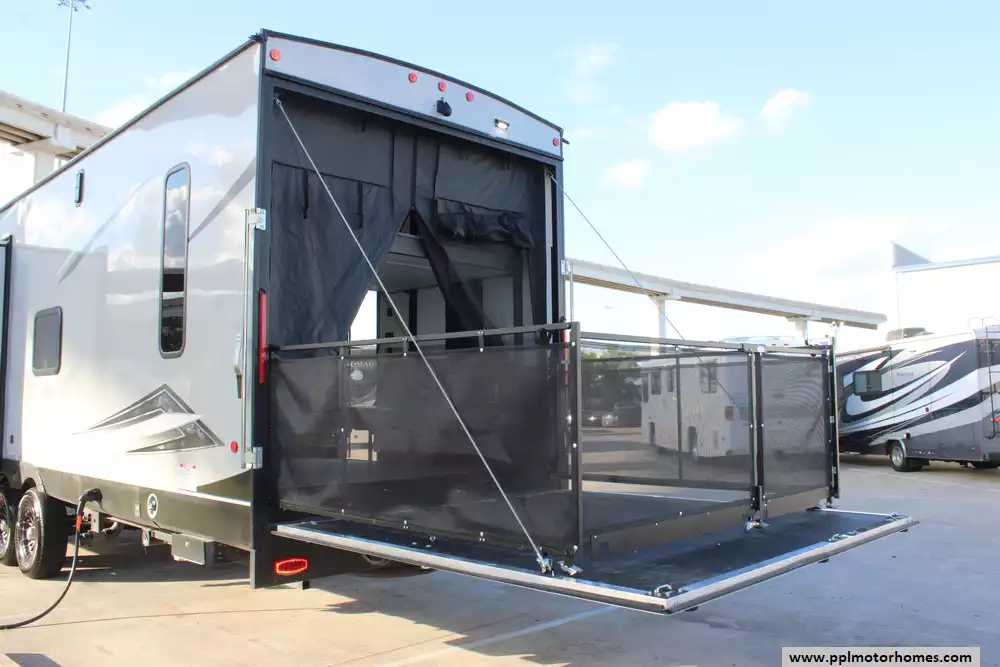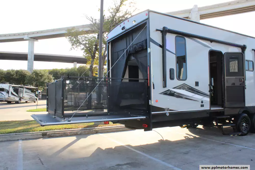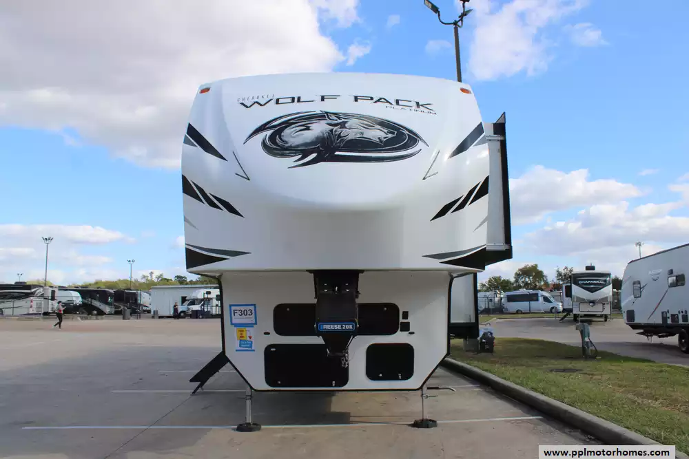 This 2022 Cherokee Wolf Pack 365PACK16 is a feature-rich, wide-body toy-hauler fifth wheel designed for adventure, gear, and comfort. It is well-suited for families, couples, or groups who want to camp in comfort. Amenities Include...Hydraulic Landing Gear, Floating Patio with Enclosure and Screen,2 Slide-outs, Upgrade 7000 Onan Gas Generator, 1 tank fueling station, 1 Non-Ducted And 2 Ducted Air Conditioner, Double Door 110v, 12volt Everchill Refrigerator, Automatic Main Awning, Washer/Dryer Connections, Solar Panel, Outside Speakers, 3 TVs, Outdoor Kitchen, Outside Shower, Microwave, 3 Burner Range, and Oven. Includes: Reese hitch and upgraded disc brakes.