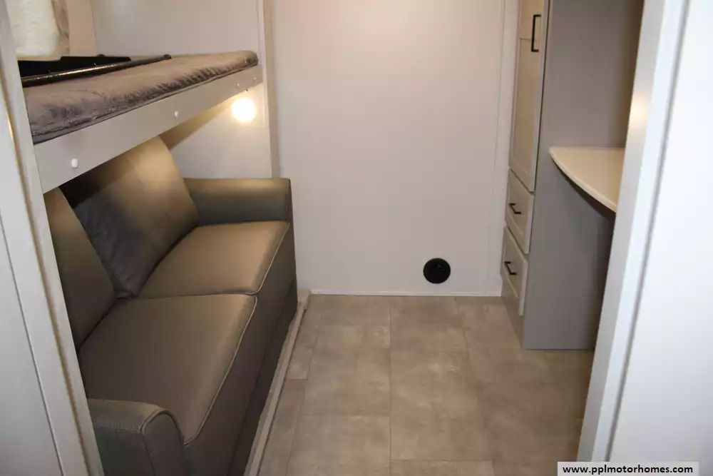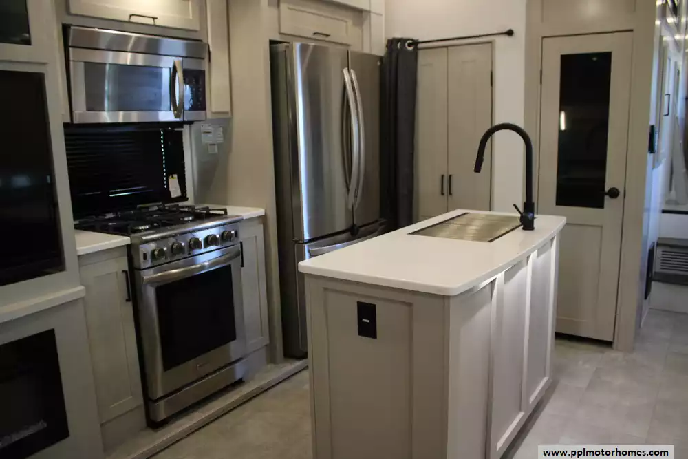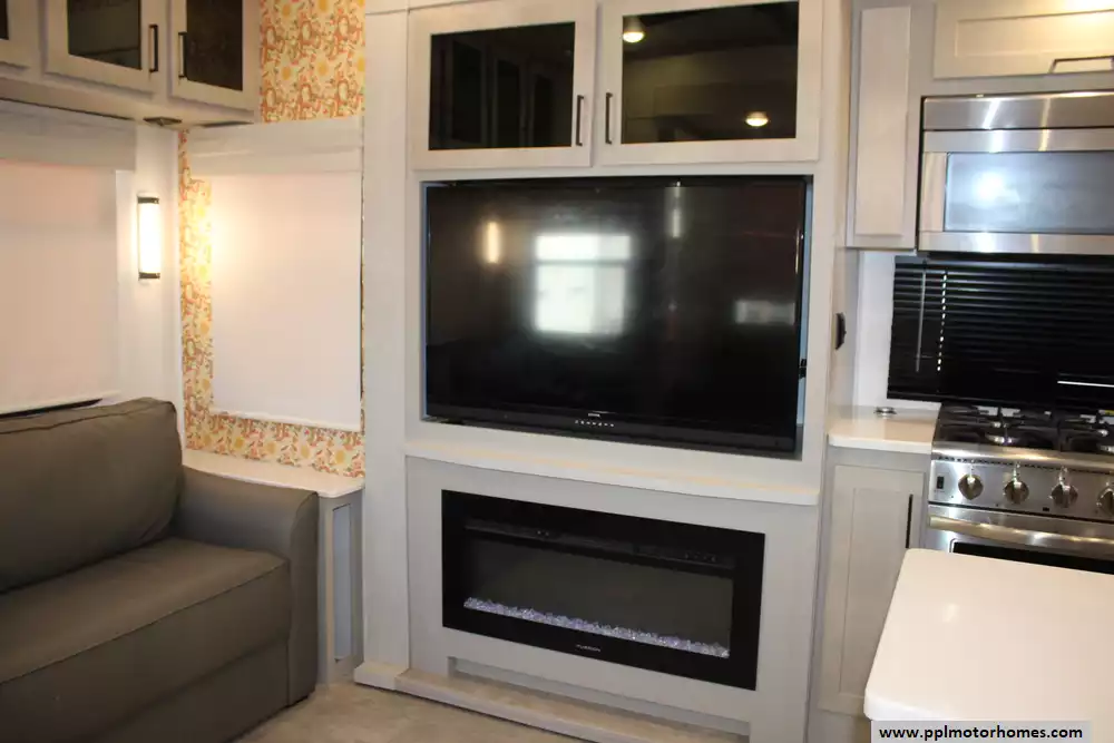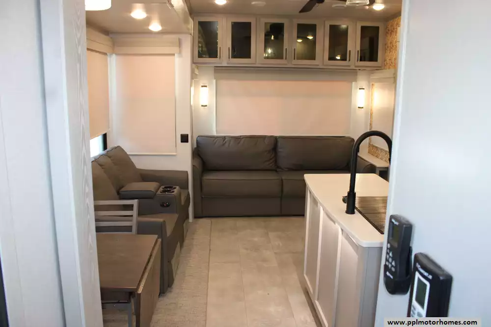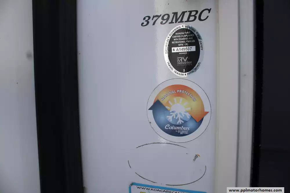 The 2022 Palomino Columbus C-Series 379MBC is a luxurious fifth wheel designed for families and full-time RVers seeking ample space and high-end amenities. Spanning 41 feet in length and featuring four slide-outs, this model offers a spacious interior with a rear living area, a central kitchen island, and a middle bunkhouse with a flip-up bunk and tri-fold sofa, ideal for children or guests. The front master suite includes a king-size bed, dual wardrobes, and a closet prepped for a washer/dryer. Additional highlights include a loft area for extra storage or sleeping space, a full bathroom with a spa-style shower, and a kitchen equipped with a four-burner cooktop, 20 cu. ft. residential refrigerator, and a walk-in pantry. Exterior features comprise dual 15,000 BTU air conditioners, two power awnings with LED lighting, an outdoor kitchen, and a 2-inch receiver hitch for towing. Constructed with a 101-inch wide body, MORryde CRE3000 suspension system, and R-40 roof insulation, the Columbus 379MBC ensures durability and comfort in various climates. With A brand-new roof, all it needs is a new owner!