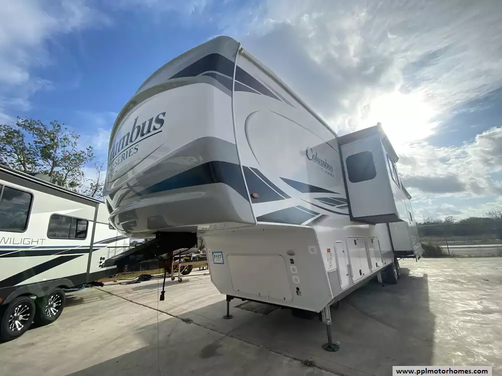 This 2022 Columbus C 383FBC has a 4 Slide-outs, 2 Ducted Air Conditioners, Double Door Residential Lg Refrigerator, In-Fridge Ice Maker, Automatic Main Awning And Slide Awning, Washer/Dryer, Heated Tanks, TV, Outside Shower, Fireplace, Convection Microwave, 4 Burner Range