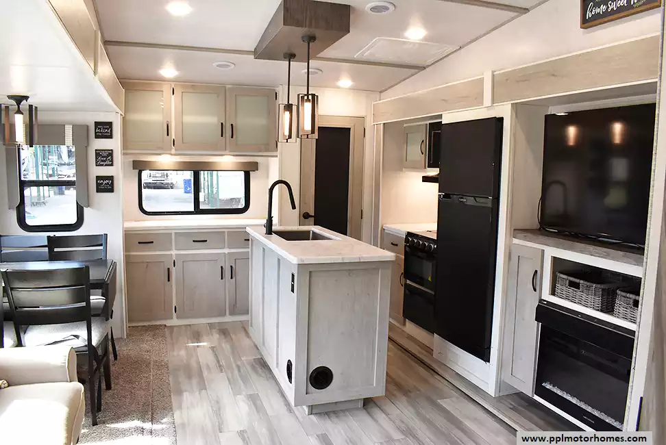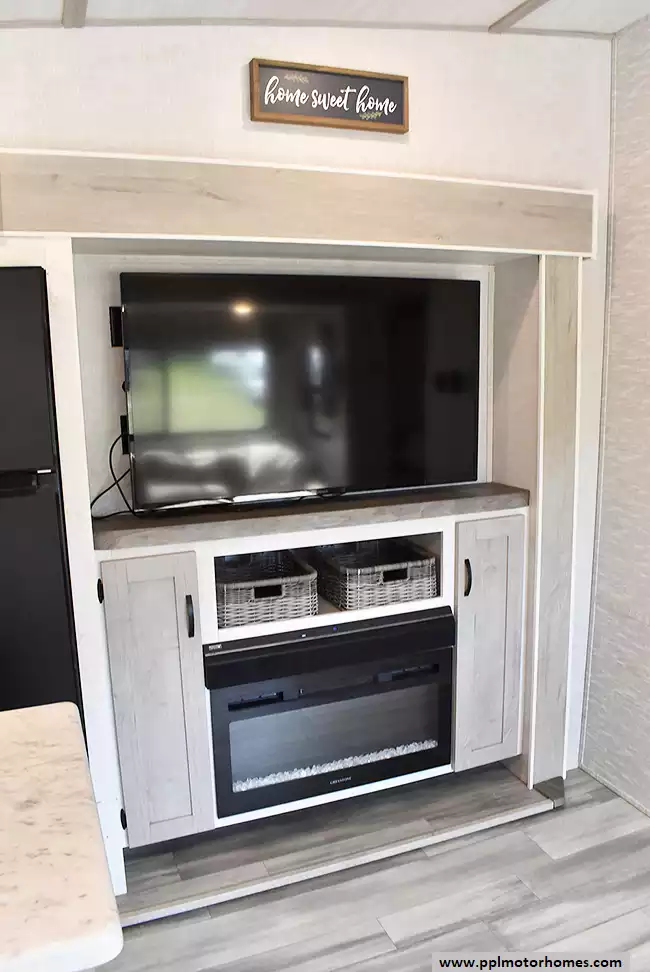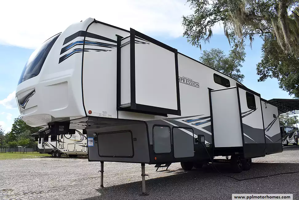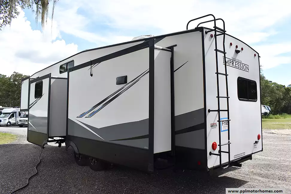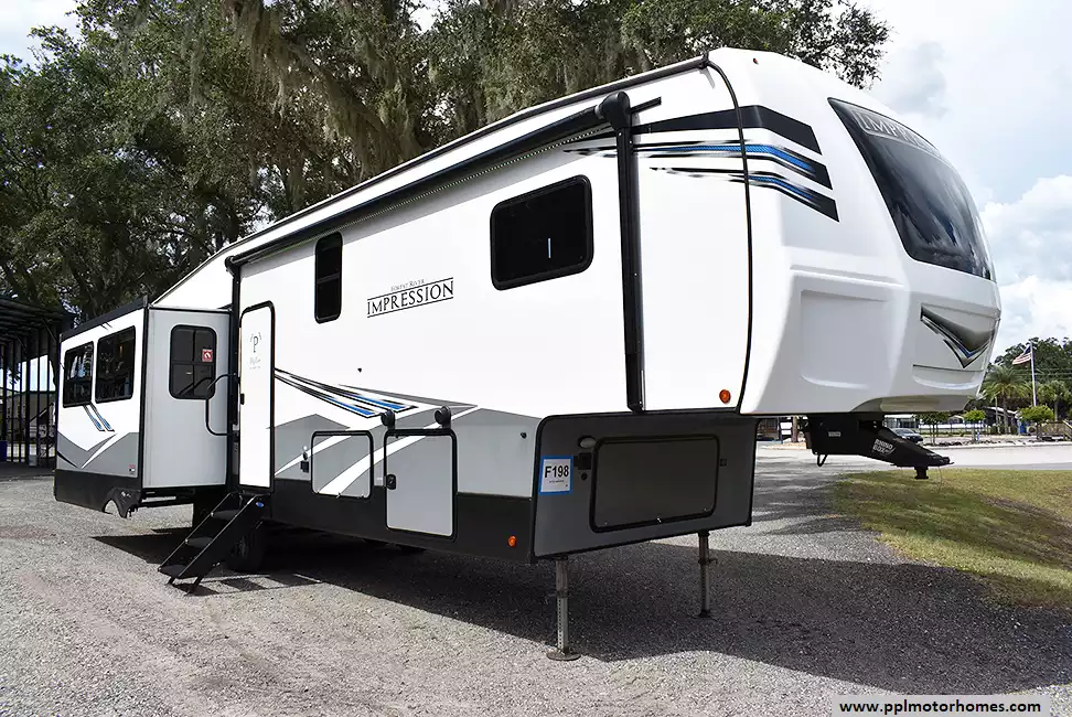 This 2022 Impression 315MB has an Electric Landing Gear, 4 Slide-outs, 2 Ducted Air Conditioners, Double Door 12v Furrion Refrigerator, Automatic Main Awning, Heated Tanks, Outside Speakers, 2 TVs, Outside Shower, Fireplace, Microwave, 3 Burner Range, Oven