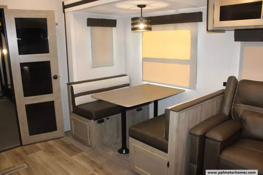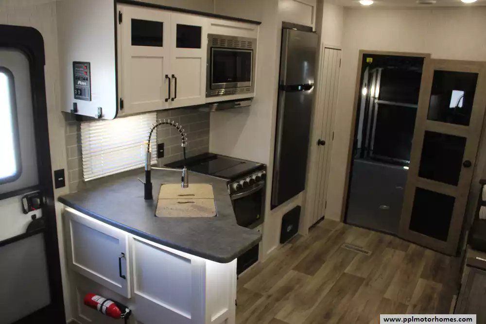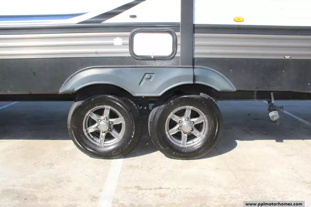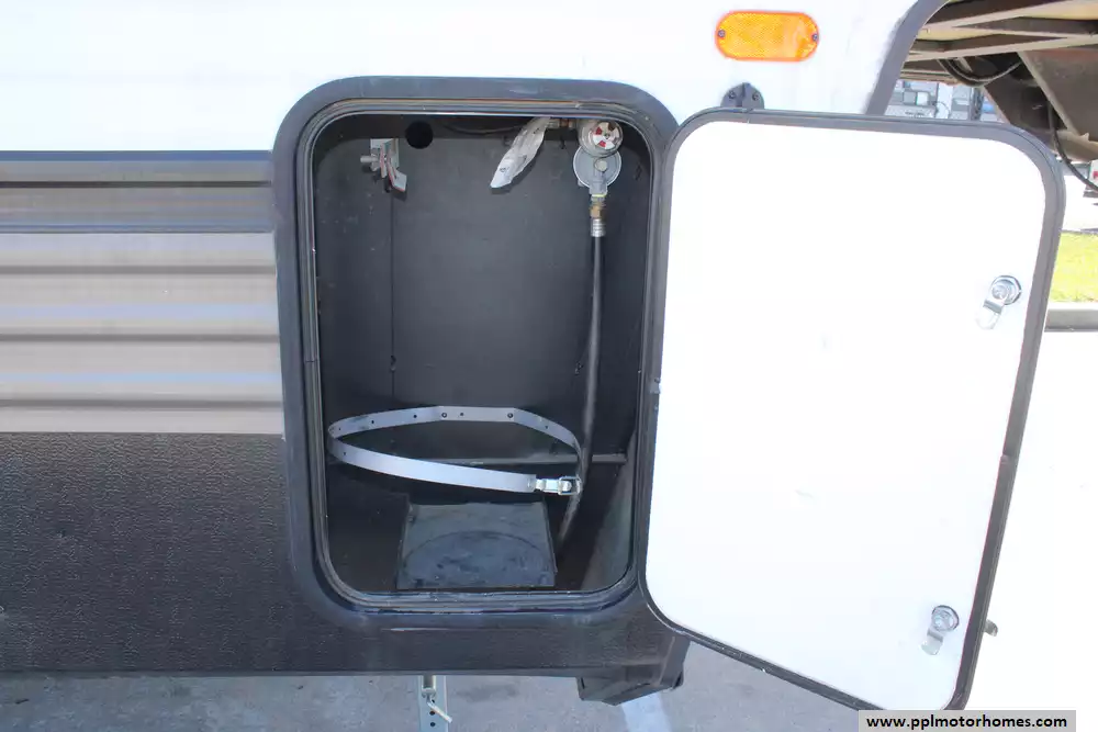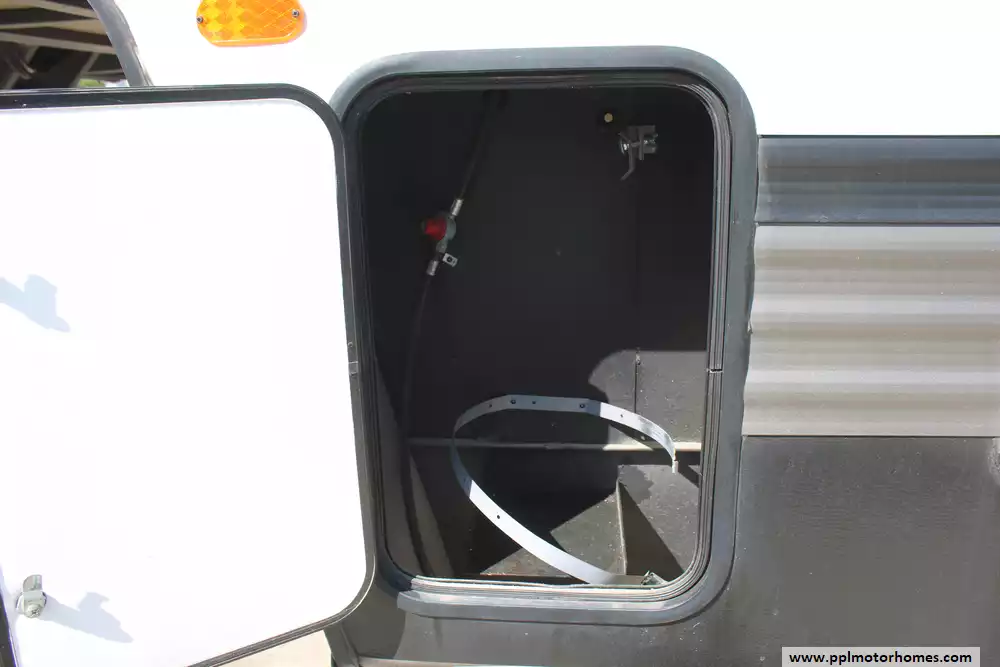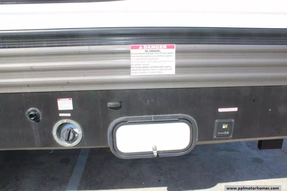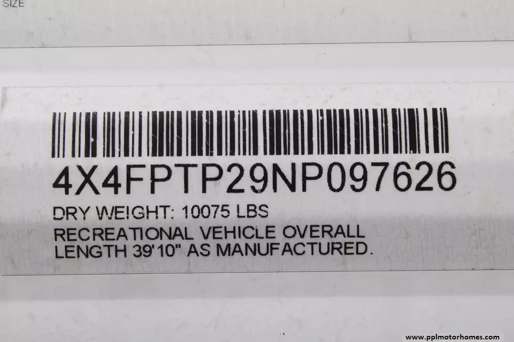 Specs: Length: 39.10 ft., Width: 8 ft., Height: 12.8 ft., Interior Height: 6.8 ft., Total Fresh Water Tank Capacity: 98 gal., Total Grey Tank Capacity: 69 gal., Total Black Water Tank Capacity: 34.5 gal., Total Propane Tanks: 2, Total Propane Tank Capacity: 20 lbs.