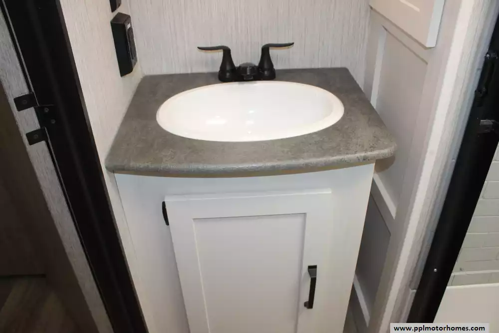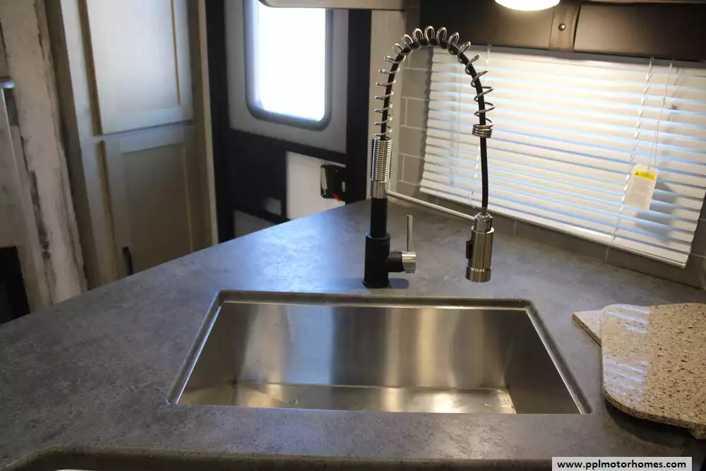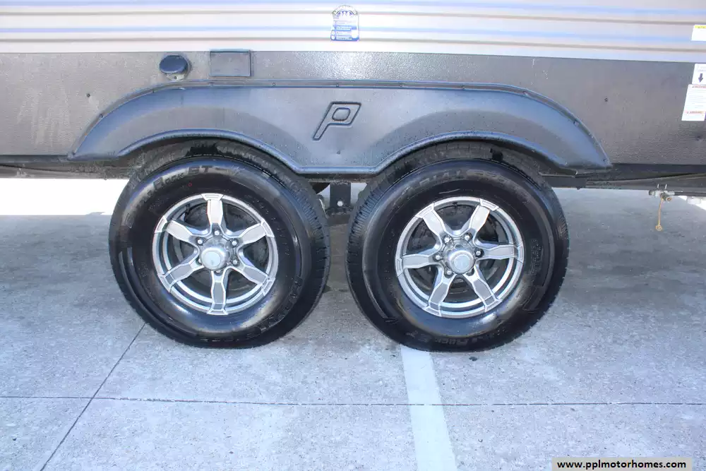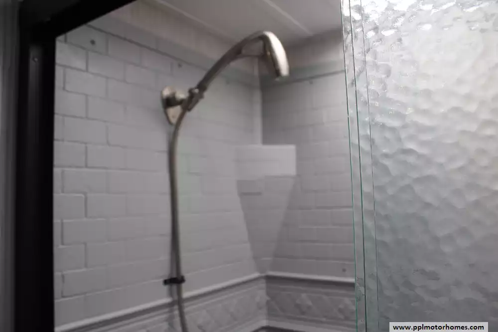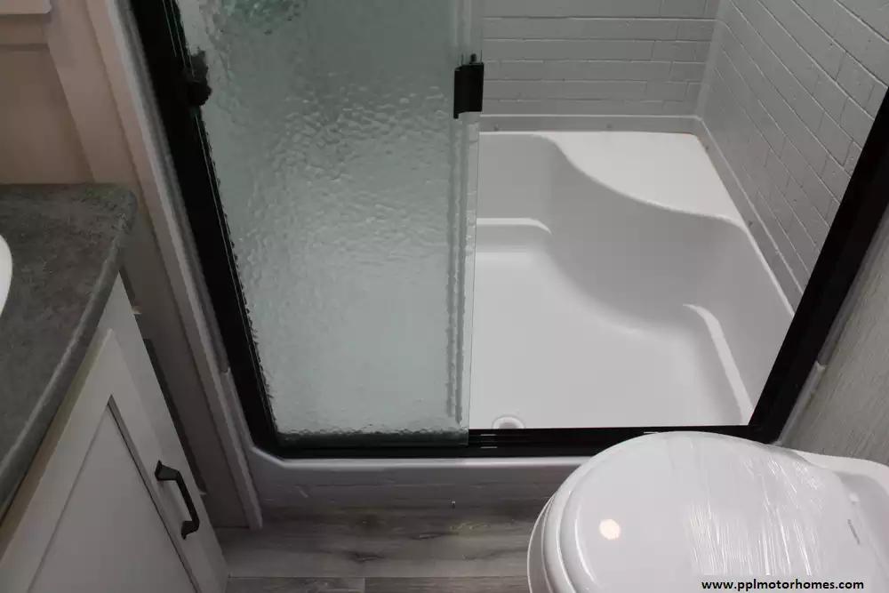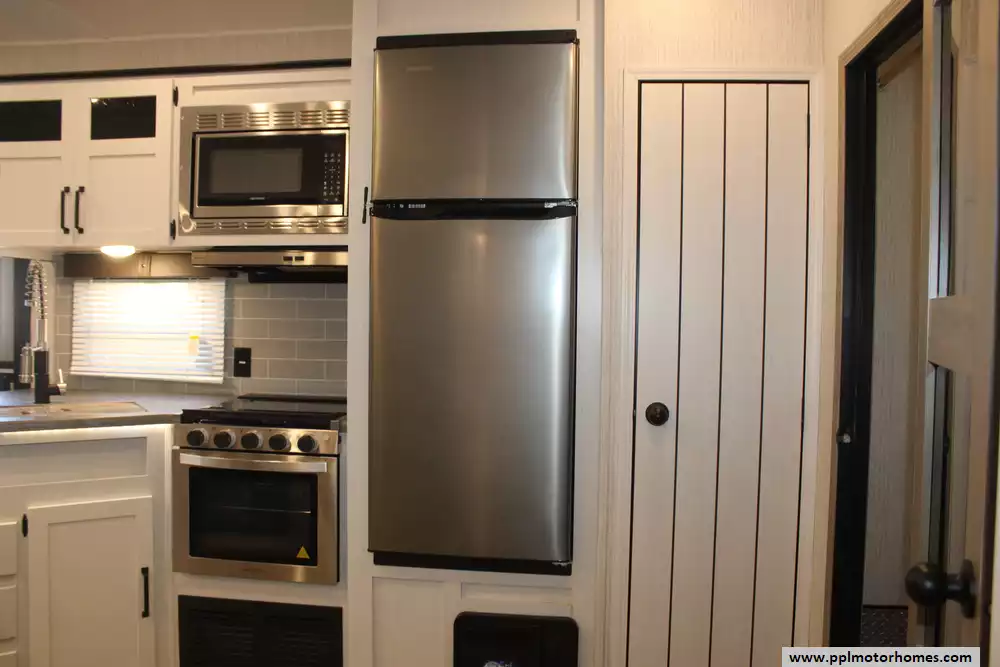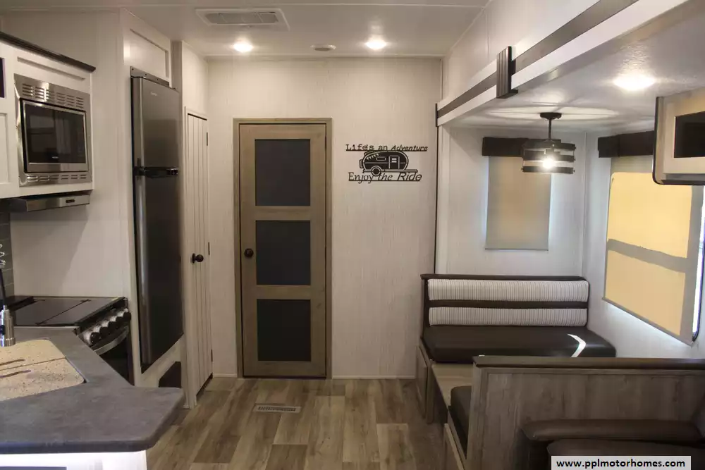 Specs: Length: 39.10 ft., Width: 8 ft., Height: 12.8 ft., Interior Height: 6.8 ft., Total Fresh Water Tank Capacity: 98 gal., Total Grey Tank Capacity: 69 gal., Total Black Water Tank Capacity: 34.5 gal., Total Propane Tanks: 2, Total Propane Tank Capacity: 20 lbs.