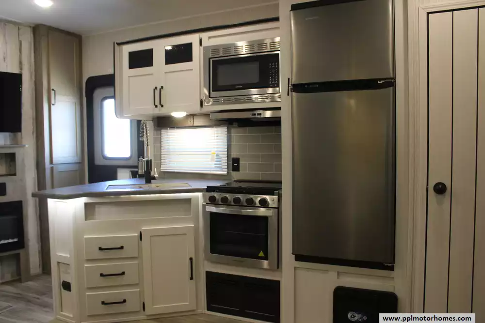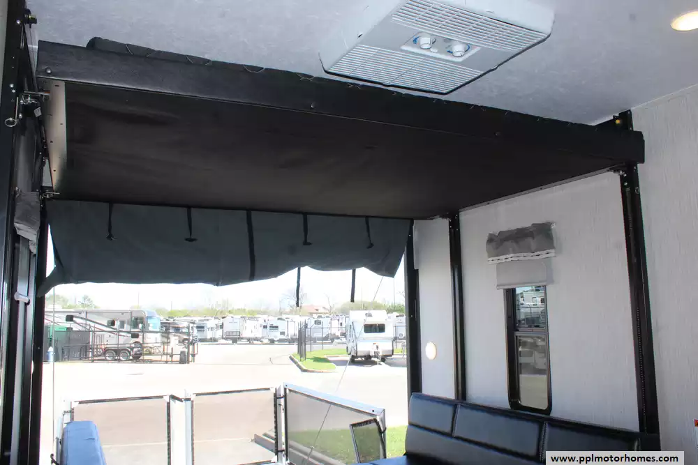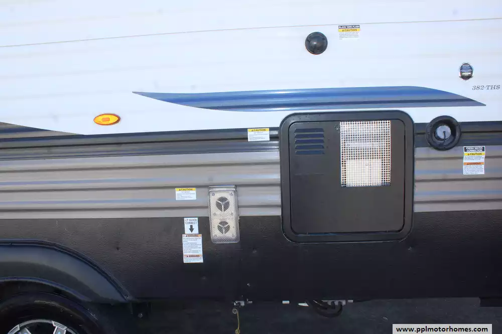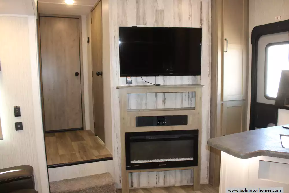 The interior is thoughtfully designed for relaxation, anchored by a large slide-out that opens up the living area and a cozy fireplace that serves as a beautiful focal point. The kitchen is fully equipped for any culinary need with a three-burner range, oven, microwave, and a high-capacity double-door Everchill refrigerator. Stay perfectly cool in any climate with a dual cooling system featuring both a ducted and a non-ducted air conditioner. Entertainment is effortless with two TVs included, while the outside speakers and automatic main awning create an inviting outdoor living space. Complete with an outside shower for quick clean-ups after a day of adventure, this 382THS is a premier choice for travelers who want to bring the comforts of home to the great outdoors.