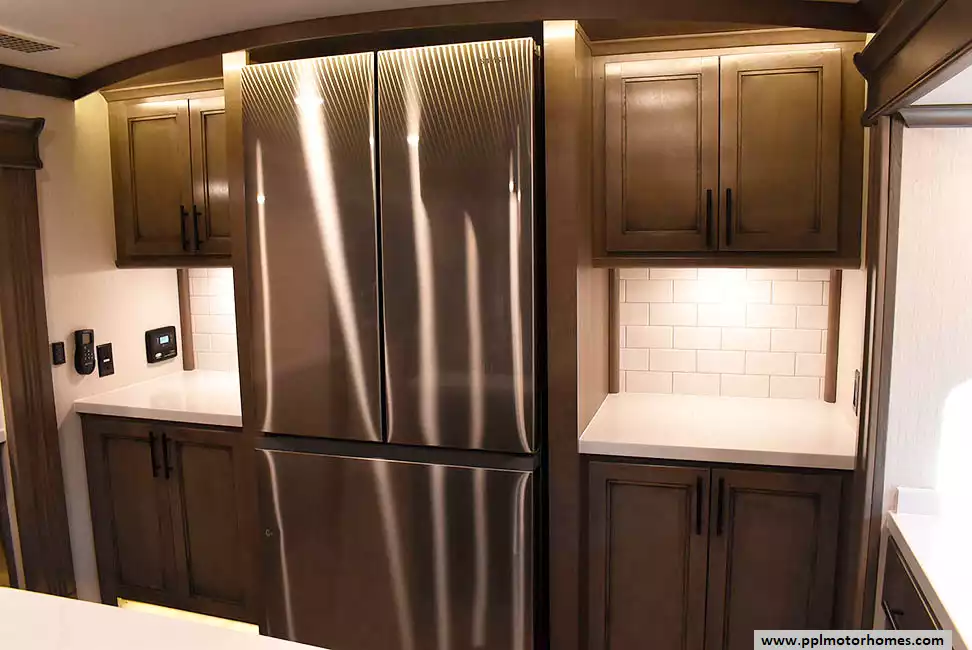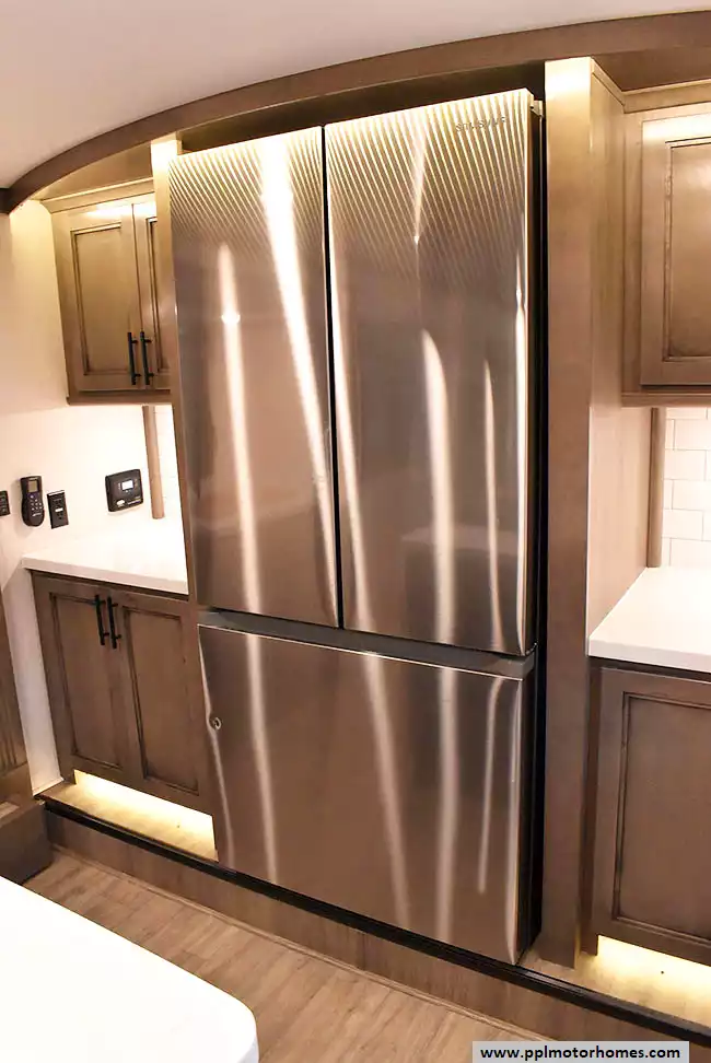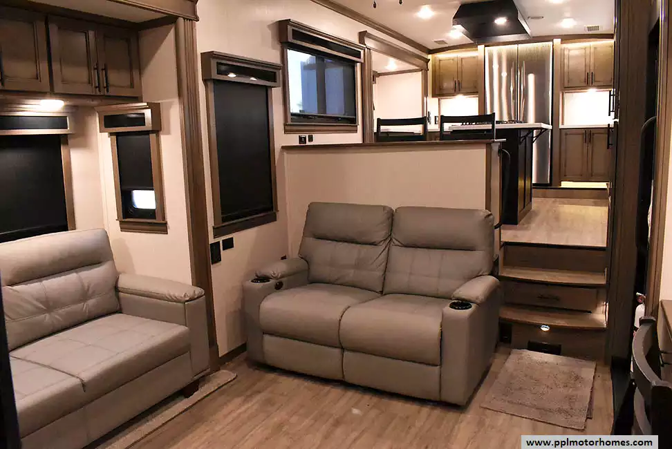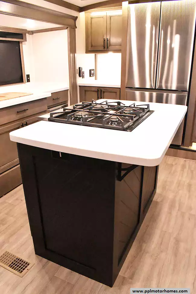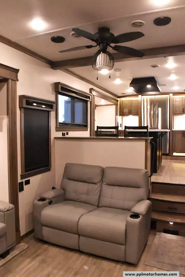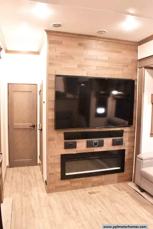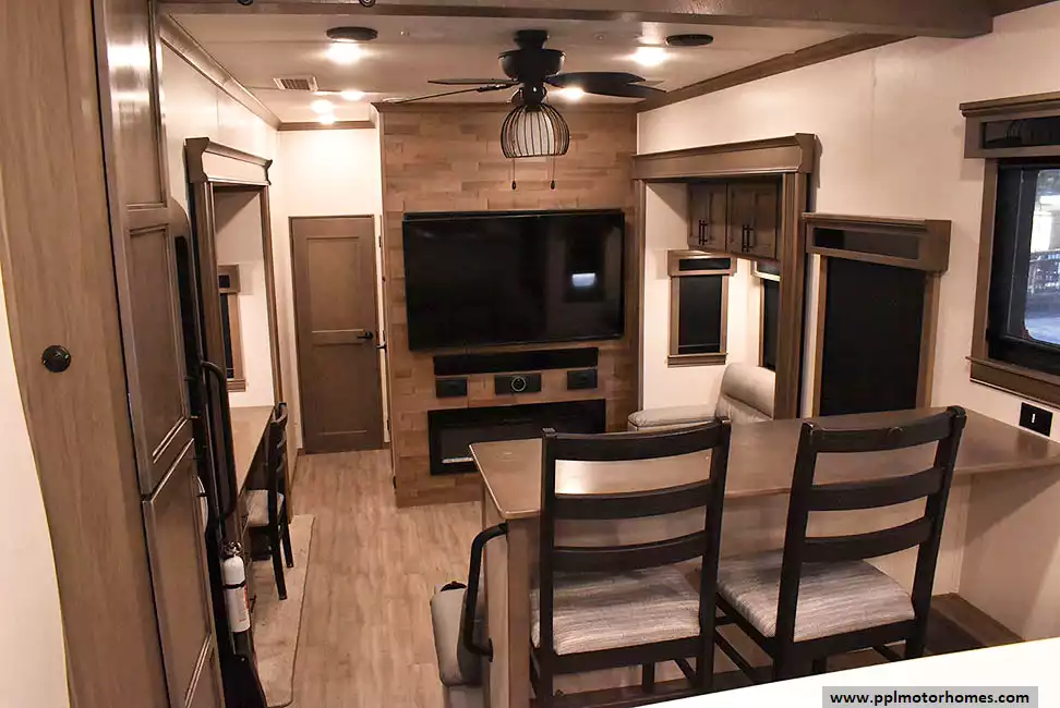This 2022 Riverstone 391FSK has a Hydraulic Landing Gear, 5 Slide-outs, 3 Ducted Air Conditioners, Residential Samsung Refrigerator, In-Fridge Ice Maker, Automatic Main Awning, Washer/Dryer, Solar Panel, Dishwasher, Outside Entertainment System, 3 TVs, Outside Shower, Fireplace, Microwave, 4 Burner Range, Oven