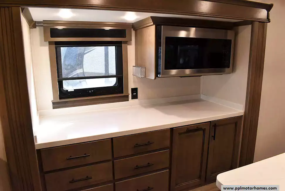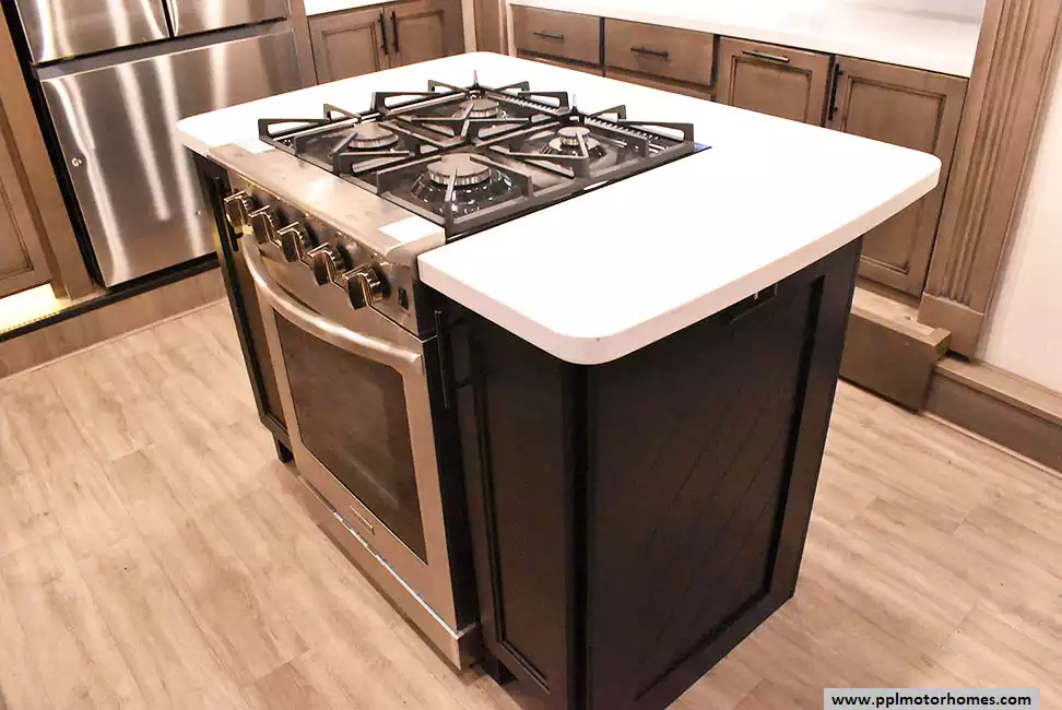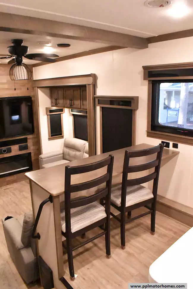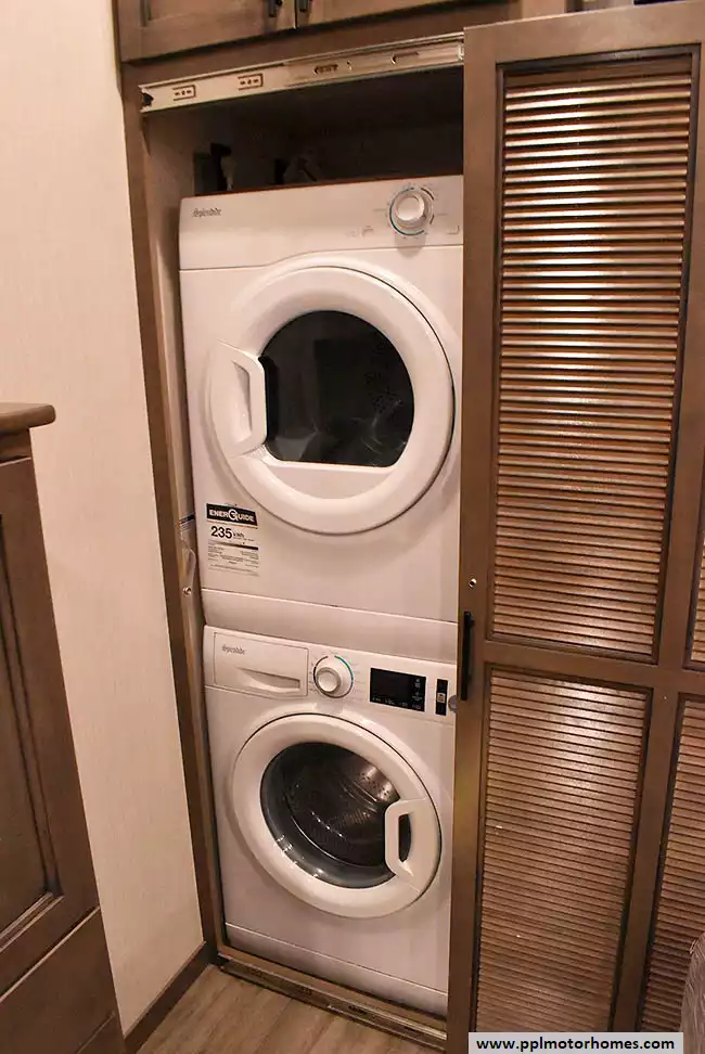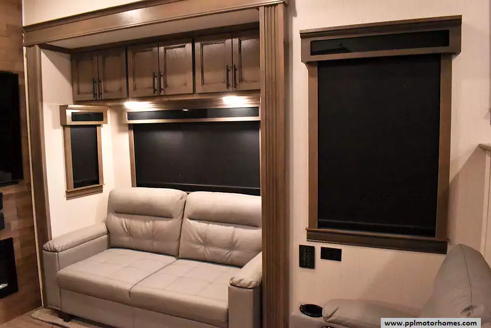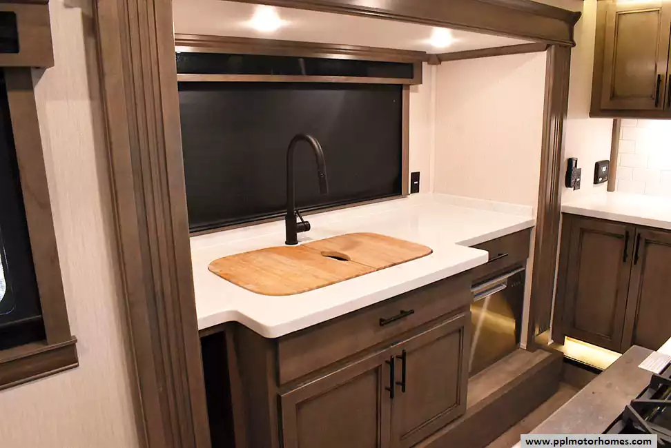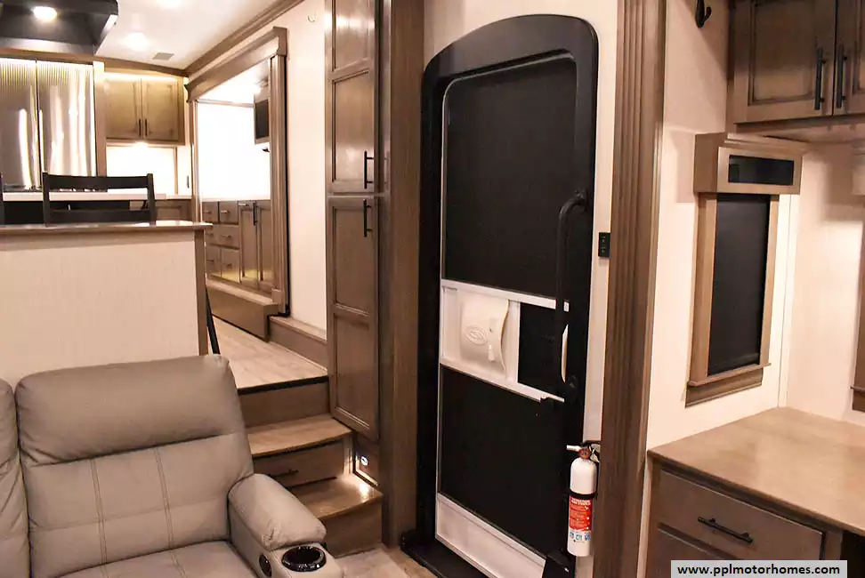 This 2022 Riverstone 391FSK has a Hydraulic Landing Gear, 5 Slide-outs, 3 Ducted Air Conditioners, Residential Samsung Refrigerator, In-Fridge Ice Maker, Automatic Main Awning, Washer/Dryer, Solar Panel, Dishwasher, Outside Entertainment System, 3 TVs, Outside Shower, Fireplace, Microwave, 4 Burner Range, Oven