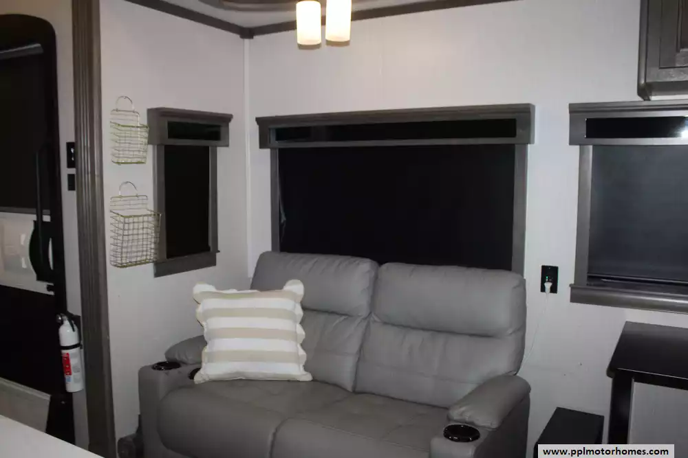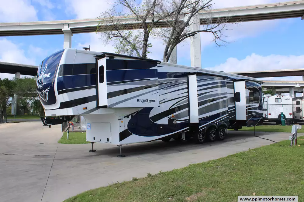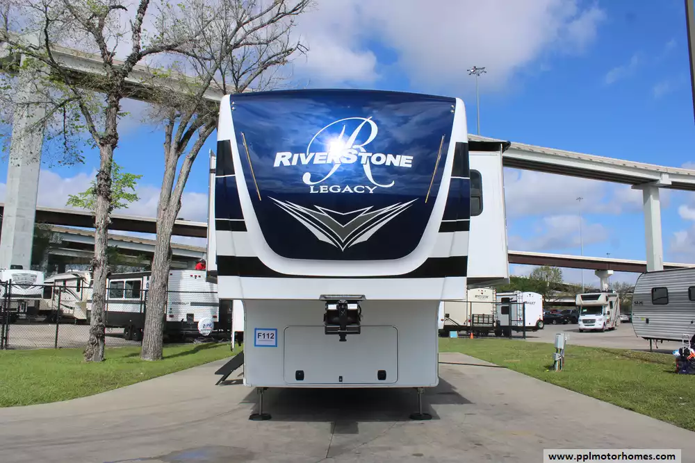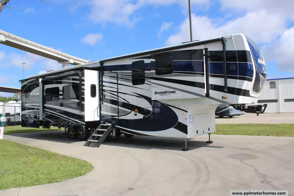 Elevate your travel experience with this 2022 Riverstone Legacy 442MC, a 45-foot masterpiece engineered for the ultimate in luxury and long-term residency. Renowned for its superior residential-grade construction, this model features three-inch thick hung glass exterior walls and high-performance insulation that provides a whisper-quiet interior and exceptional temperature control throughout the year. As part of the prestigious Legacy line, this fifth wheel is built on a robust wide-body chassis and features a six-point hydraulic leveling system, offering a stable and sophisticated foundation that truly feels like a custom home on wheels.
