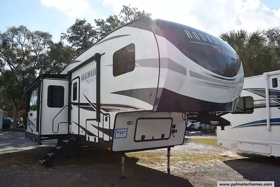 This 2022 Rockwood by Forest River 2883WS has an Electric Landing Gear, 3 Slide-outs, 2 Ducted Air Conditioners, 4 Door Gas/12v Norcold Refrigerator, Automatic Main Awning And Slide Awning, Outside Speakers, TV, DVD Player, Outside Shower, Fireplace, Microwave, 3 Burner Range, Oven