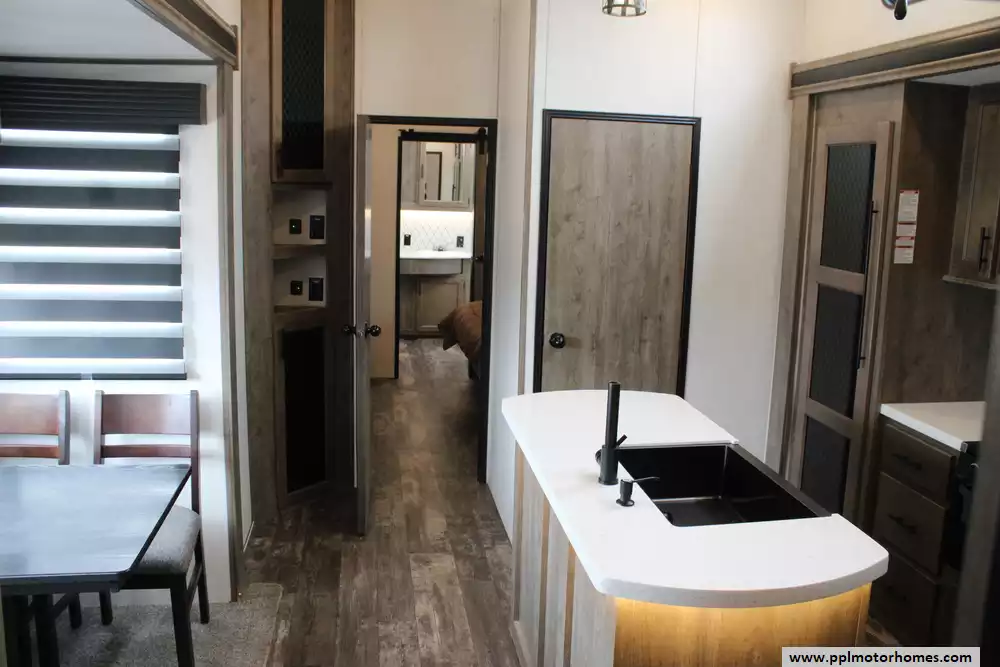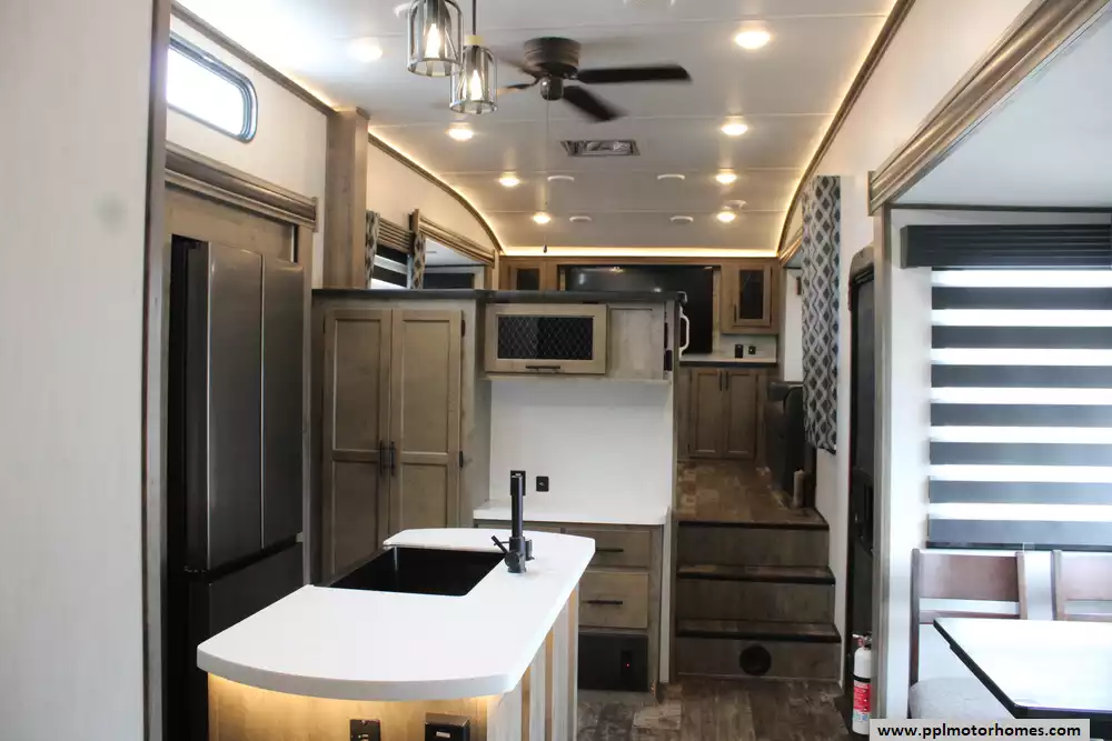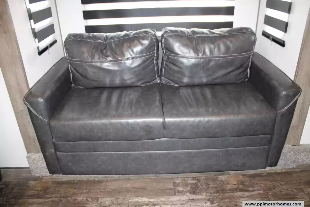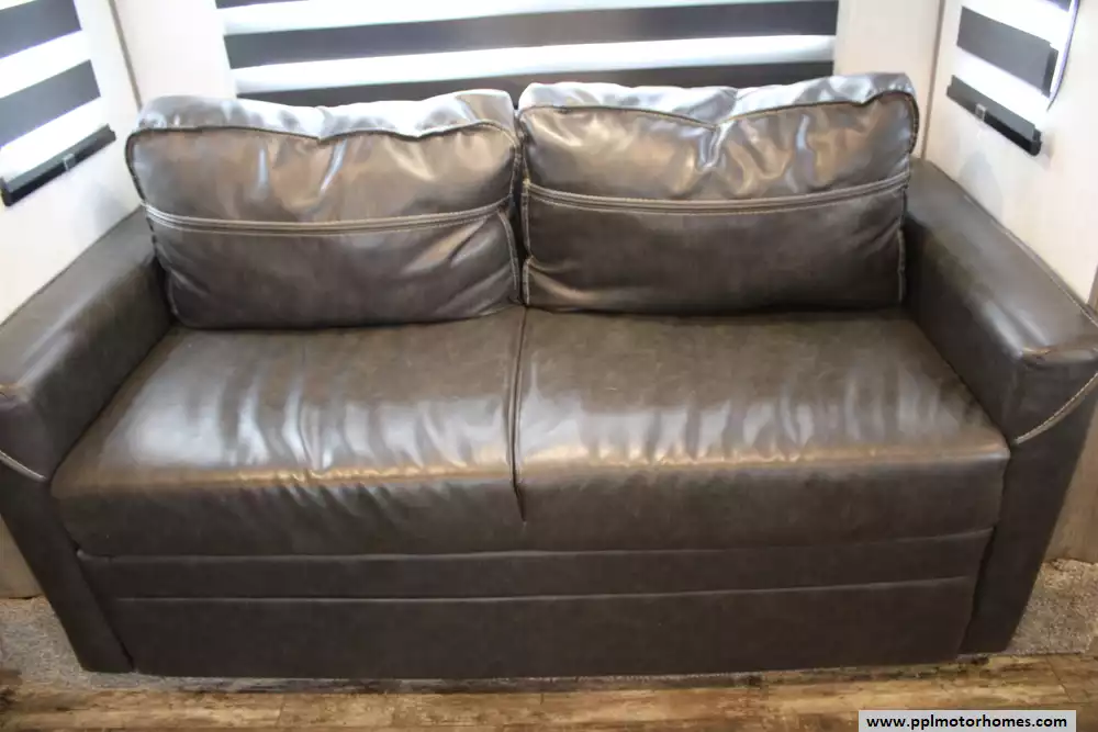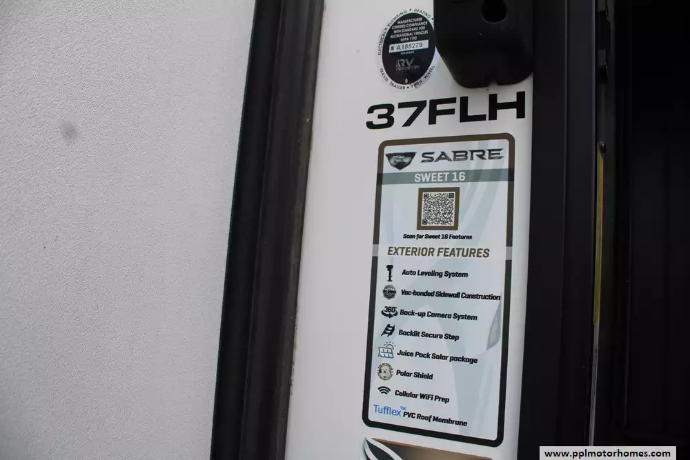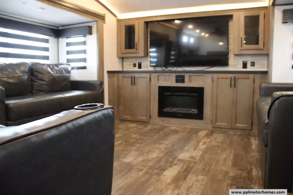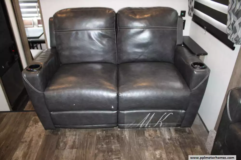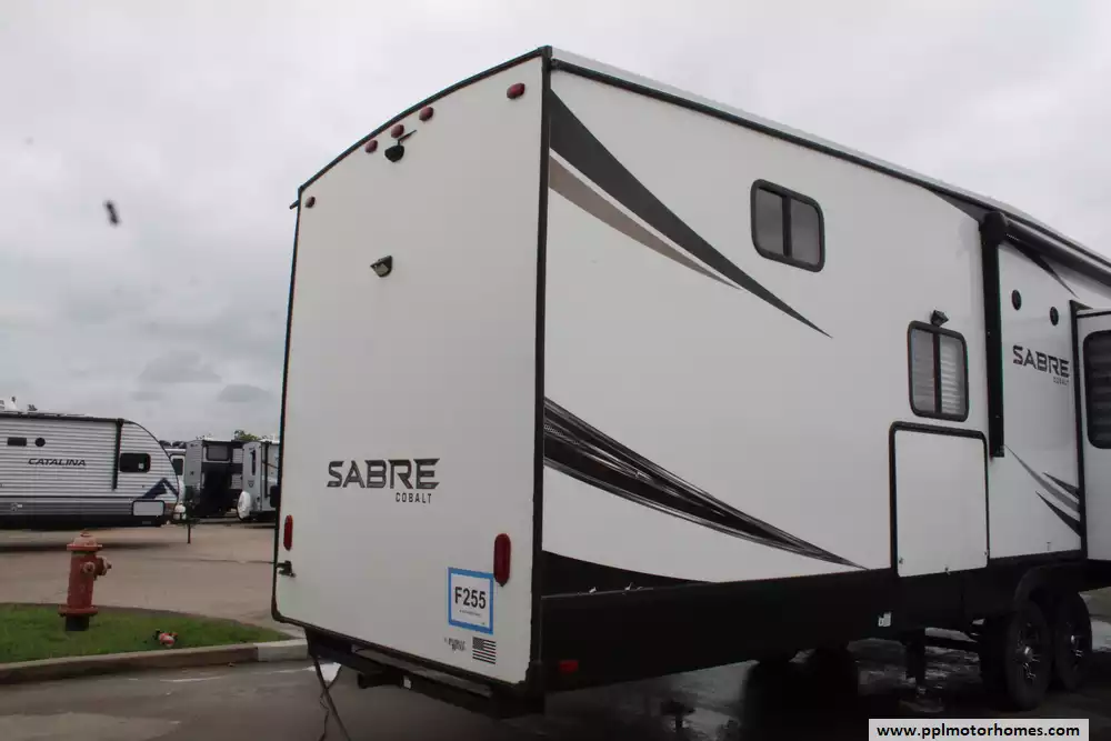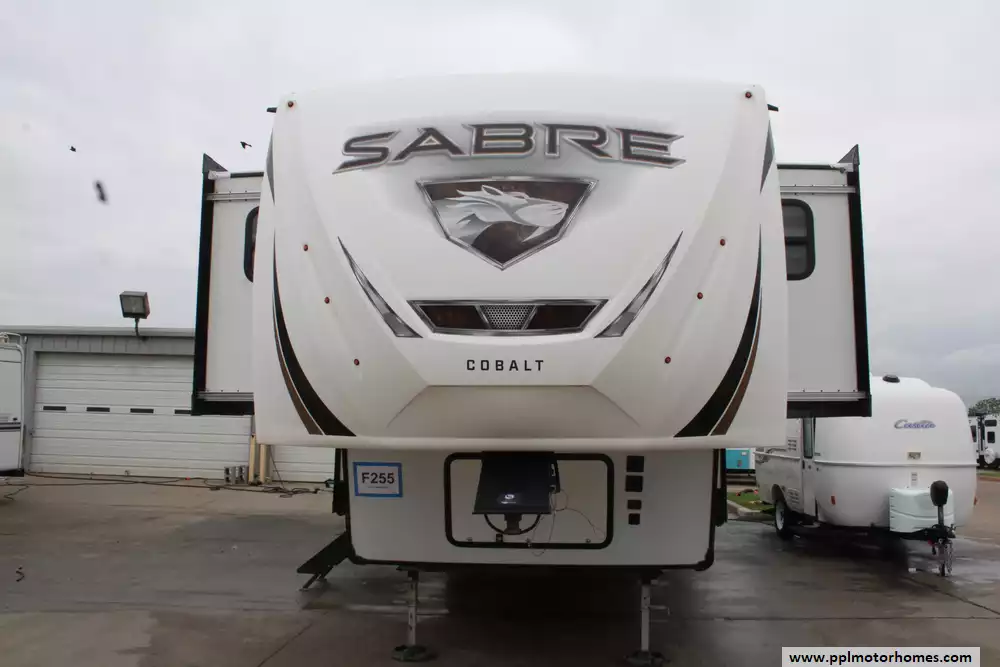 The 2022 Forest River Sabre Cobalt 37FLH is a spacious and upscale fifth-wheel RV designed for extended stays or full-time living, featuring a distinctive front living room layout that creates a residential-style gathering space with dual sofas and theater seating. Measuring just over 42 feet in length with five slide-outs, it offers an open, comfortable interior that can sleep up to six to people, along with a private master suite and the convenience of a bath-and-a-half floorplan.