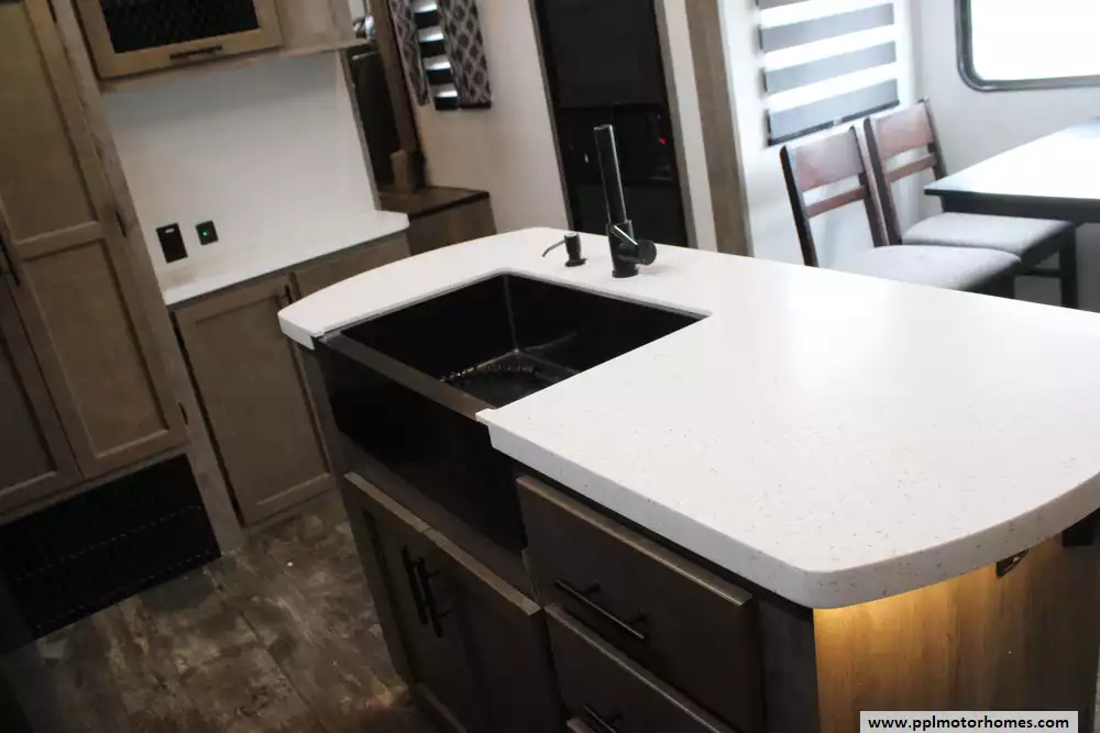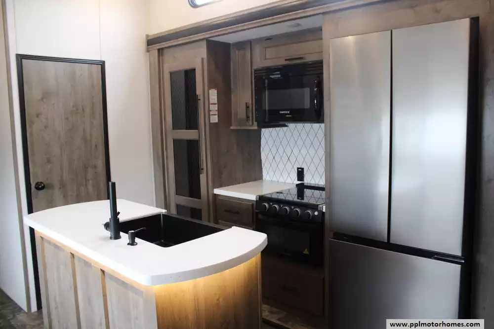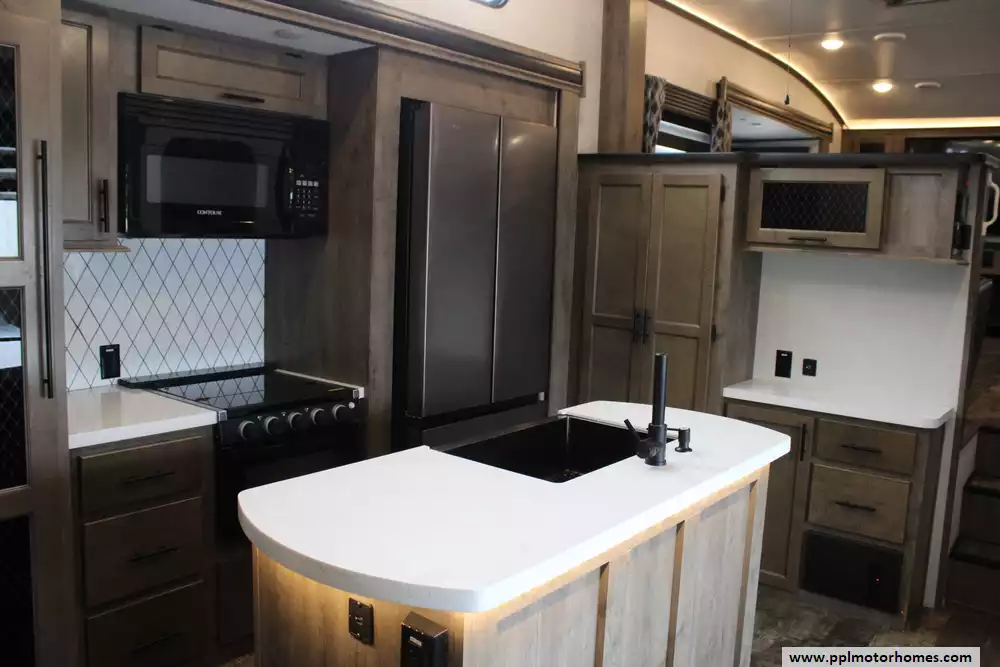 The central kitchen is fully equipped with residential appliances, solid-surface countertops, and ample storage, while premium touches like a fireplace, entertainment center, and dual air conditioning units enhance comfort. Built with aluminum framing and fiberglass sidewalls, it also includes large holding tanks, generous storage, and modern amenities, making it a well-rounded choice for travelers seeking a blend of luxury, functionality, and home-like living on the road. This model has a brand-new roof and is equipped with the "Juice Pack Solar Package" and the "Polar Shield" Let the memories begin!