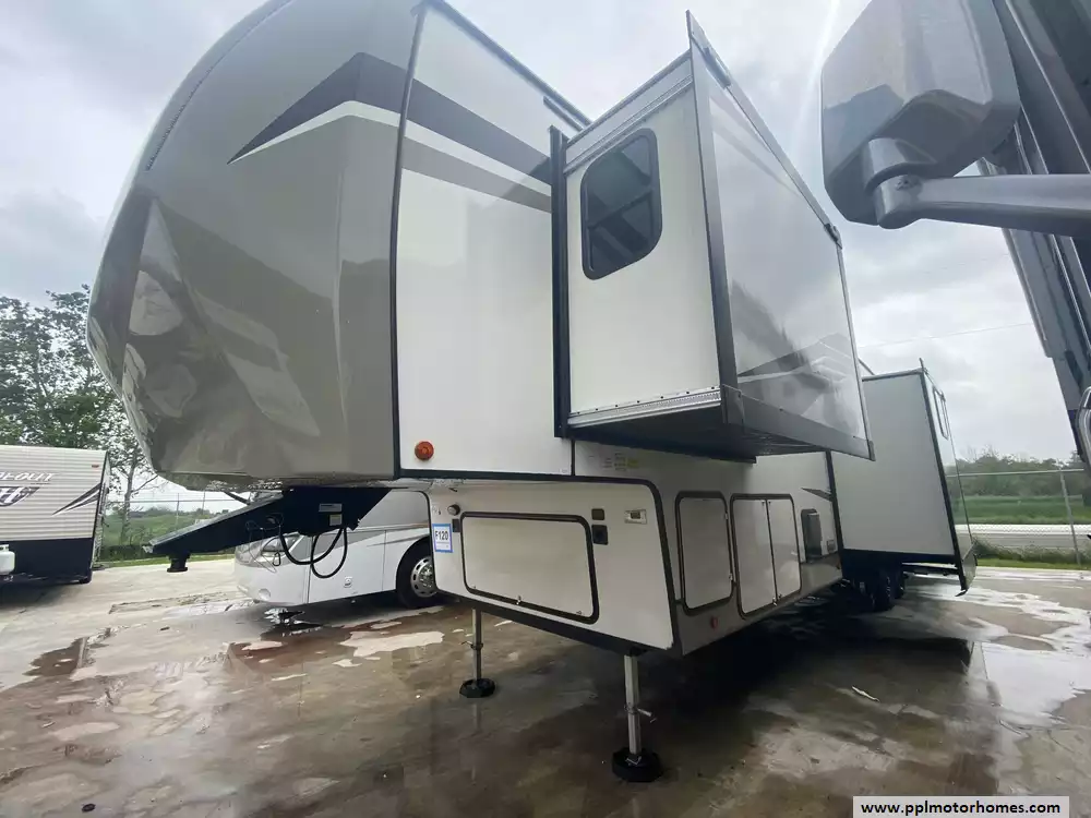 This 2022 Wildwood Heritage Glenn 369BL has an Electric Landing Gear, 4 Slide-outs, 2 Ducted Air Conditioners, 4 Door 12v Furrion Refrigerator (Additional Refrigerator Present), Automatic Main Awning, Washer/Dryer, Solar Panel, Heated Tanks, Outside Speakers, TV, DVD Player, Outside Shower, Fireplace, Microwave, 3 Burner Range, Oven