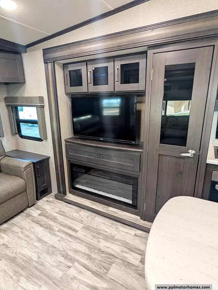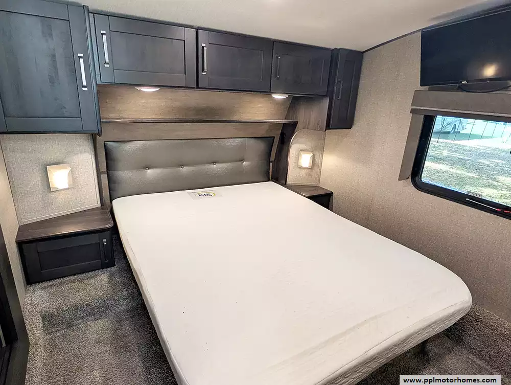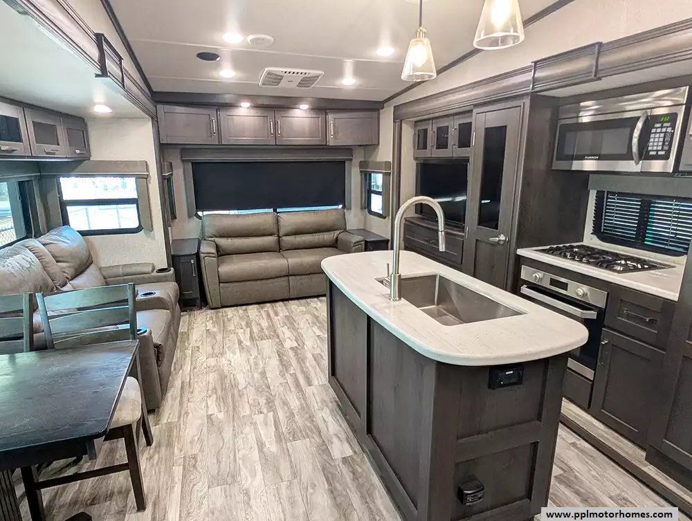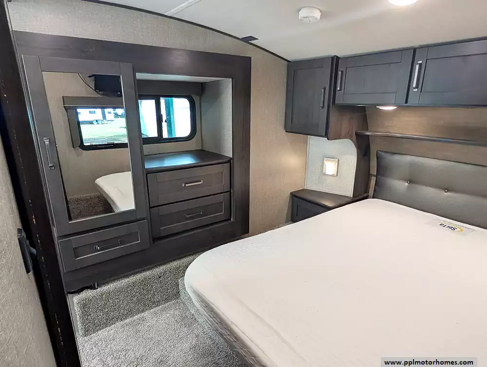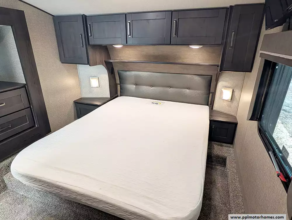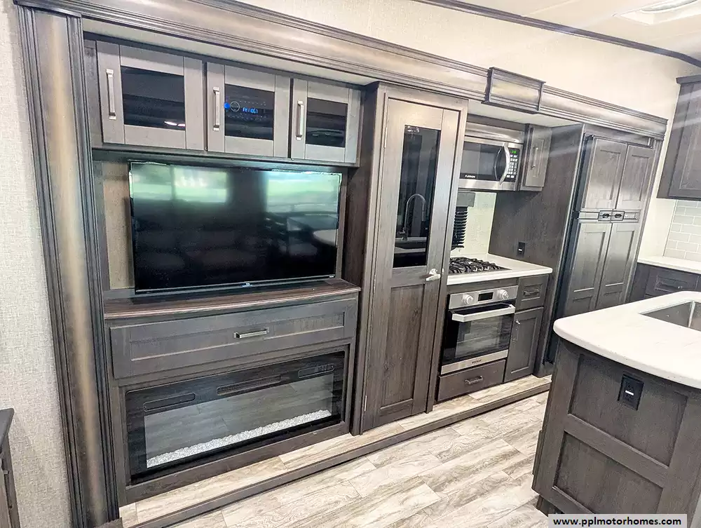 Outside, convenience meets entertainment with an automatic main awning, exterior speakers, and a handy outside shower. Setting up your site is simple and efficient thanks to the integrated electric landing gear, allowing you more time to relax and enjoy the two included TVs. This model has earned a stellar reputation for its smart storage solutions and reliable performance, making it a premier choice for travelers who want the comforts of home while exploring the open road.