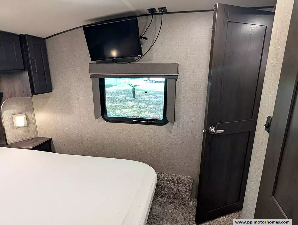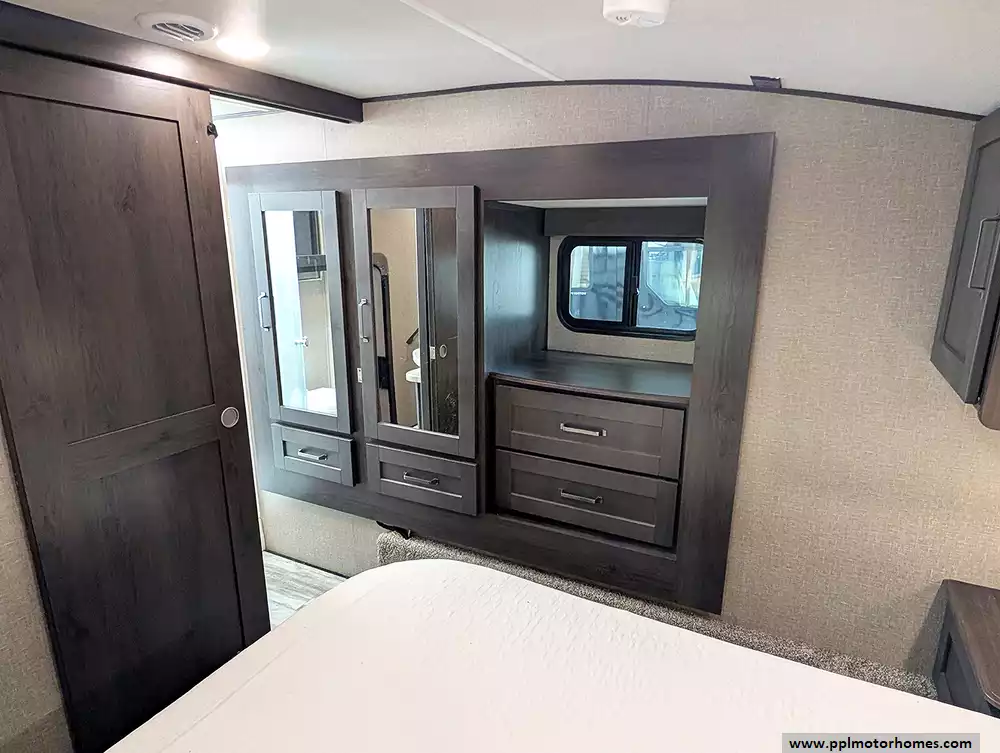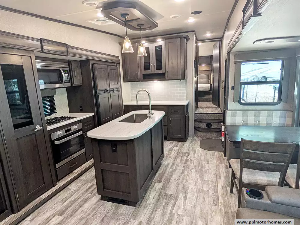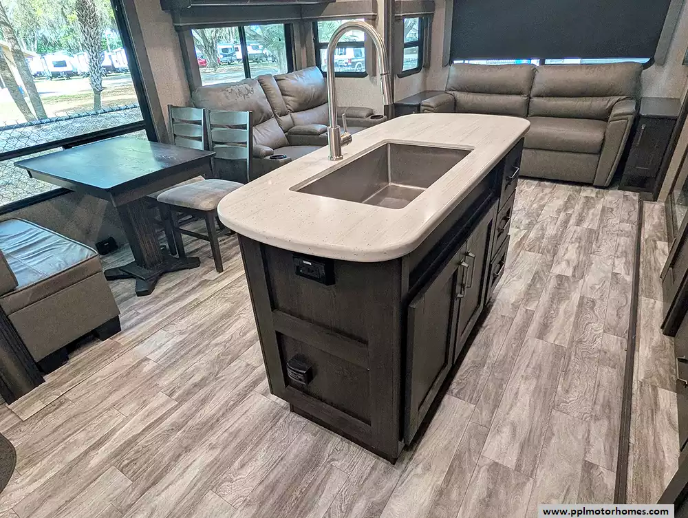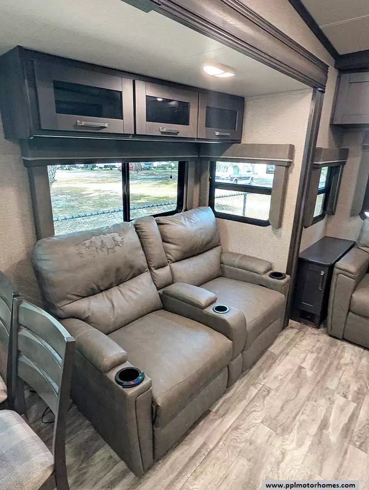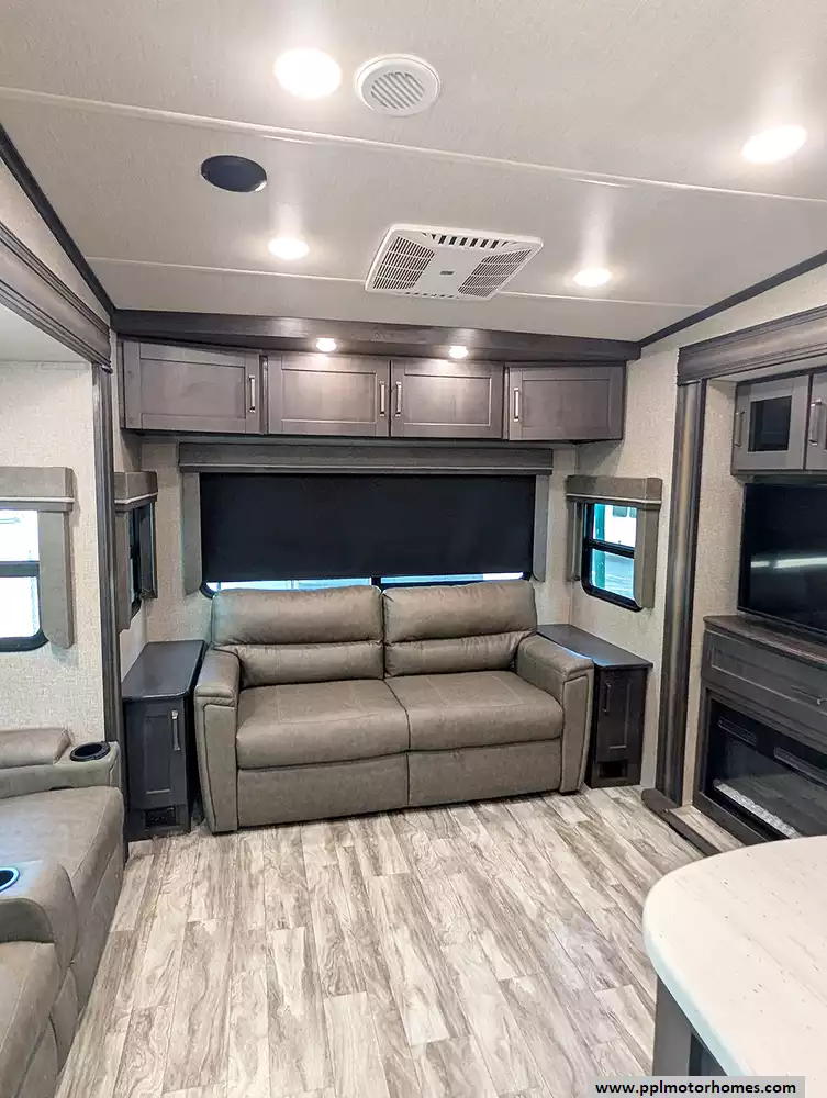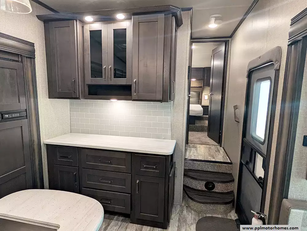 Outside, convenience meets entertainment with an automatic main awning, exterior speakers, and a handy outside shower. Setting up your site is simple and efficient thanks to the integrated electric landing gear, allowing you more time to relax and enjoy the two included TVs. This model has earned a stellar reputation for its smart storage solutions and reliable performance, making it a premier choice for travelers who want the comforts of home while exploring the open road.