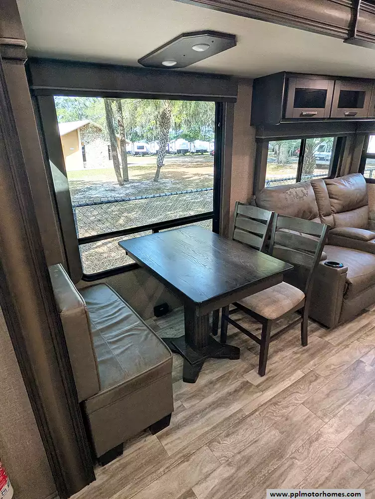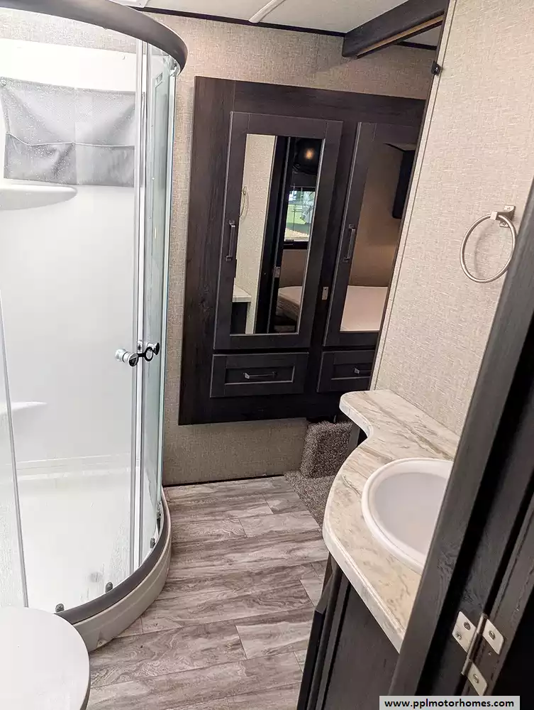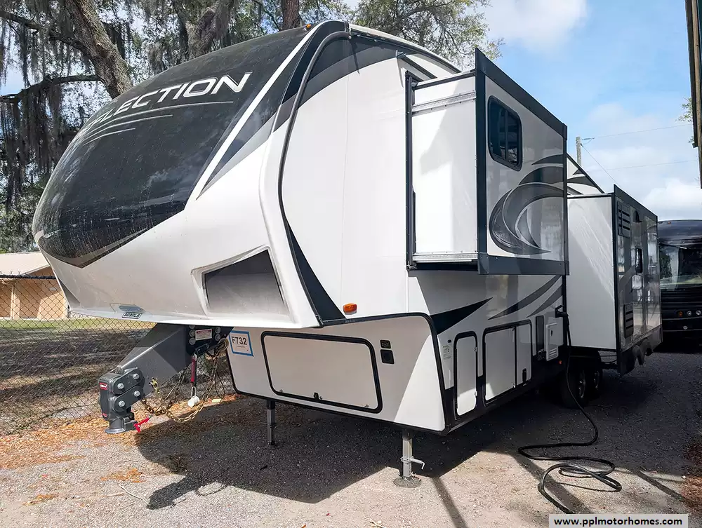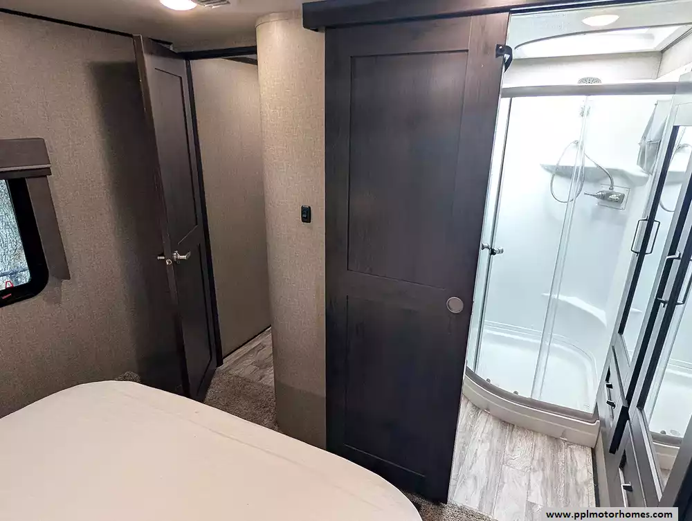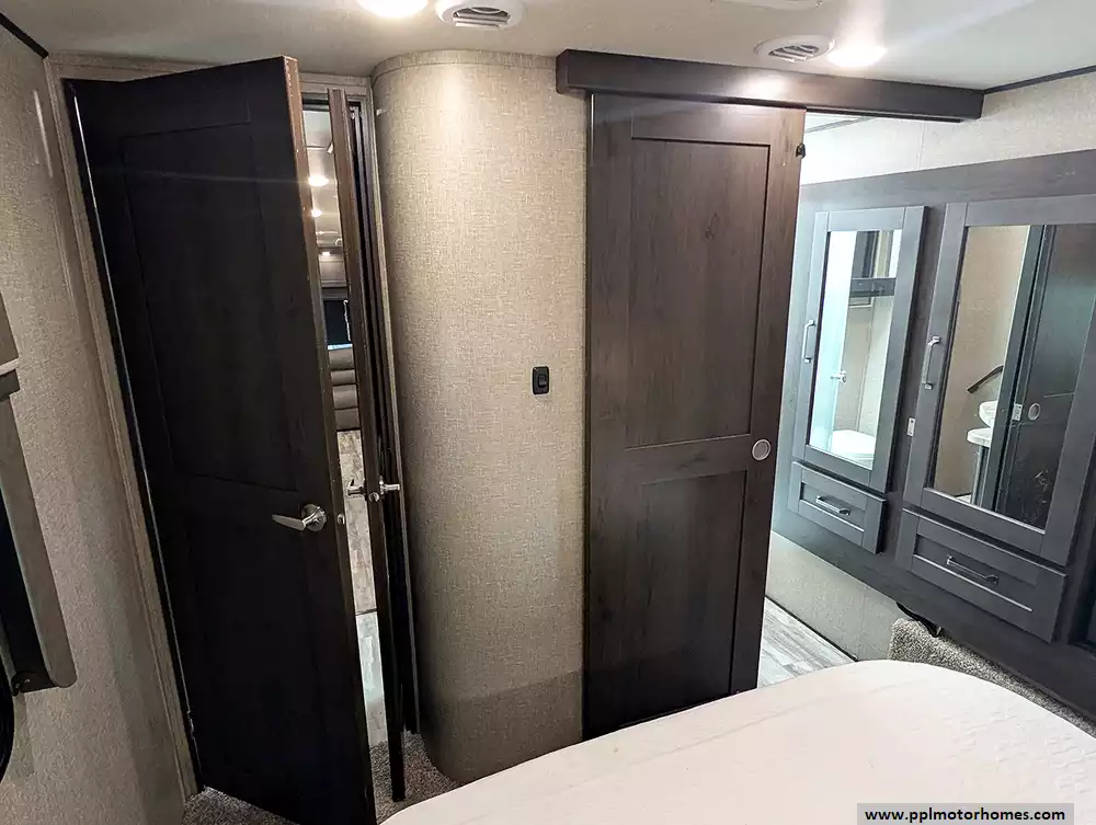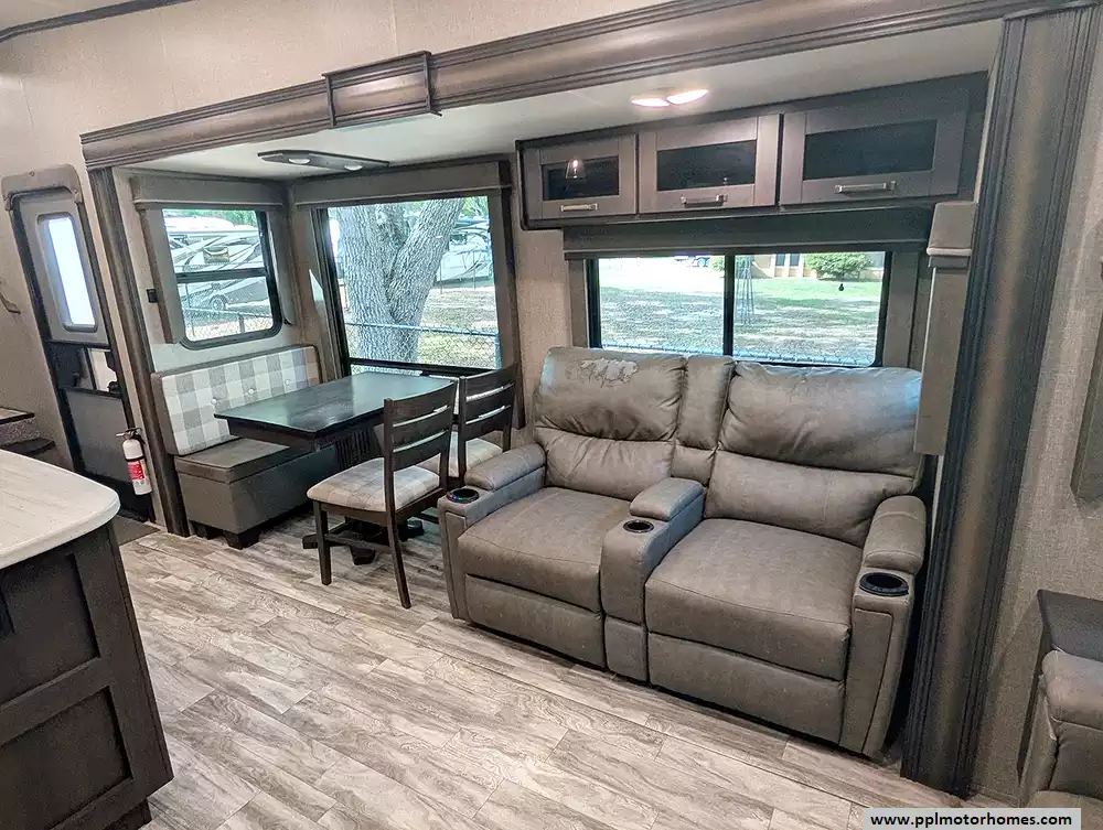 Outside, convenience meets entertainment with an automatic main awning, exterior speakers, and a handy outside shower. Setting up your site is simple and efficient thanks to the integrated electric landing gear, allowing you more time to relax and enjoy the two included TVs. This model has earned a stellar reputation for its smart storage solutions and reliable performance, making it a premier choice for travelers who want the comforts of home while exploring the open road.