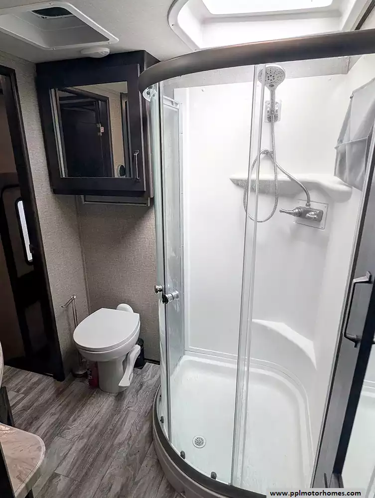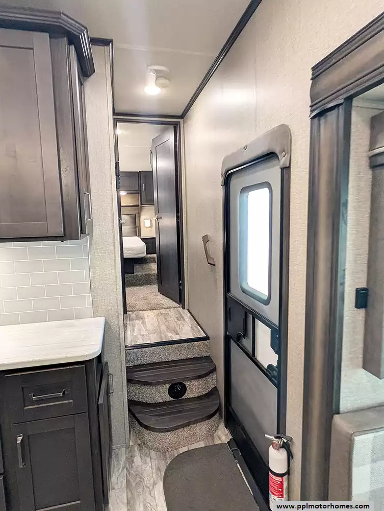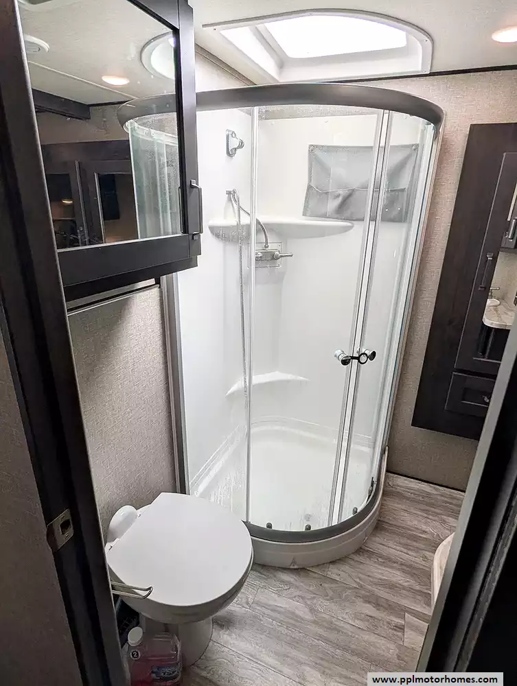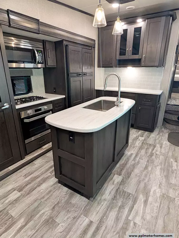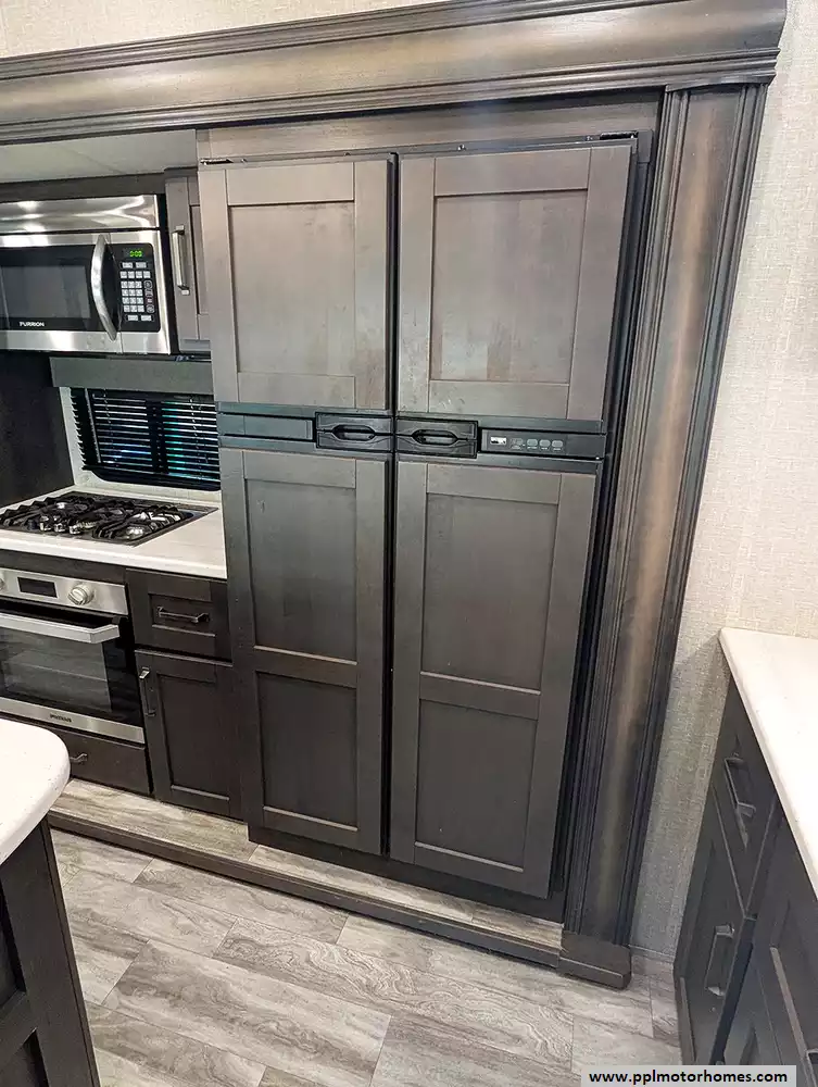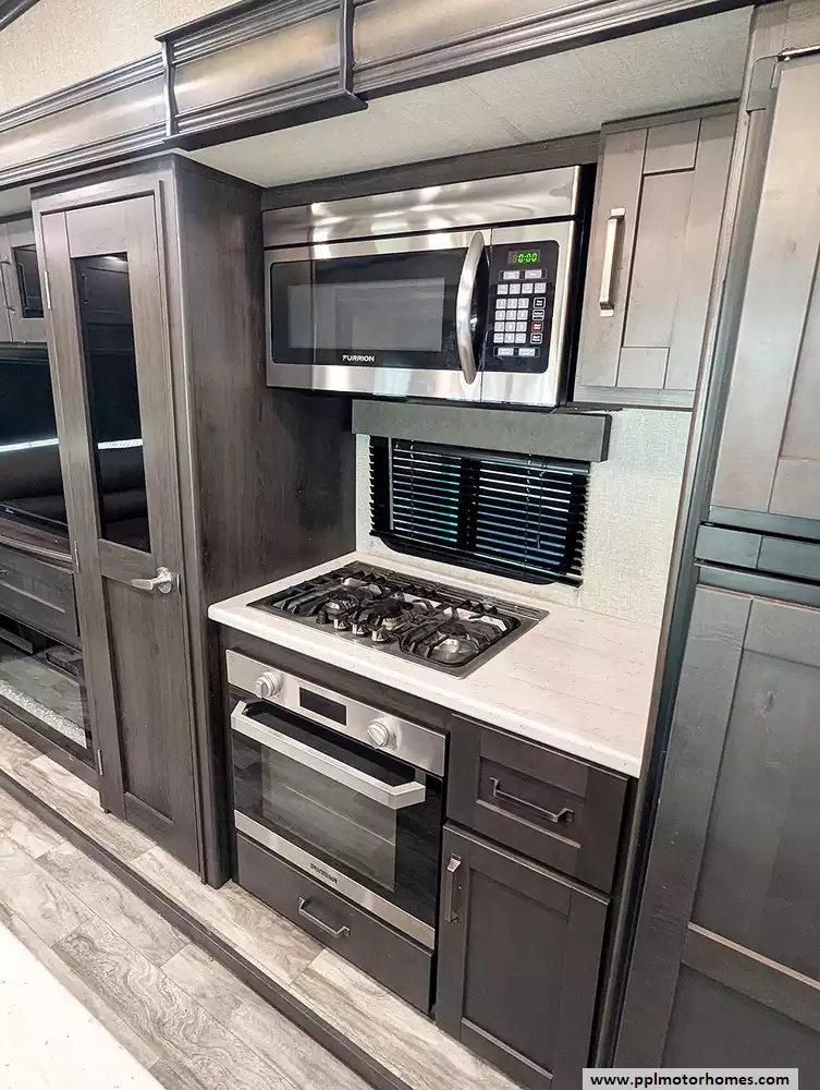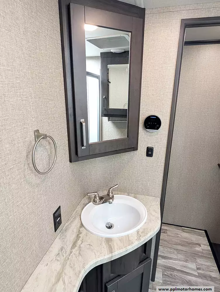 Outside, convenience meets entertainment with an automatic main awning, exterior speakers, and a handy outside shower. Setting up your site is simple and efficient thanks to the integrated electric landing gear, allowing you more time to relax and enjoy the two included TVs. This model has earned a stellar reputation for its smart storage solutions and reliable performance, making it a premier choice for travelers who want the comforts of home while exploring the open road.
