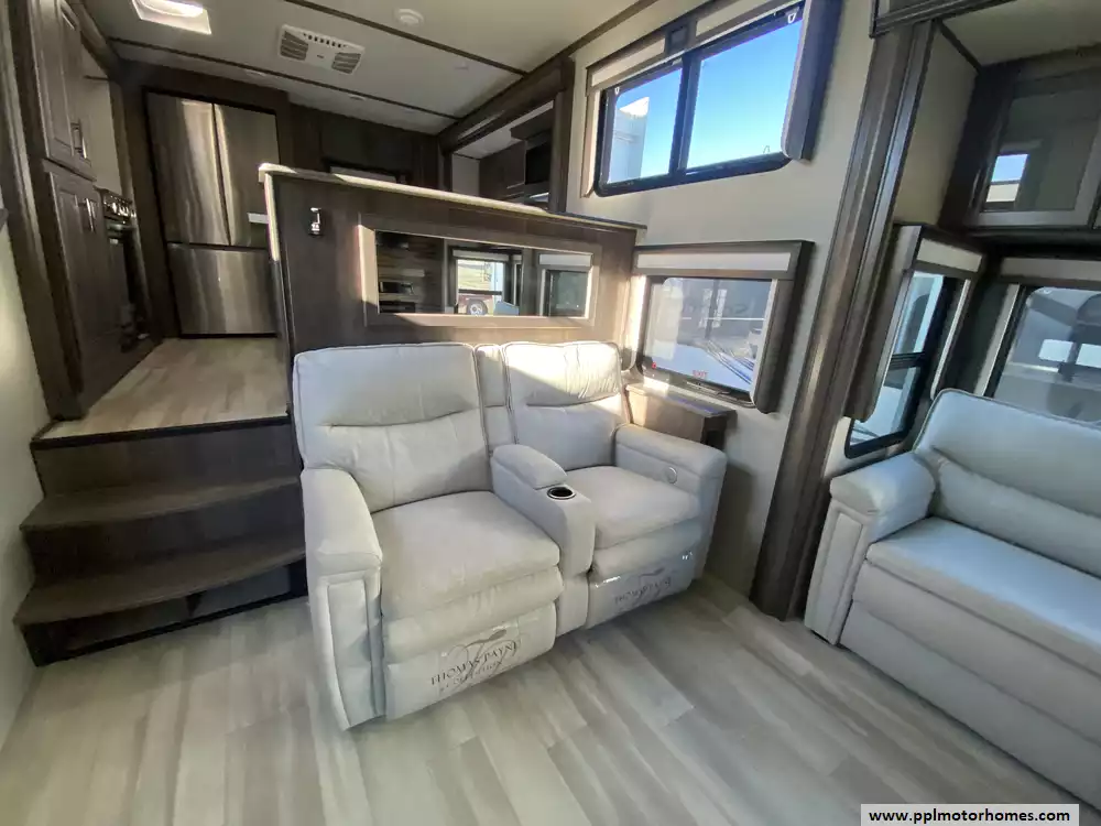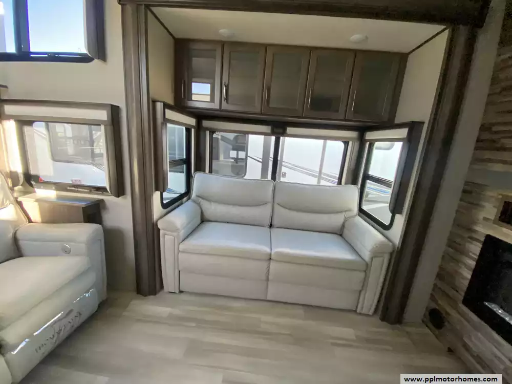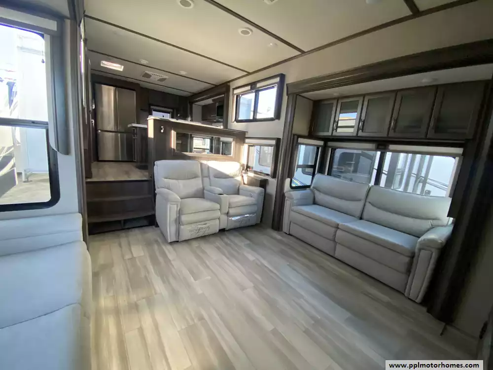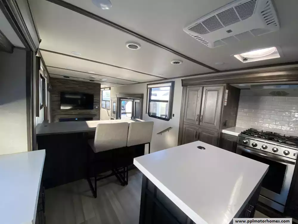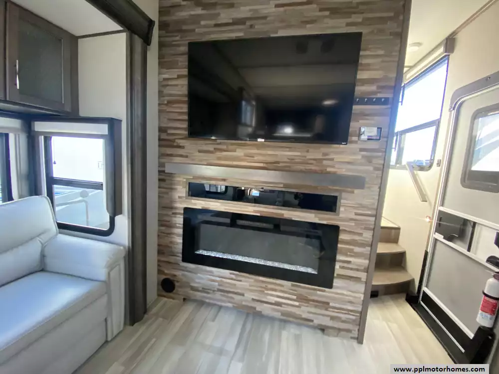 This 2022 Solitiude 390RK has a Hydraulic Landing Gear, 5 Slide-outs, 2 Ducted Air Conditioners, Double Door 110v Residential Samsung Refrigerator, In-Fridge Ice Maker, Automatic Main Awning, Washer/Dryer Connections, Solar Panels, Outside Speakers, 2 TVs, Outside Shower, Fireplace, Microwave, 4 Burner Range, Oven, 2200W of Solar Panels, 2600W of Batteries and a Victron Solar Control/Inverter System