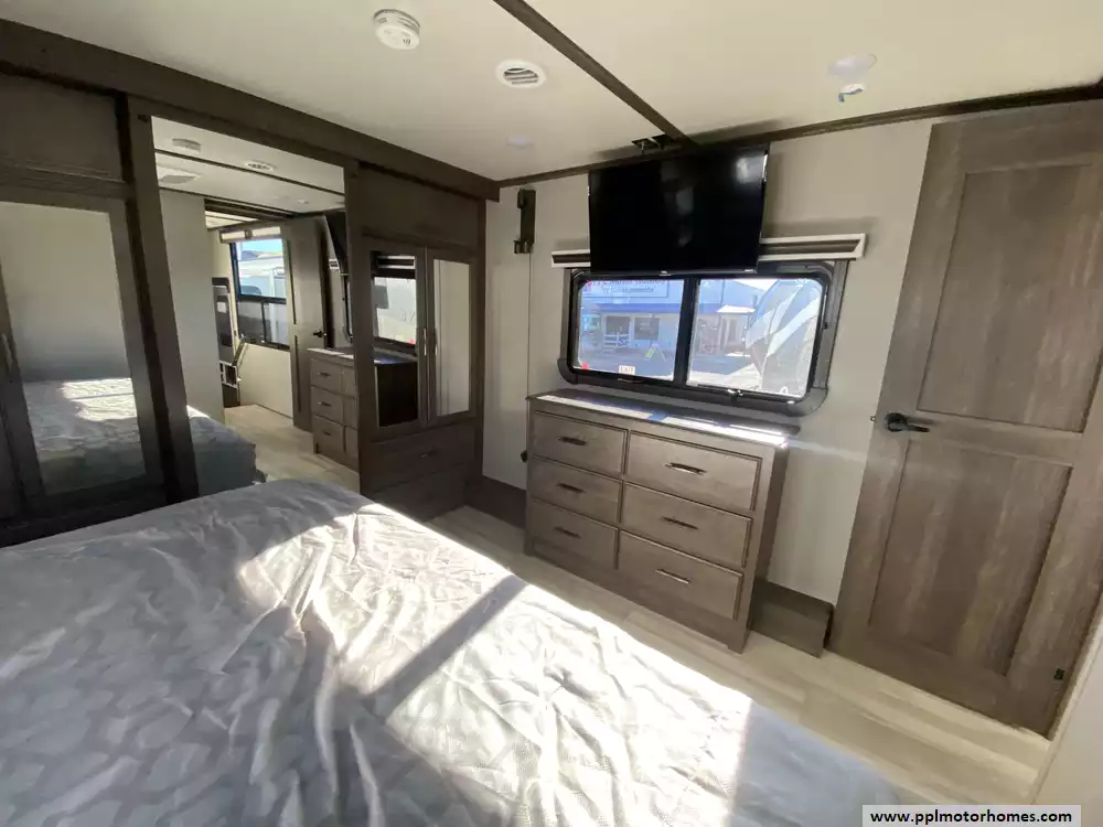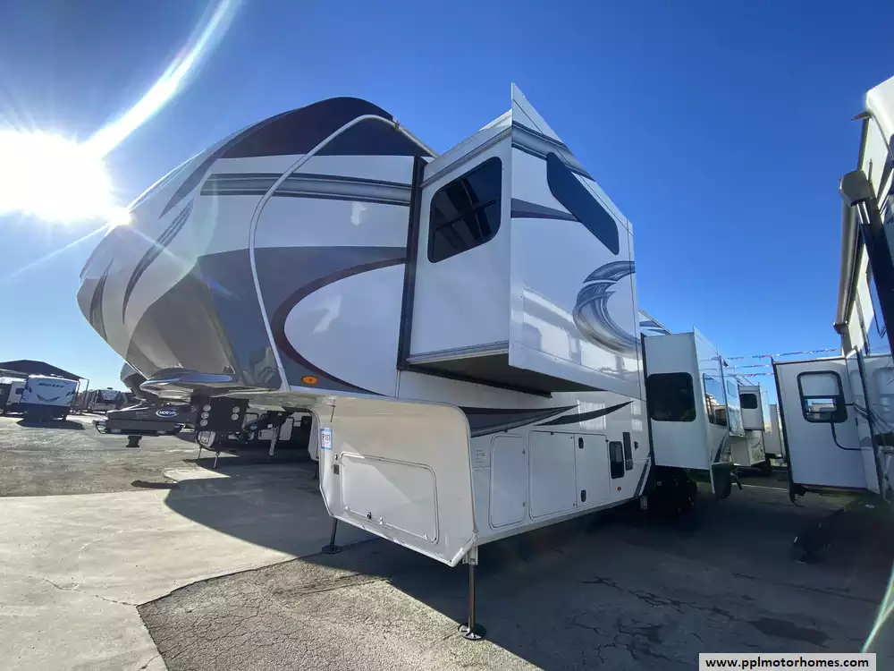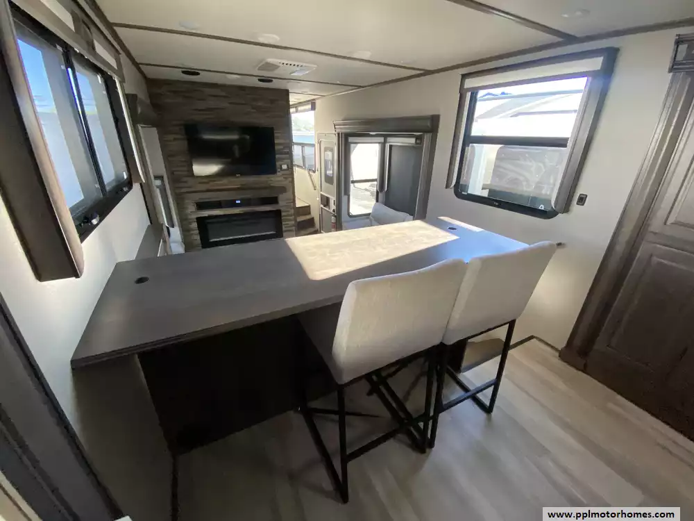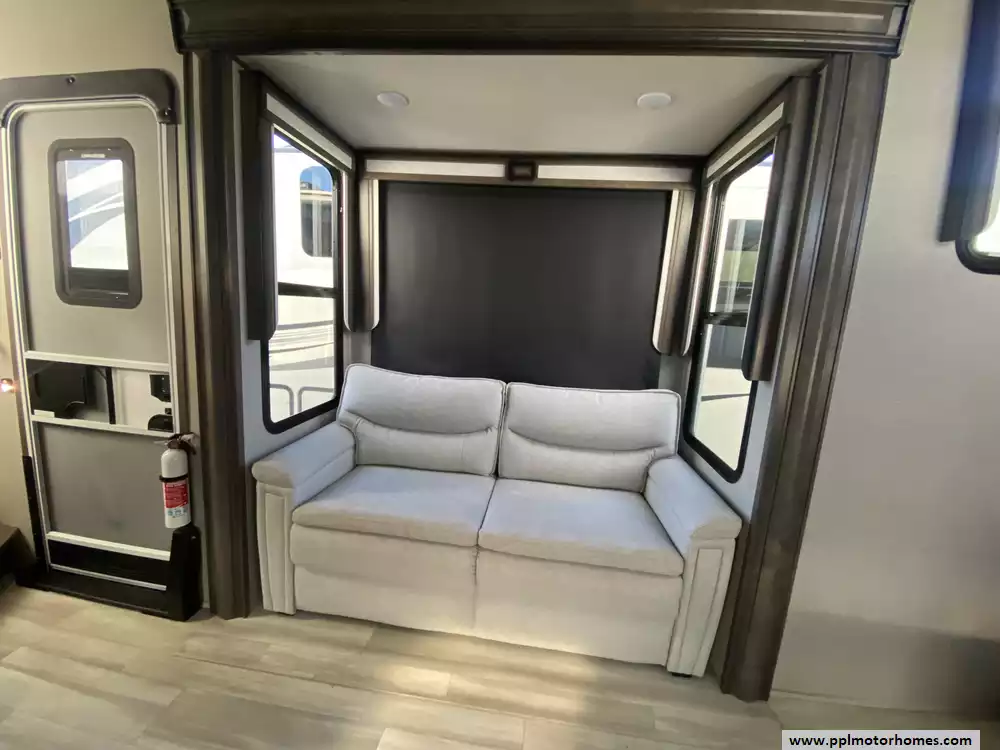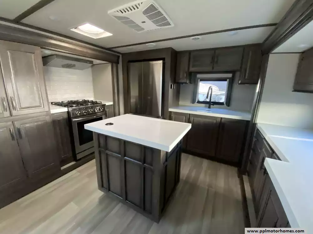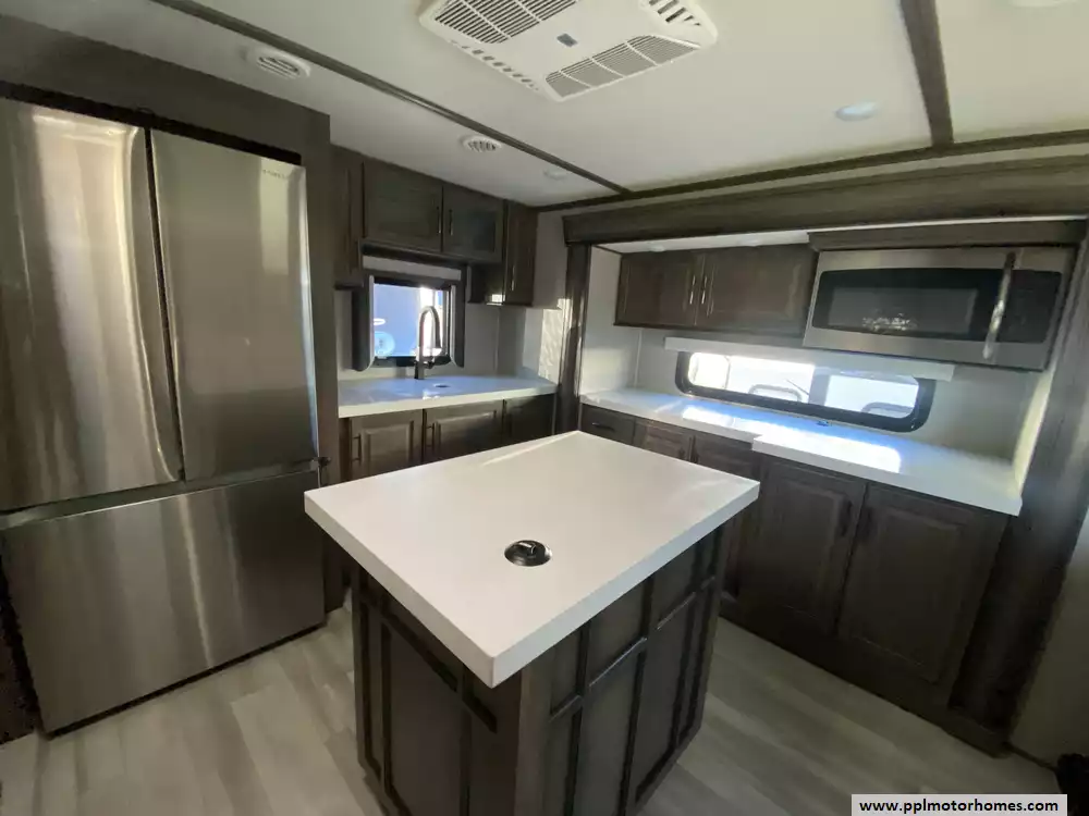 This 2022 Solitiude 390RK has a Hydraulic Landing Gear, 5 Slide-outs, 2 Ducted Air Conditioners, Double Door 110v Residential Samsung Refrigerator, In-Fridge Ice Maker, Automatic Main Awning, Washer/Dryer Connections, Solar Panels, Outside Speakers, 2 TVs, Outside Shower, Fireplace, Microwave, 4 Burner Range, Oven, 2200W of Solar Panels, 2600W of Batteries and a Victron Solar Control/Inverter System
