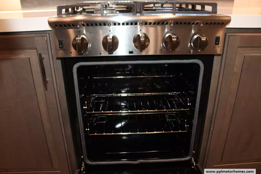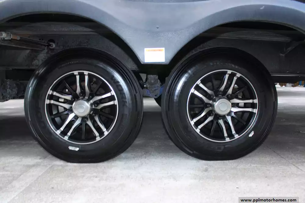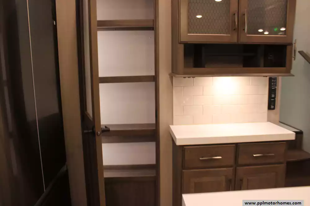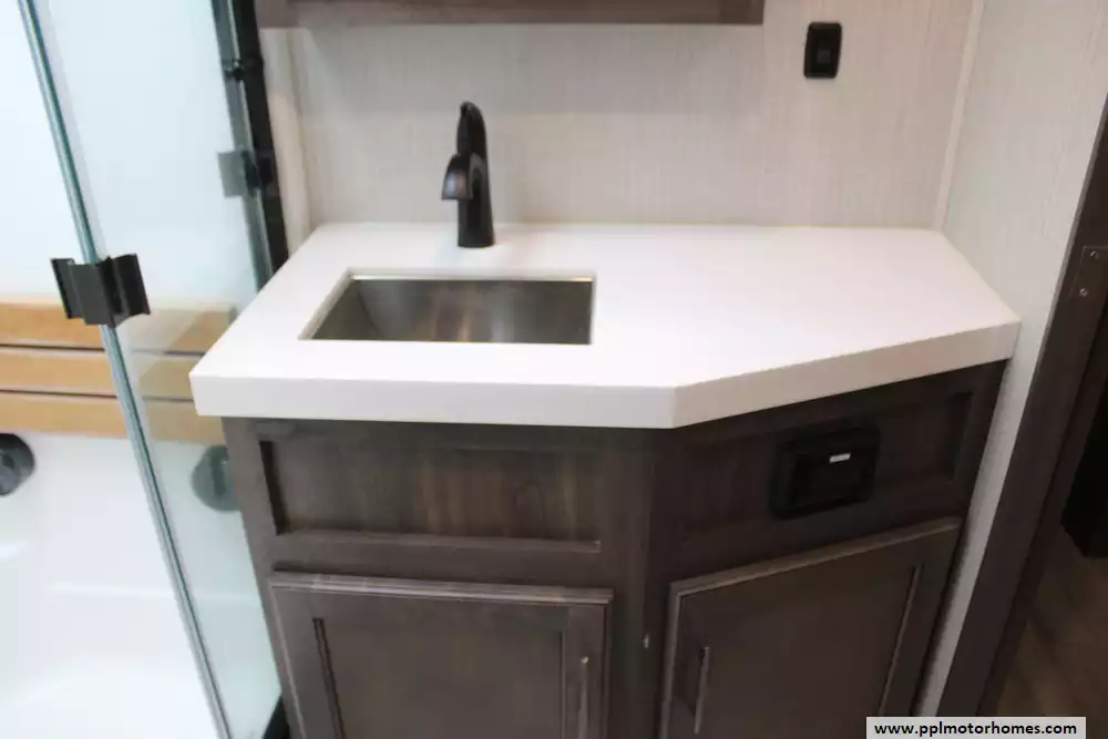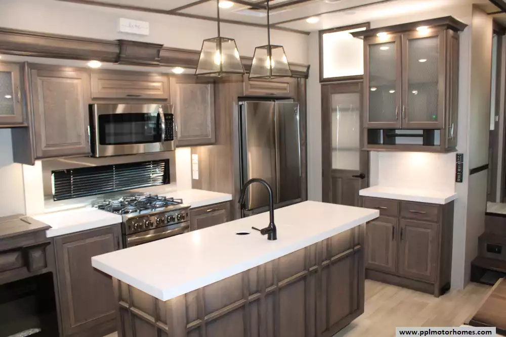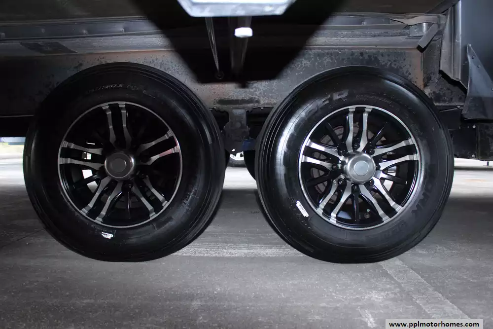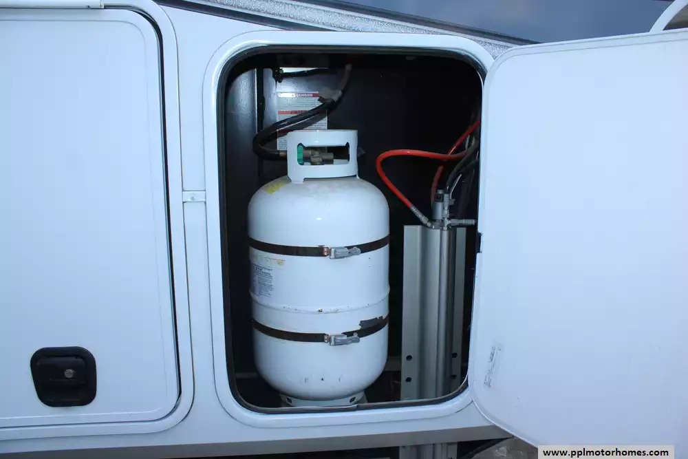 Specs: Length: 34.11 ft., Width: 8.5 ft., Height: 13.5 ft., Interior Height: 8.08 ft., Total Fresh Water Tank Capacity: 93 gal., Total Gray Water Tank Capacity: 100 gal., Total Black Water Tank Capacity: 50 gal., Total Propane Tanks: 2, Total Propane Tank Capacity: 60 lbs.