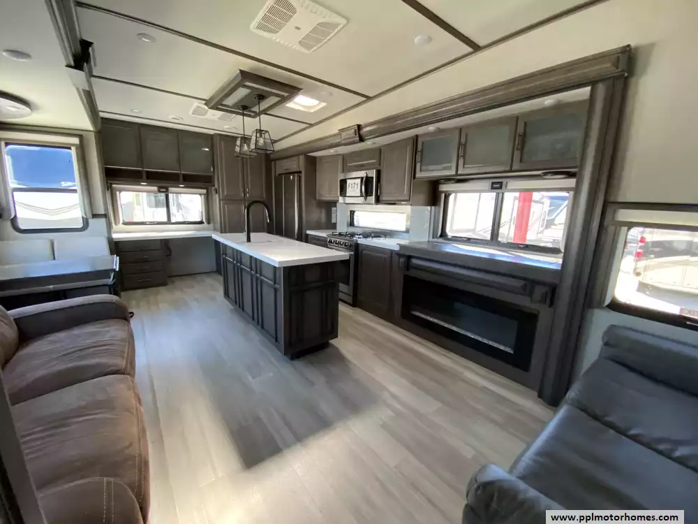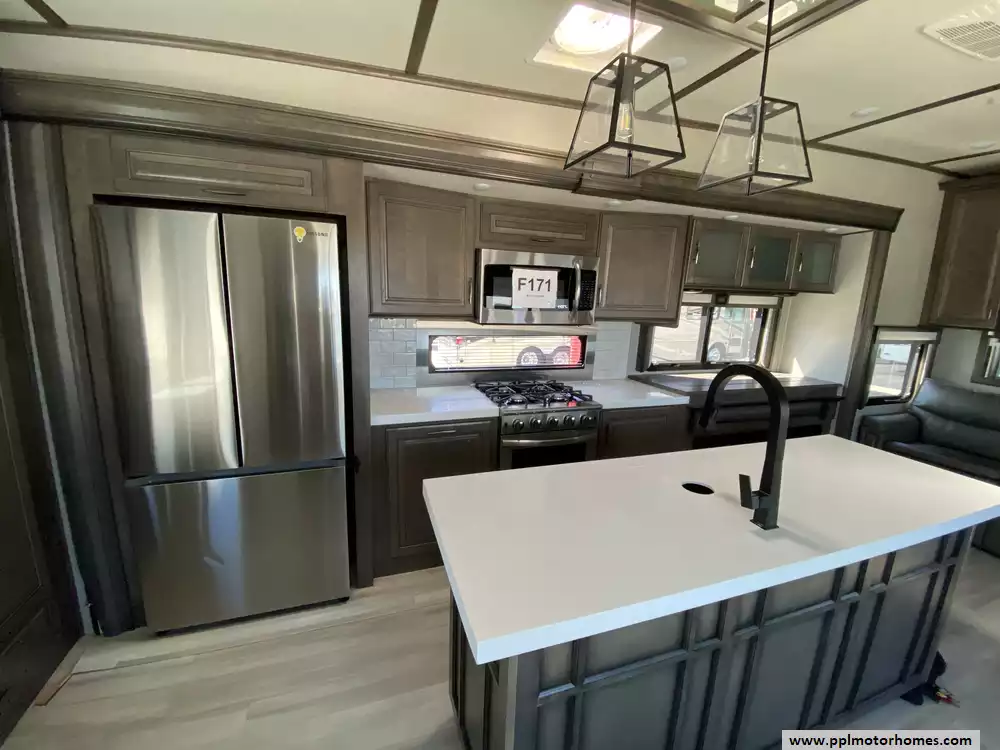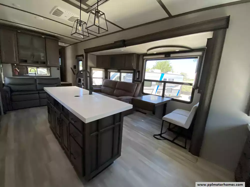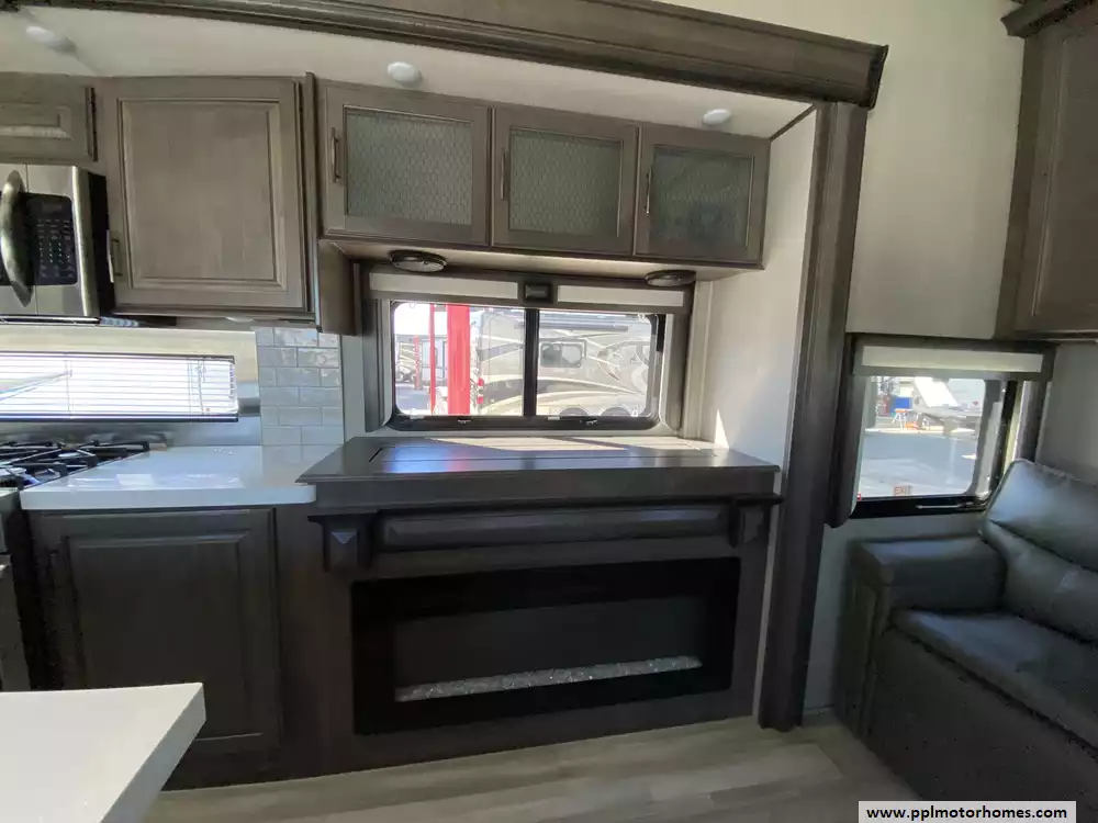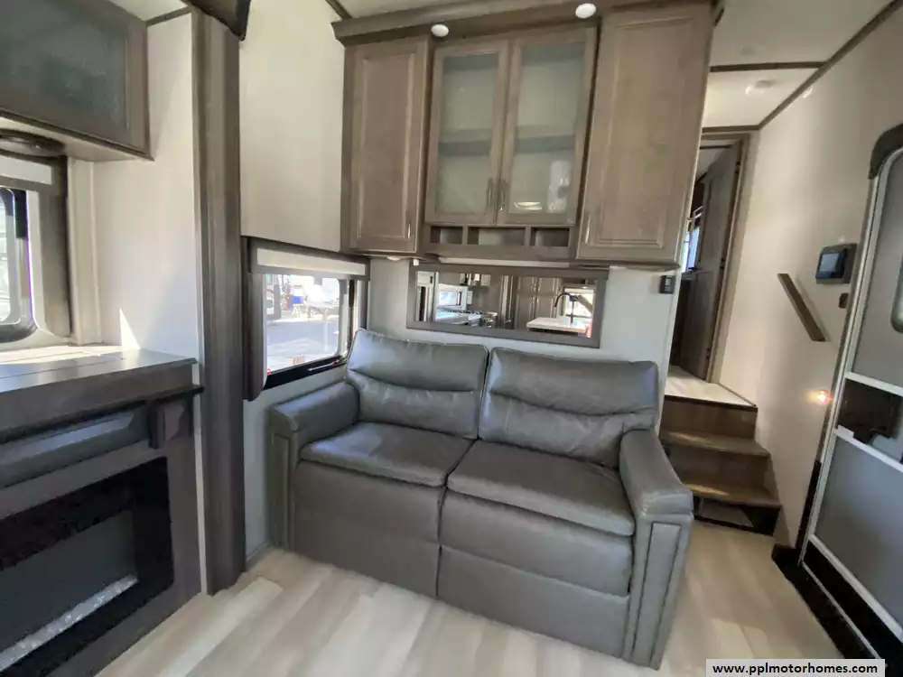 This 2022 Solitude 345GK has a Hydraulic Landing Gear, 3 Slide-outs, 3 Ducted Air Conditioners, Double Door Residential Samsung Refrigerator, In-Fridge Ice Maker, Automatic Main Awning, Washer/Dryer Connections, Solar Panel, Outside Speakers, 2 TVs, Outside Shower, Fireplace, Convection Microwave, 4 Burner Range, Oven
