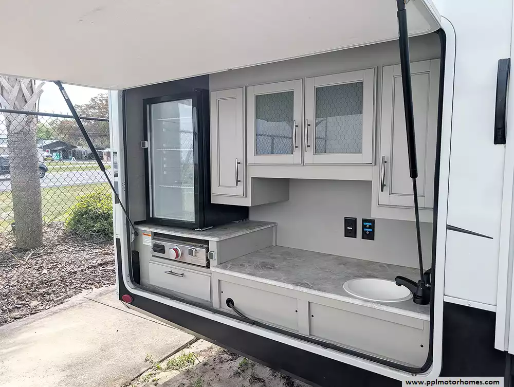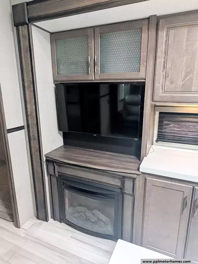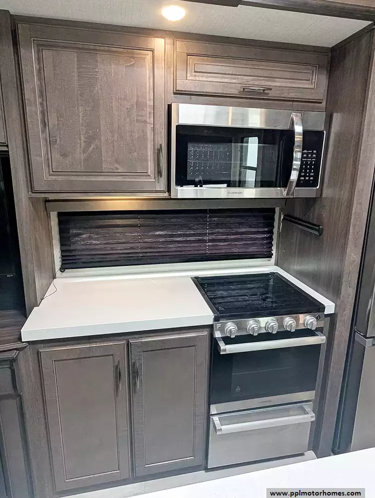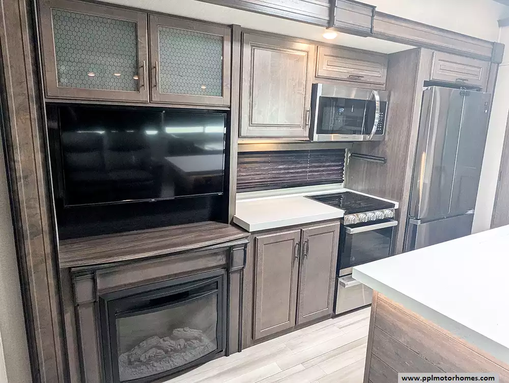 This premium coach is fully loaded for modern convenience and off-grid versatility, featuring an Onan propane generator and electric landing gear for effortless setup. The professional-grade kitchen is equipped with a residential GE refrigerator with an in-fridge ice maker, a convection microwave, a three-burner range, and an oven, all situated near a cozy fireplace and an onboard washer/dryer. Entertainment is seamless with two TVs, a satellite receiver, and an expansive outdoor living area featuring an outdoor kitchen, outside speakers, and an automatic main awning complemented by additional window and slide awnings. Complete with an outside shower and high-end finishes throughout, this Solitude is ready to serve as your ultimate sanctuary on the open road.