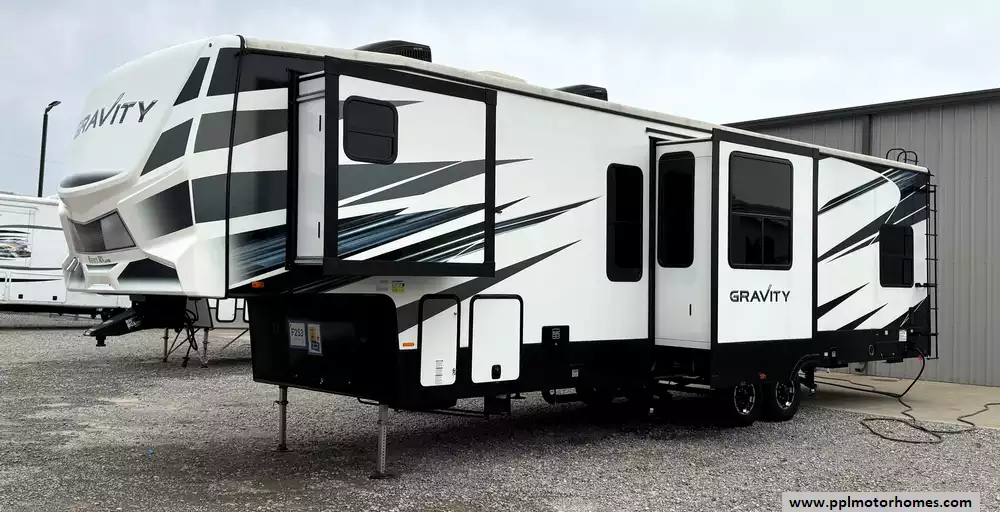 This 2022 Gravity M-3550 has an Electric Landing Gear, 3 Slide-outs, 2 Ducted Air Conditioners, Double Door Gas/110v Dometic Refrigerator, Automatic Main Awning, Solar Panel, Outside Speakers, 2 TVs, Convection Microwave, 3 Burner Range, Oven