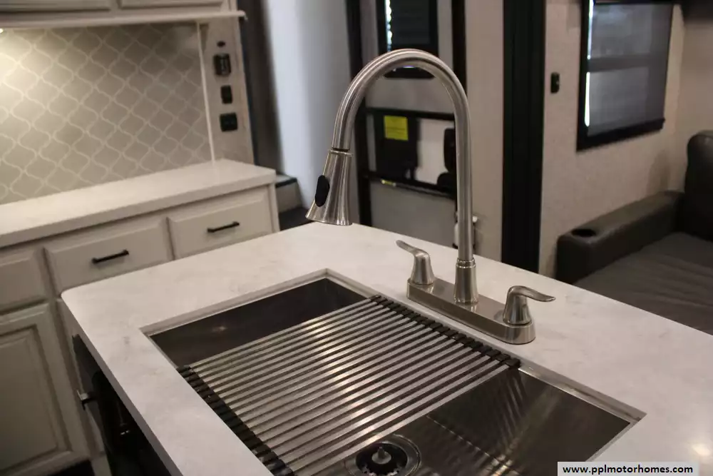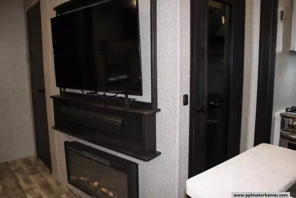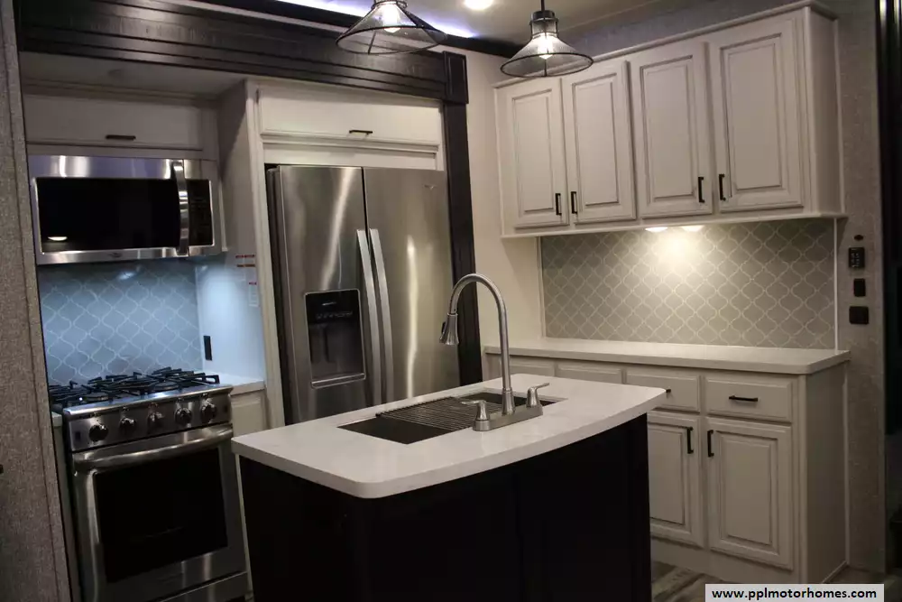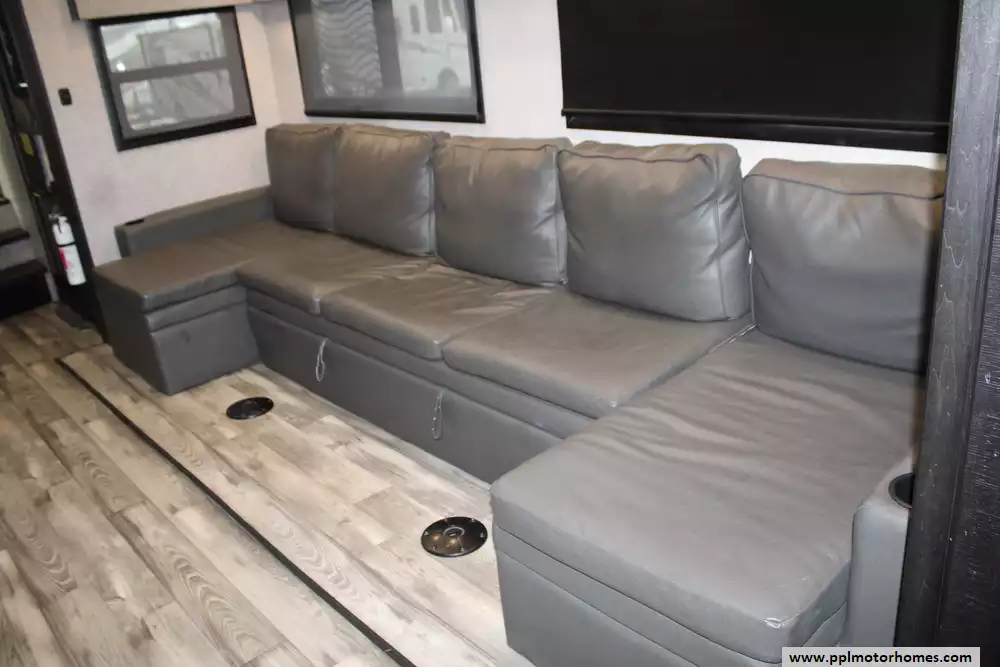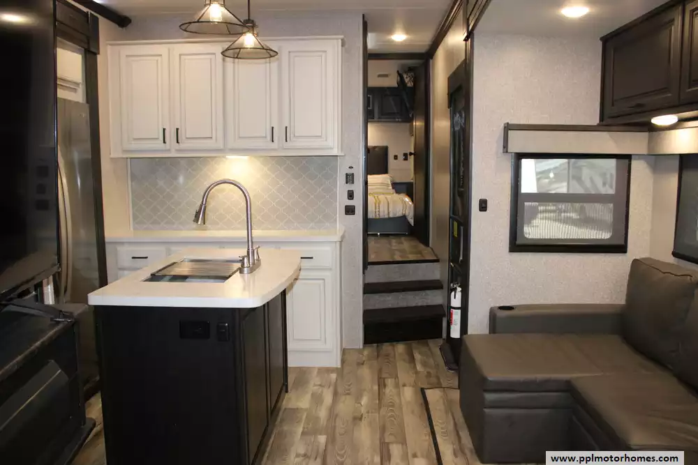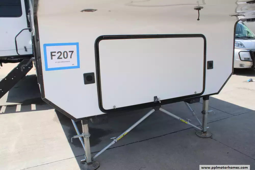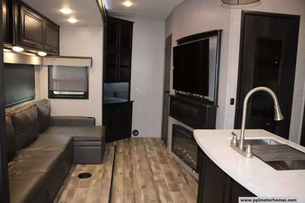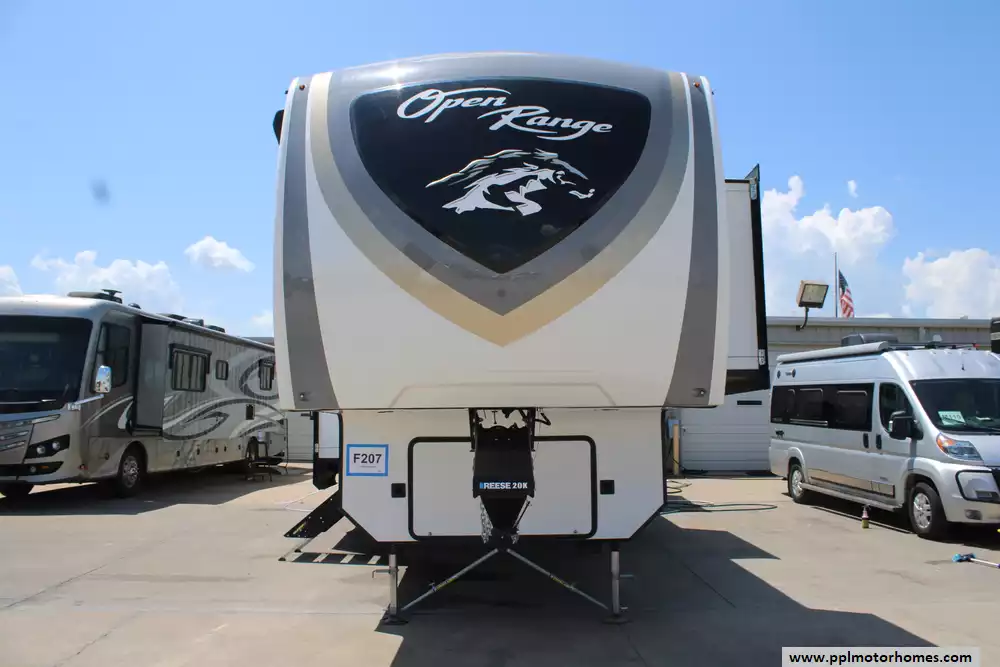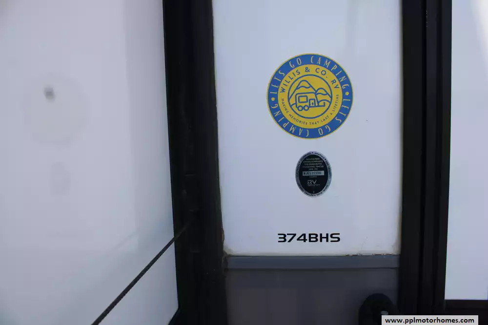 The 2022 Highland Ridge Open Range 374BHS is a robust mid-size fifth-wheel RV offering a spacious interior with four power slide-outs, and boasting a comfortable sleeping capacity. With a dry weight around 12,520 lb, GVWR of 15,500 lb, and payload capacity of nearly 3,000 lb, it balances towing manageability with strong load-bearing capability. The dual-awning exterior covers over 26 ft of outdoor living space and includes a fully equipped exterior kitchen. Inside, you'll find a bath and a half, a front master suite, a rear bunkhouse, and a central living, kitchen area complete with a full-size fridge, four-burner stove with convection microwave, U-lounge/sleeper, and entertainment features, including Wi-Fi capability and mobile app instrumentation. Luxurious touches like the "LevelLoc" automatic leveling system, ACCU-SLIDE compression slide-outs, and Four-Season package make this a smart choice for serious travelers seeking comfort, durability, and high functionality on the road.