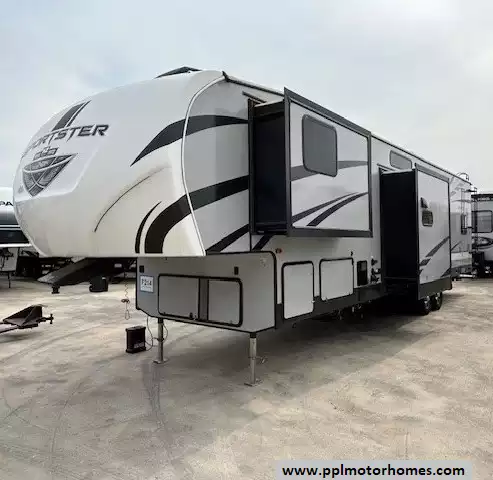 This 2022 Sportster Toy Hauler 353TH13 has an Electric Landing Gear, 3 Slide-outs, 2 Ducted Air Conditioners, Double Door 12v Furrion Refrigerator, Automatic Main Awning, Washer/Dryer Connections, Outside Speakers, TV, Outside Shower, Fireplace, Microwave, 3 Burner Range, Oven, with Fuel Station