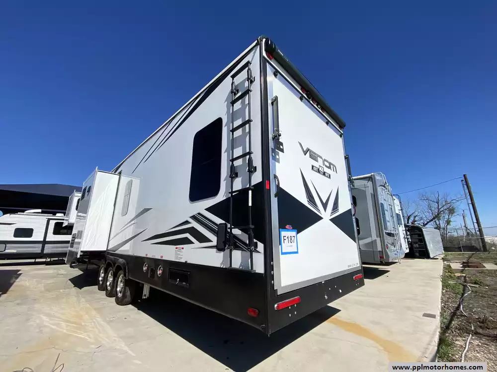 Experience the pinnacle of luxury toy haulers with this 2022 Venom 4013TK, a model renowned for its massive 101-inch wide-body construction and industry-leading all-weather performance. Built with a durable fiberglass body and a TPO roof, this fifth wheel is celebrated for its rugged 6-sided aluminum framing and high-end residential finishes that have earned the Venom series a reputation for superior quality and long-term reliability. Whether you are hauling gear to remote locations or hosting at the campground, this three-slide-out floorplan provides an expansive, temperature-controlled environment designed for true four-season living.